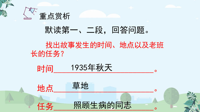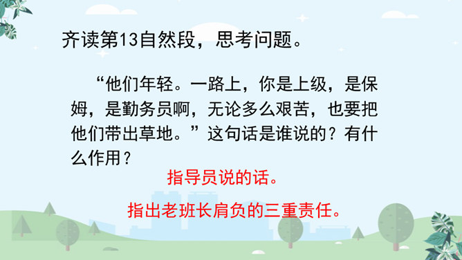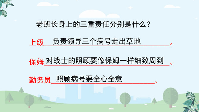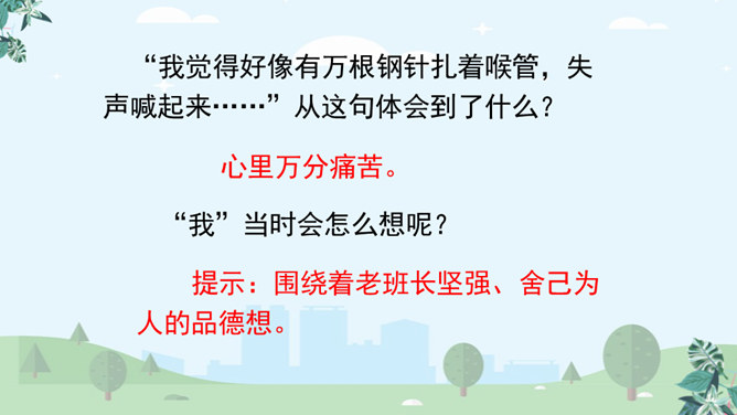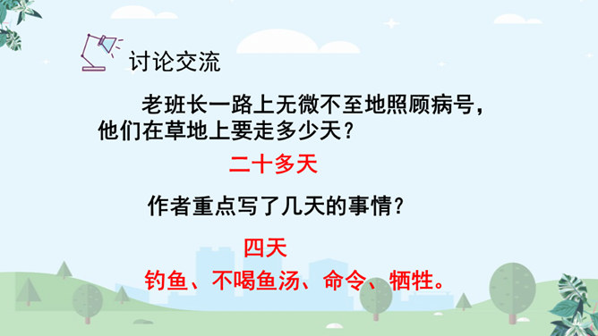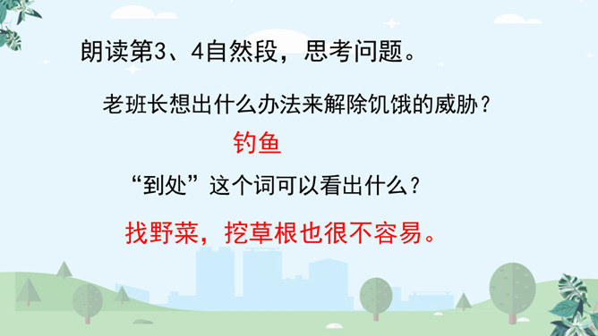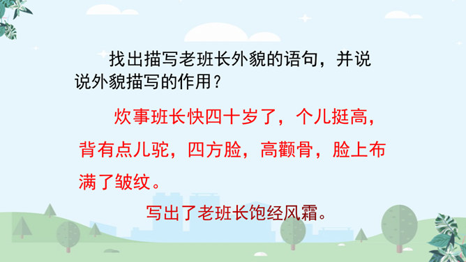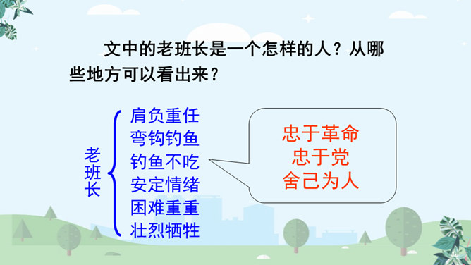 找出描写老班长外貌的语句,并说说外貌描写的作用? 老班长想出什么办法来解除饥饿的威胁?钓鱼。“到处”这个词可以看出什么?找野菜,挖草根也很不容易。老班长“整夜整夜地合不拢眼”说明了什么?说明了老班长担心我们的身体,心情沉重,也反映了他高度的责任感。老班长为什么会“喜出望外”?“喜出望外”这个词体现了什么?因为老班长经常考虑我们的身体状况,所以才会喜出望外,立刻想到钓鱼给病号补充营养。所属专题:金色的鱼钩ppt。