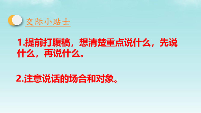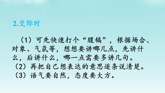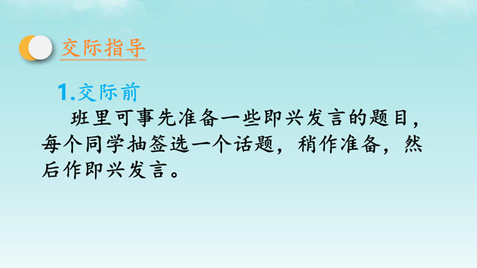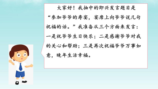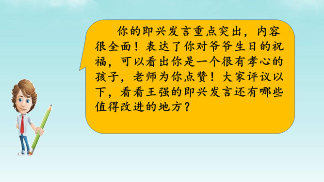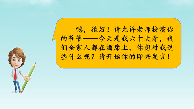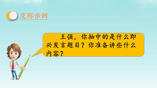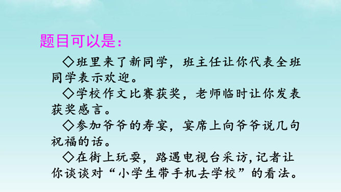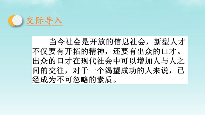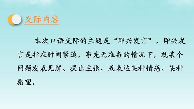 当今社会是开放的信息社会,新型人才不仅要有开拓的精神,还要有出众的口才。出众的口才在现代社会中可以增加人与人之间的交往,对于一个渴望成功的人来说,已经成为不可忽略的素质。即兴发言需要我们快速组织语言,临场发挥,所以发言的时候不但要做到有条不紊,重点突出,而且还要做到注意场合,关注听话的对象,做到举止大方,文明礼貌,这样才会给人留下良好的印象。所属专题:即兴发言ppt。