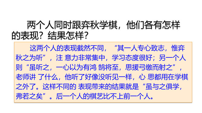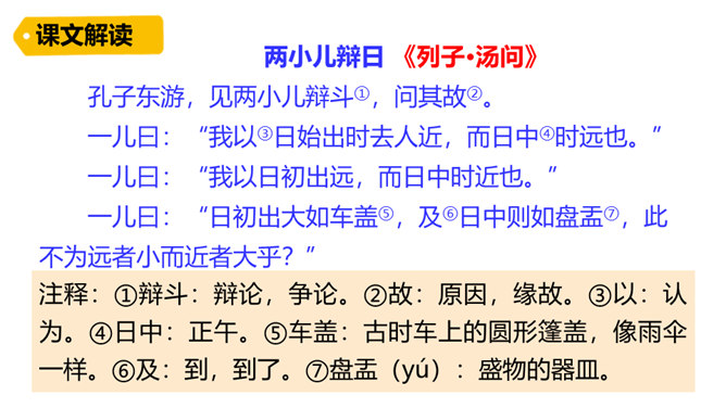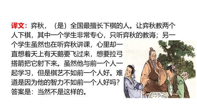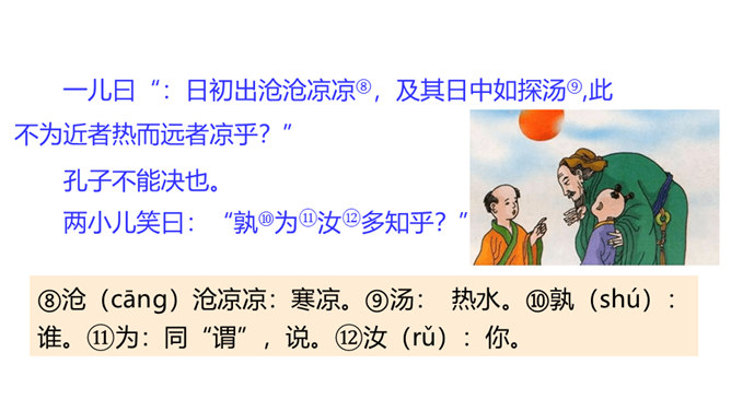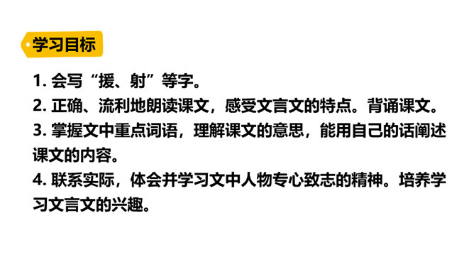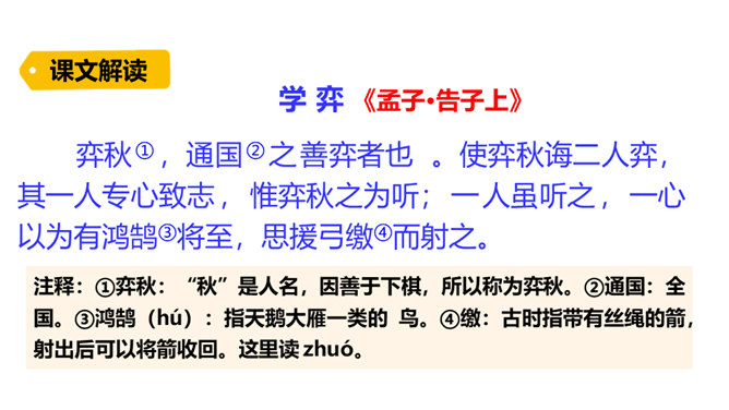 同学们,你们会下棋吗?你们观察过每天东升西落的太阳吗?今天我们要学习的两则文言文,就与这两种事物有关,一起来欣赏下吧!1. 会写“援、射”等字。2. 正确、流利地朗读课文,感受文言文的特点。背诵课文。3. 掌握文中重点词语,理解课文的意思,能用自己的话阐述课文的内容。4. 联系实际,体会并学习文中人物专心致志的精神。培养学习文言文的兴趣。阅读文言文,感受文言文特点,圈出本课生字、生词。用自己的话讲述课文内容。