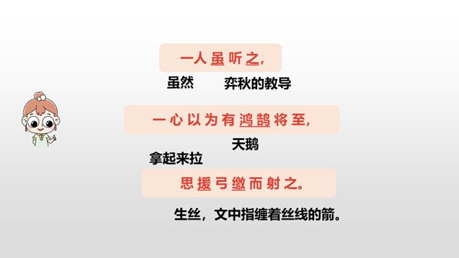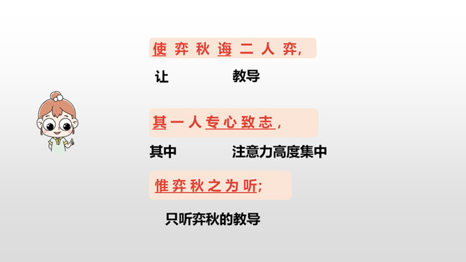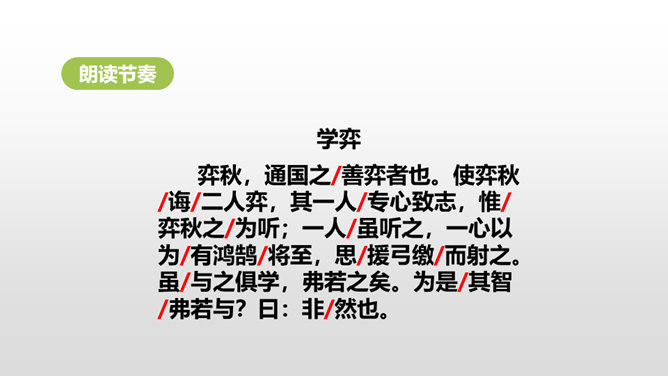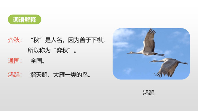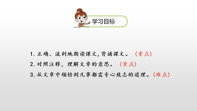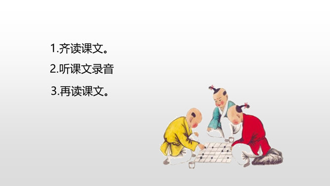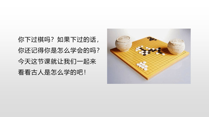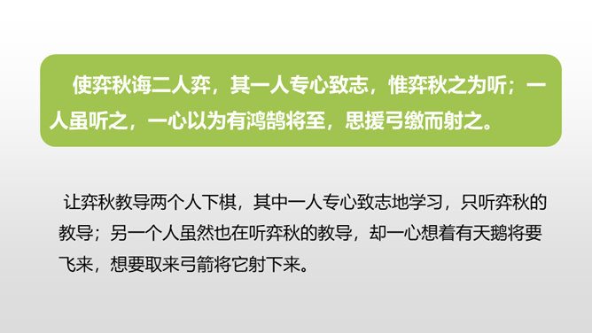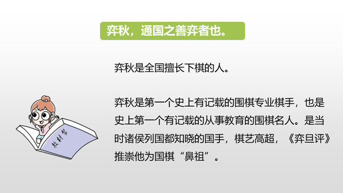 1.正确、流利地朗读课文,背诵课文。 (重点)2.对照注释,理解文章的意思。 (重点)3.从文章中领悟到凡事都需专心致志的道理。(难点)你下过棋吗?如果下过的话,你还记得你是怎么学会的吗?今天这节课就让我们一起来看看古人是怎么学的吧!弈秋是第一个史上有记载的围棋专业棋手,也是史上第一个有记载的从事教育的围棋名人。两个人的做法有什么不同呢?猜一猜,两人最终的学习结果相同吗?所属专题:学弈ppt。