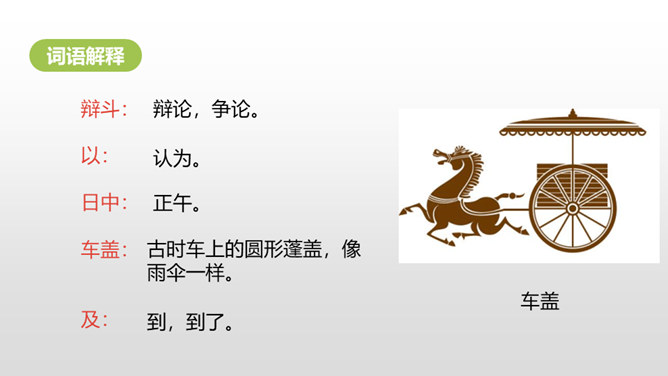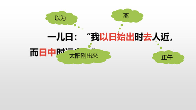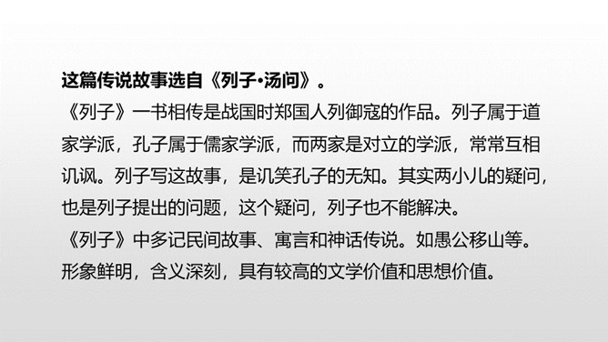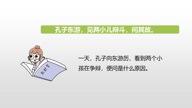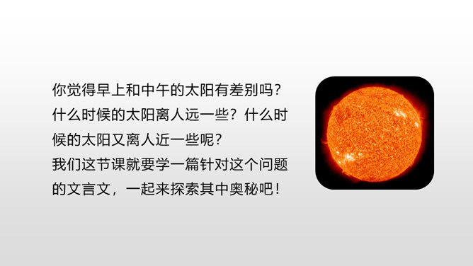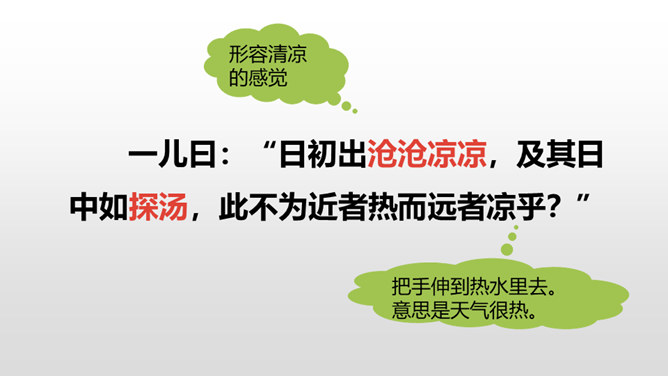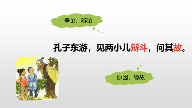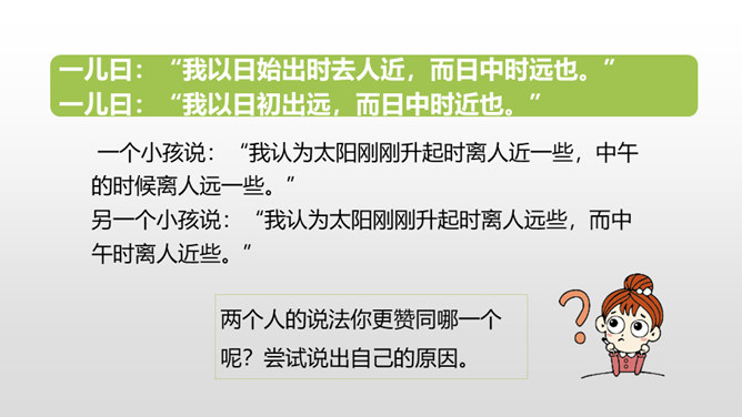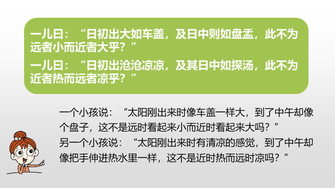 1.正确、流利地朗读课文。背诵课文。 (重点)2.对照注释,理解文章的意思。 (重点)3.从文章中领悟到知识无穷、学无止境的道理。(难点)你觉得早上和中午的太阳有差别吗?什么时候的太阳离人远一些?什么时候的太阳又离人近一些呢?我们这节课就要学一篇针对这个问题的文言文,一起来探索其中奥秘吧!两个人的说法你更赞同哪一个呢?尝试说出自己的原因。孔子答不出来,他的态度是怎样的?你赞同孔子的行为吗?所属专题:两小儿辩日ppt。