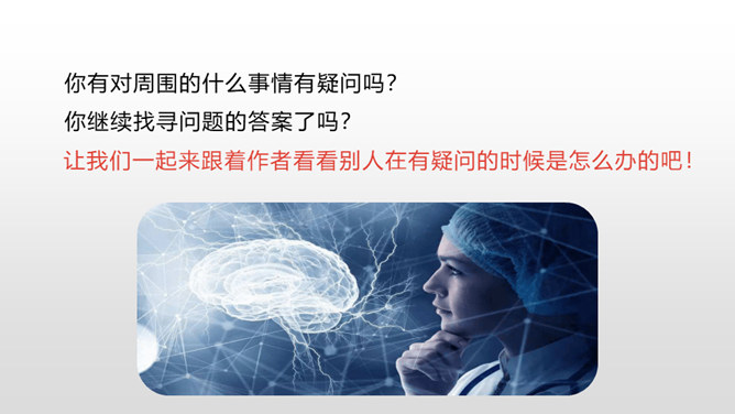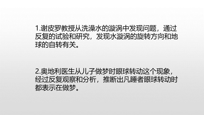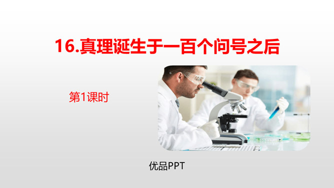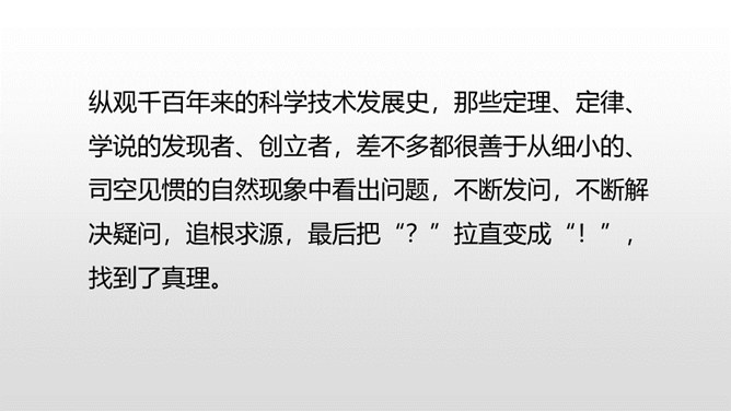 1.学习本课生字词,正确、流利地朗读课文。 (重点)2.学会这篇课文里的生字词。 (重点)你有对周围的什么事情有疑问吗?你继续找寻问题的答案了吗?让我们一起来跟着作者看看别人在有疑问的时候是怎么办的吧!纵观千百年来的科学技术发展史,那些定理、定律、学说的发现者、创立者,差不多都很善于从细小的、司空见惯的自然现象中看出问题,不断发问,不断解决疑问,追根求源,最后把“?”拉直变成“!”,找到了真理。所属专题:真理诞生于一百个问号之后ppt。