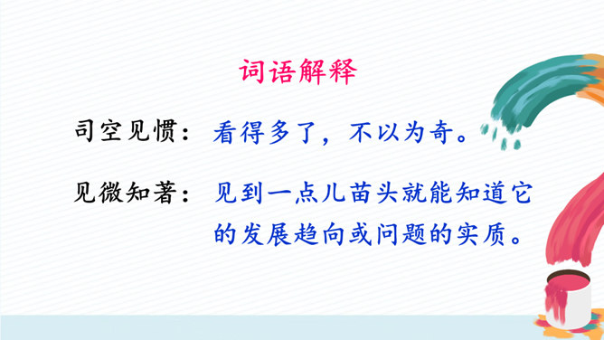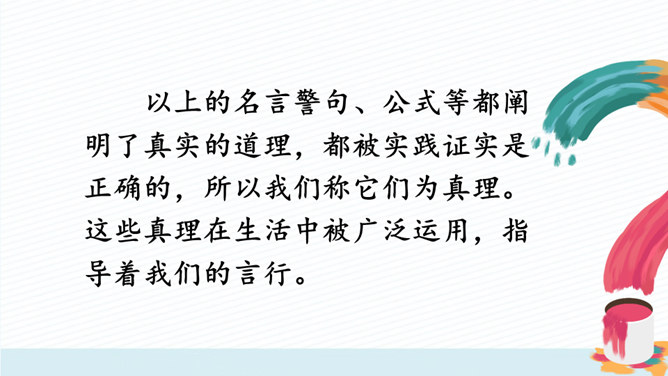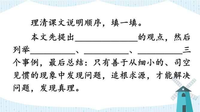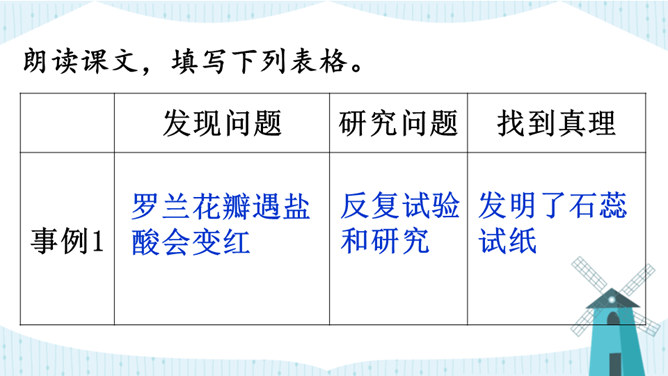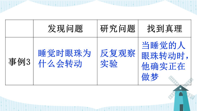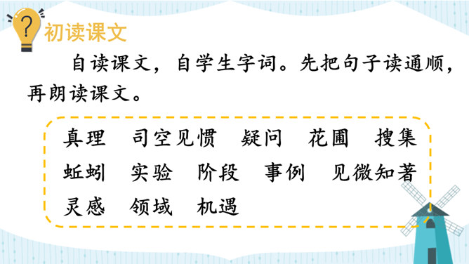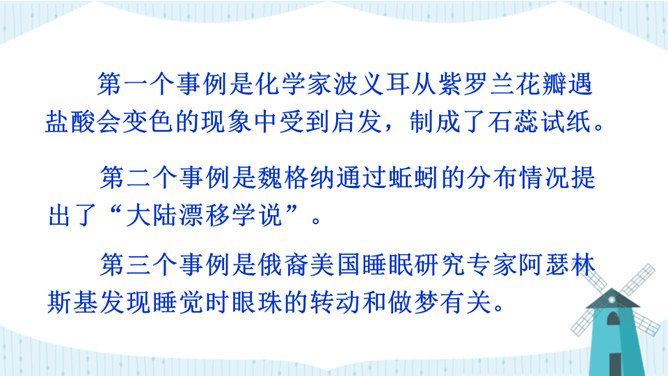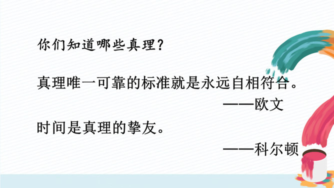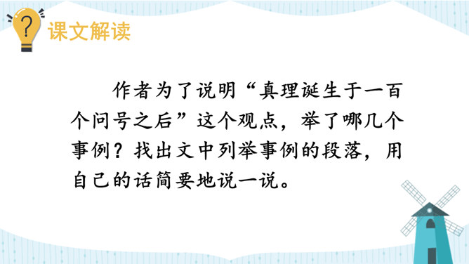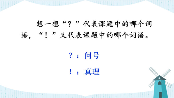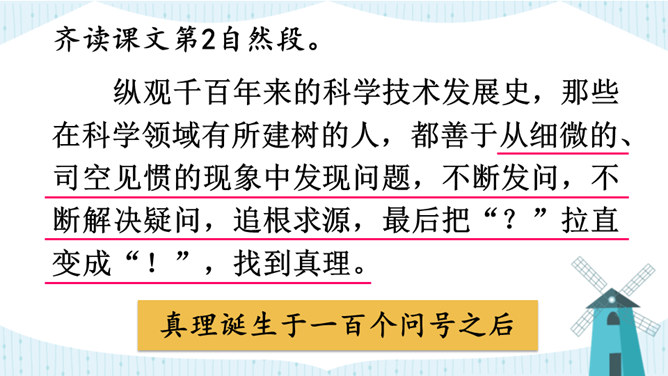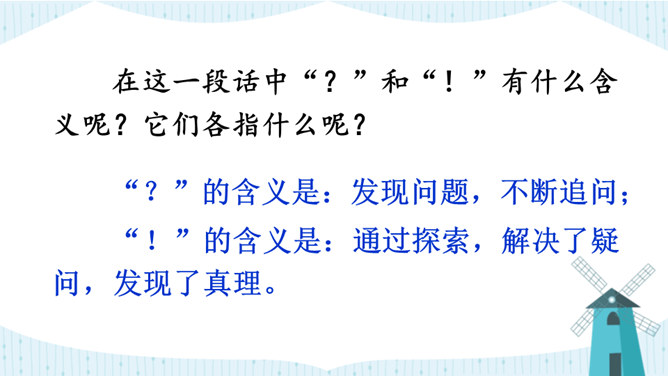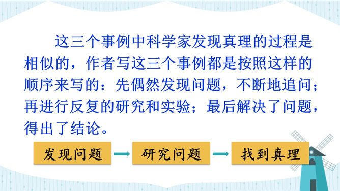 这三个事例中科学家发现真理的过程是相似的,作者写这三个事例都是按照这样的顺序来写的:先偶然发现问题,不断地追问;再进行反复的研究和实验;最后解决了问题,得出了结论。“?”的含义是:发现问题,不断追问;“!”的含义是:通过探索,解决了疑问,发现了真理。这么多的事例说明了科学并不神秘,真理并不遥远。只要你从细微的、司空见惯的现象中发现问题,追根求源,最后把“?”拉直变成“!”,就可以找到真理。所属专题:真理诞生于一百个问号之后ppt。