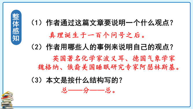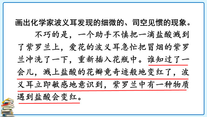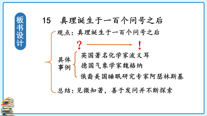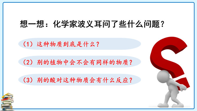 你知道科学家们主要依靠什么取得伟大的成就吗?仿照课文写法,用几个具体事例说明一个观点,如“有志者事竟成”“玩出了名堂”。1.你还读过哪些科学家的传记或其他科普作品呢?请讲给同学听听。2.阅读课外读物,了解科学家发明创造的故事。 那么,这种物质到底是什么?别的植物中会不会有同样的物质?别的酸对这种物质会有什么样的反应?这一奇怪的现象以及一连串的问题,促使波义耳进行了许多实验。所属专题:真理诞生于一百个问号之后ppt。