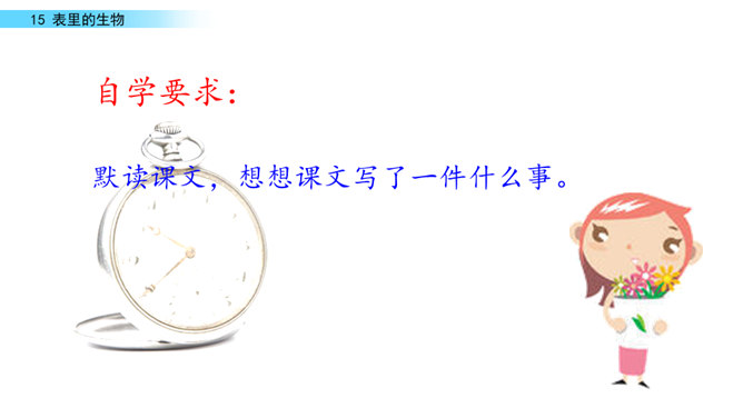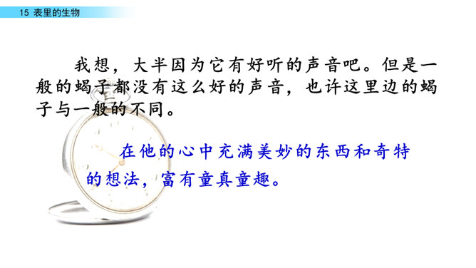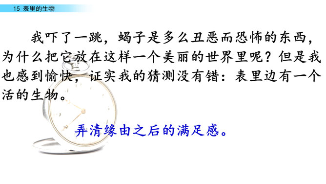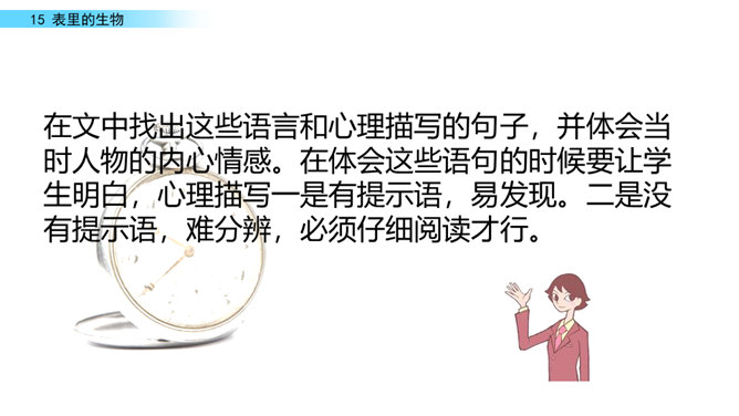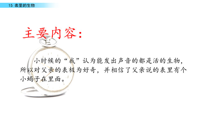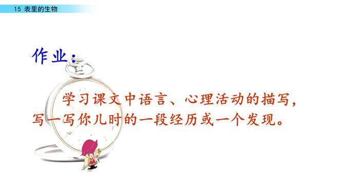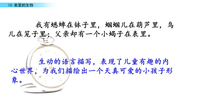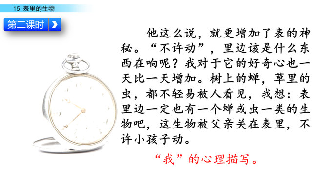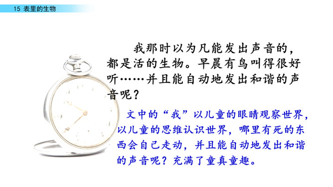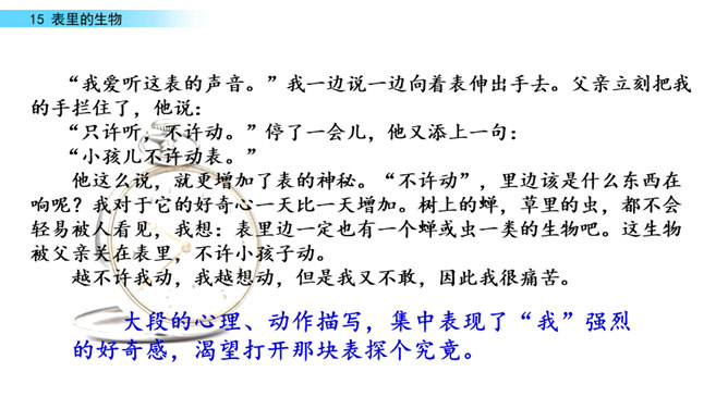 文中的“我”以儿童的眼睛观察世界,以儿童的思维认识世界,哪里有死的东西会自己走动,并且能自动地发出和谐的声音呢?充满了童真童趣。大段的心理、动作描写,集中表现了“我”强烈的好奇感,渴望打开那块表探个究竟。动作、心理描写,表现了“我”强烈的好奇心,以及好奇心将要满足之时的紧张心情。在他的心中充满美妙的东西和奇特的想法,富有童真童趣。生动的语言描写,表现了儿童有趣的内心世界,为我们描绘出一个天真可爱的小孩子形象。所属专题:表里的生物ppt。