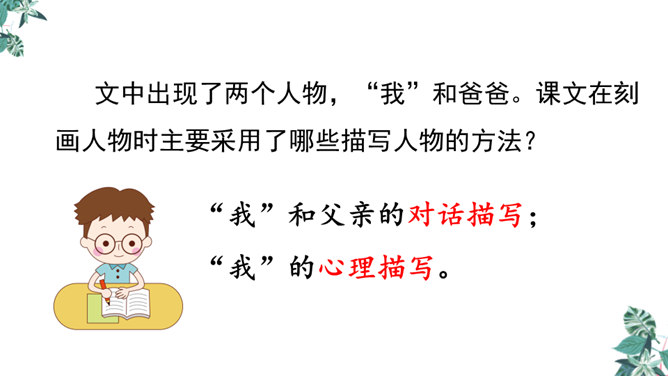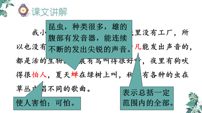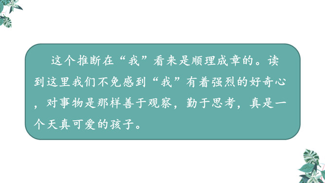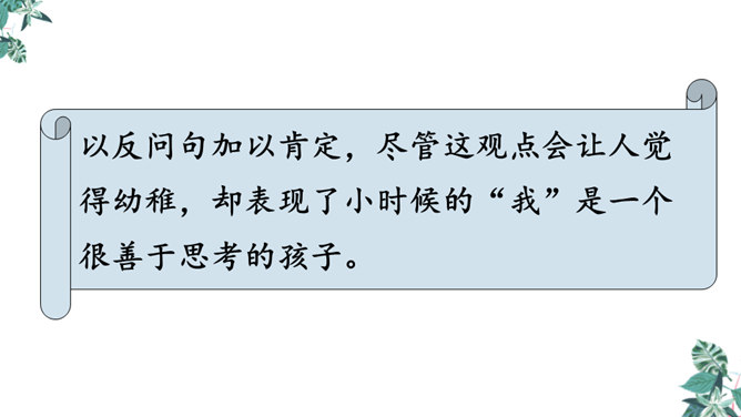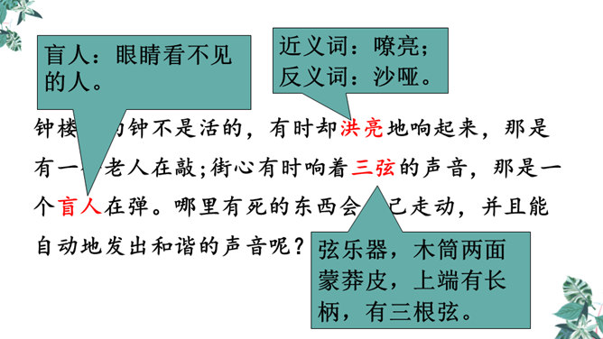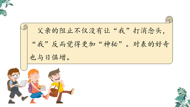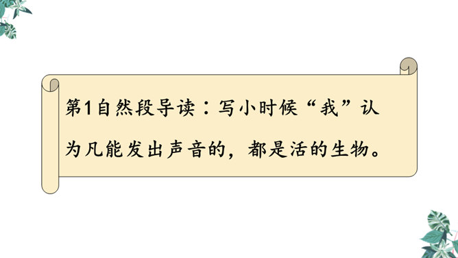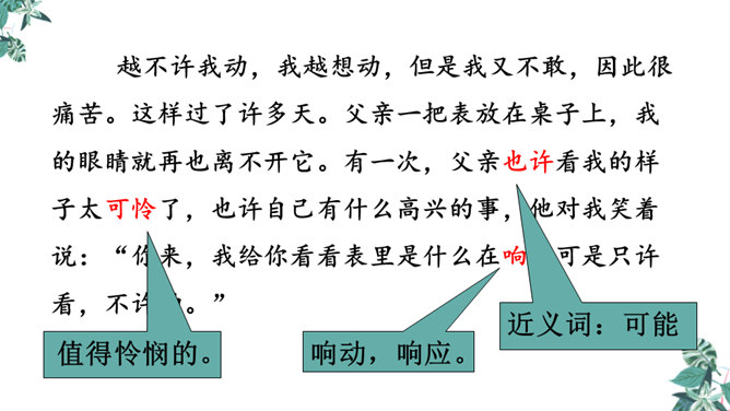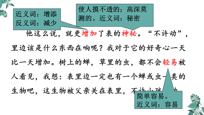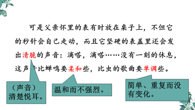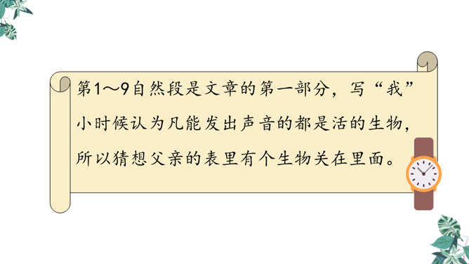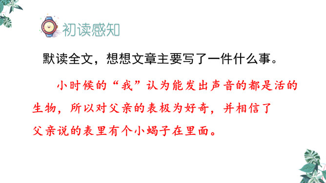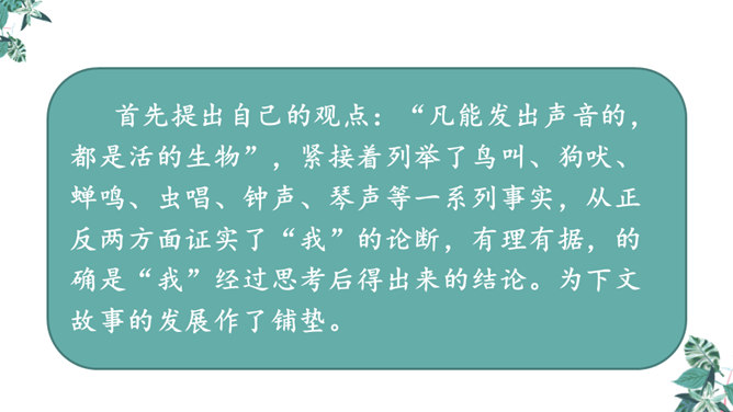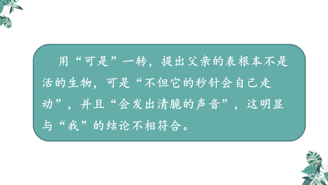 首先提出自己的观点:“凡能发出声音的,都是活的生物”,紧接着列举了鸟叫、狗吠、蝉鸣、虫唱、钟声、琴声等一系列事实,从正反两方面证实了“我”的论断,有理有据,的确是“我”经过思考后得出来的结论。为下文故事的发展作了铺垫。用“可是”一转,提出父亲的表根本不是活的生物,可是“不但它的秒针会自己走动”,并且“会发出清脆的声音”,这明显与“我”的结论不相符合。所属专题:表里的生物ppt。