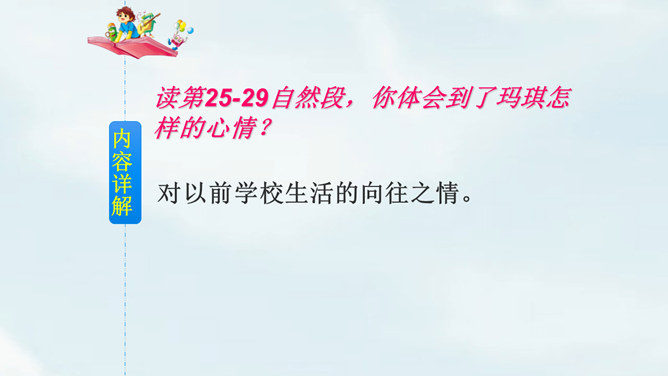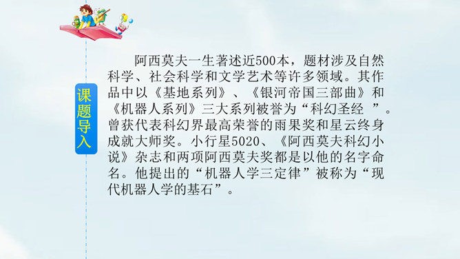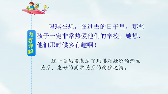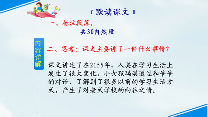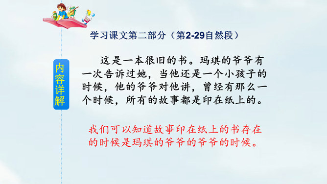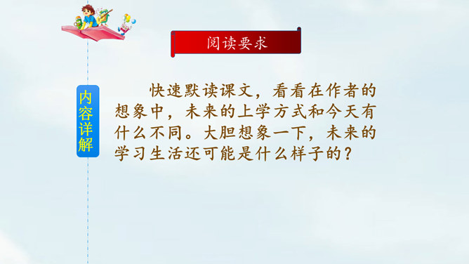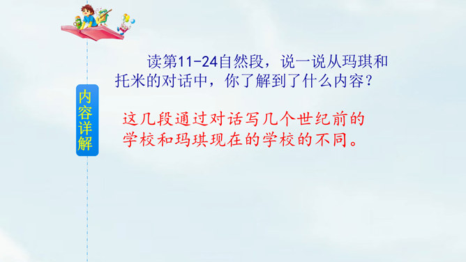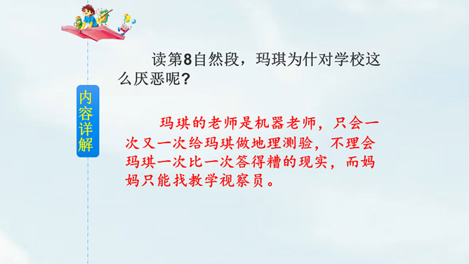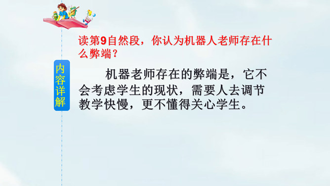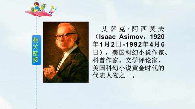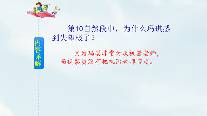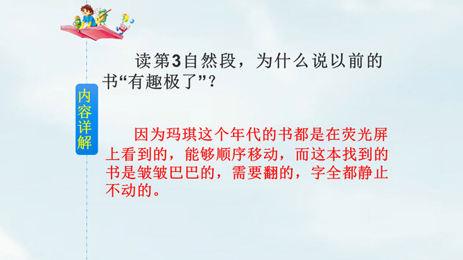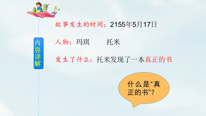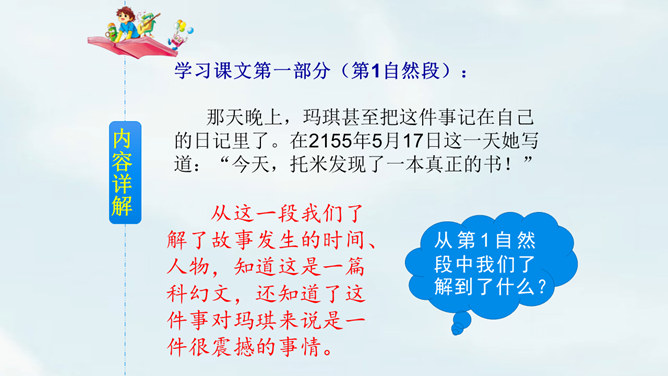 文中提到的玛琪平常看的书在现代已经出了电子书阅读器,在手机、平板电脑上也都可以看电子书,机器人老师一对一教学,现在也出现了各种学习机器、网络一对一教学;机器老师教学时能出现图像,现在教学有多媒体等。虽然玛琪的生活方式与我们不同,但生活的内容却是不变的:学生写作业、母亲教育孩子、玛琪仍在学习分数运算等;玛琪、托米的性格、对话、思维方式仍和我们一样。这也说明科幻小说的构思是基于现实的大胆想象,是人类对科技发展的展望,而不是漫无边际的幻想。所属专题:他们那时候多有趣啊ppt。
