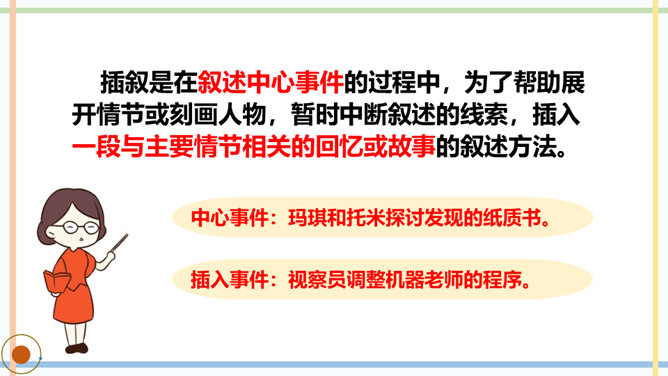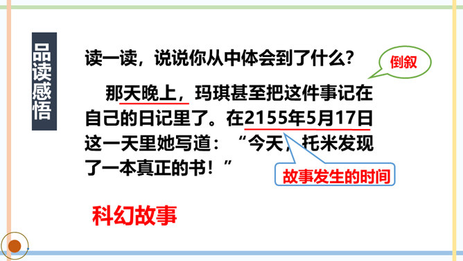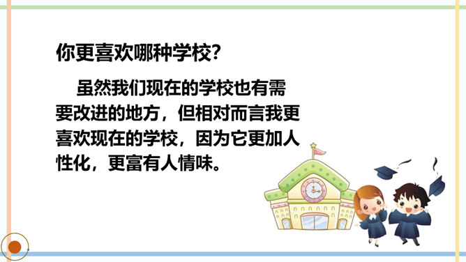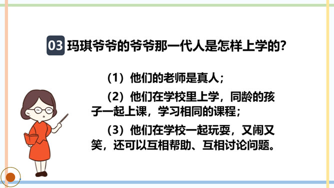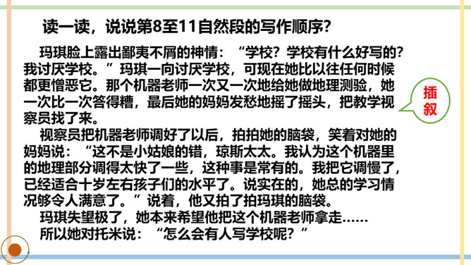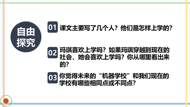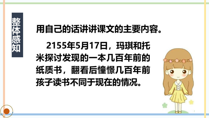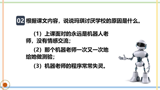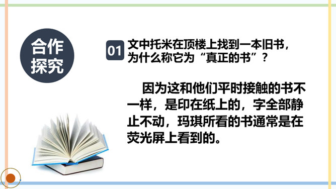 课文主要写了几个人?他们是怎样上学的?玛琪喜欢上学吗?如果玛琪穿越到现在的社会,她会喜欢上学吗?你从哪里看出来的?你觉得未来的“机器学校”和我们现在的学校有哪些相同点或不同点?文中托米在顶楼上找到一本旧书,为什么称它为“真正的书”?因为这和他们平时接触的书不一样,是印在纸上的,字全部静止不动,玛琪所看的书通常是在荧光屏上看到的。根据课文内容,说说玛琪讨厌学校的原因是什么。所属专题:他们那时候多有趣啊ppt。