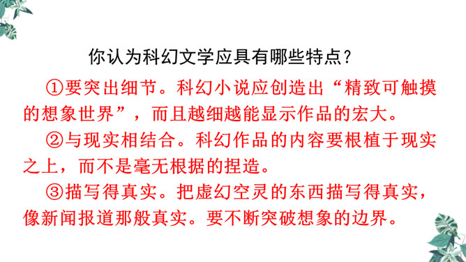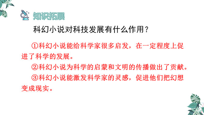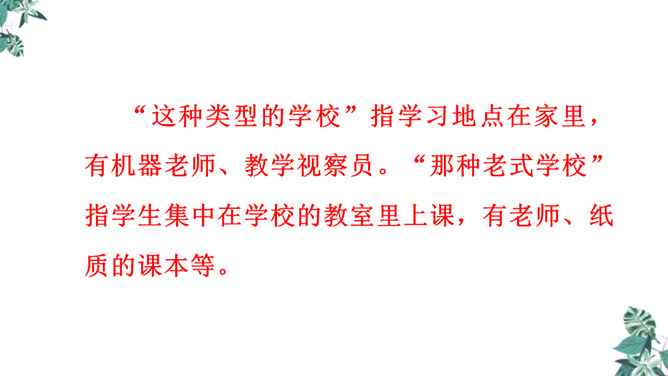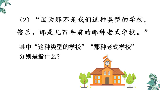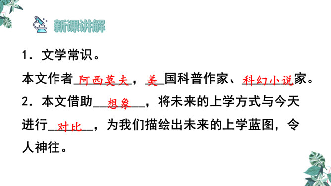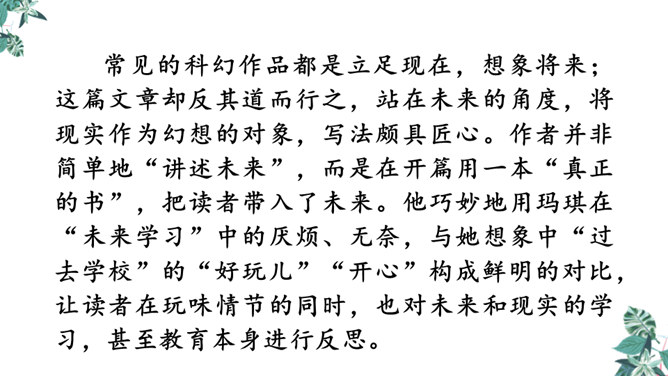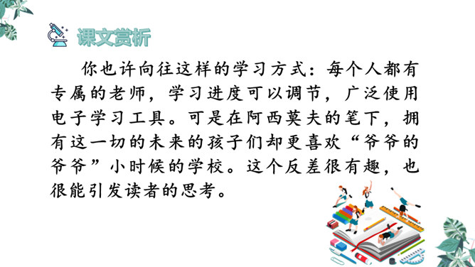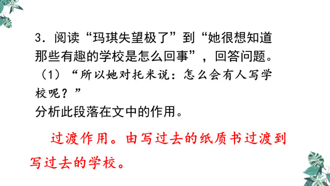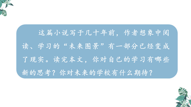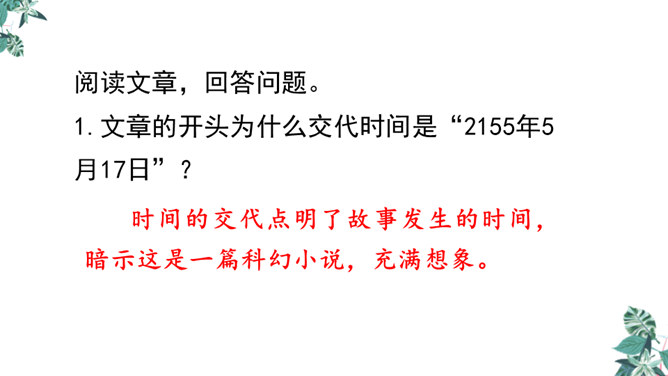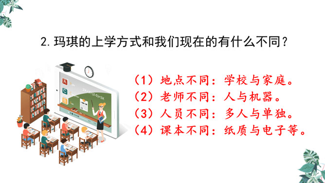 1.文章的开头为什么交代时间是“2155年5月17日”?时间的交代点明了故事发生的时间,暗示这是一篇科幻小说,充满想象。2.玛琪的上学方式和我们现在的有什么不同?地点不同:学校与家庭。老师不同:人与机器。人员不同:多人与单独。 课本不同:纸质与电子等。3.阅读“玛琪失望极了”到“她很想知道那些有趣的学校是怎么回事”,回答问题。(1)“所以她对托米说:怎么会有人写学校呢?”分析此段落在文中的作用。所属专题:他们那时候多有趣啊ppt。