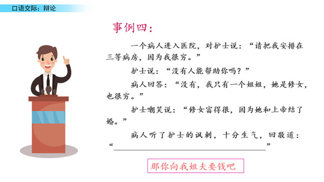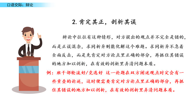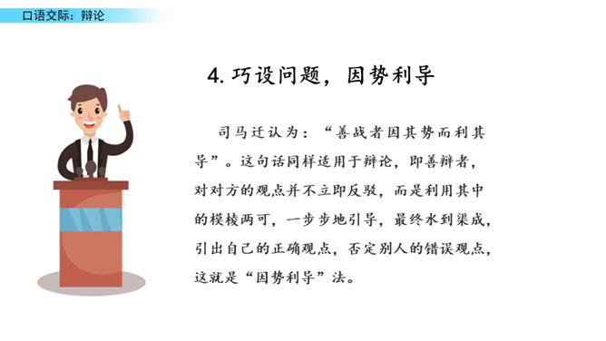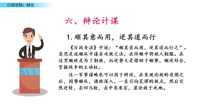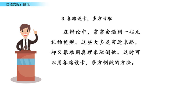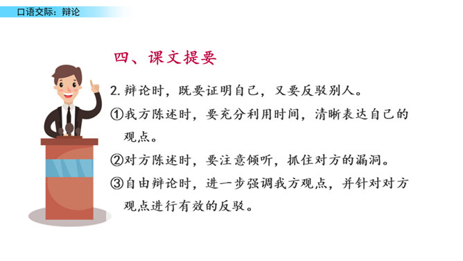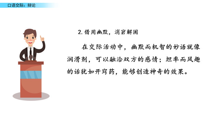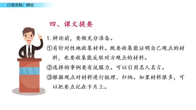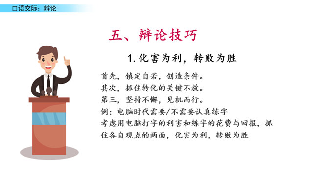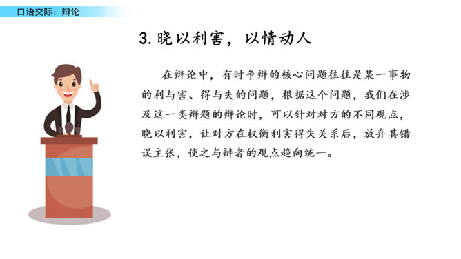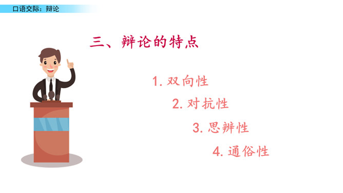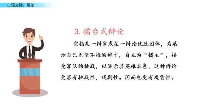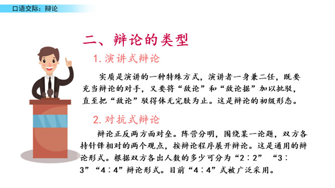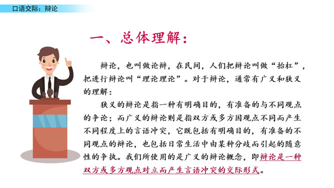 辩论,也叫做论辩,在民间,人们把辩论叫做“抬杠”,把进行辩论叫“理论理论”。对于辩论,通常有广义和狭义的理解:狭义的辩论是指一种有明确目的,有准备的与不同观点的争论;而广义的辩论则是指双方或多方因观点不同而产生不同程度上的言语冲突,它既包括有明确目的,有准备的不同观点的辩论,也包括日常生活中由某种分歧而引起的随意性的争执。我们所使用的是广义的辩论概念,即辩论是一种双方或多方观点对立而产生言语冲突的交际形式。所属专题:辩论ppt。