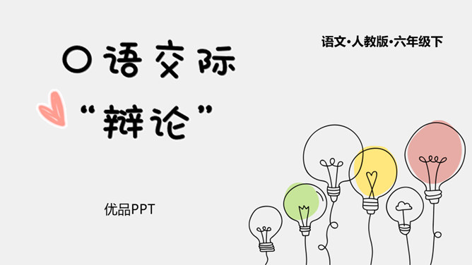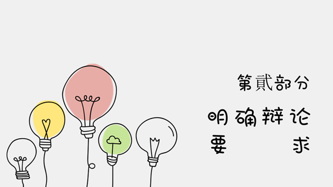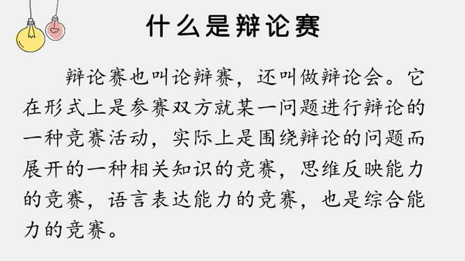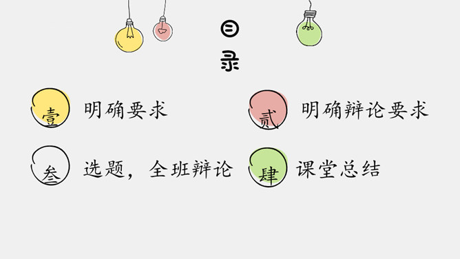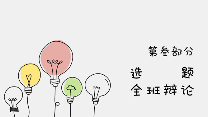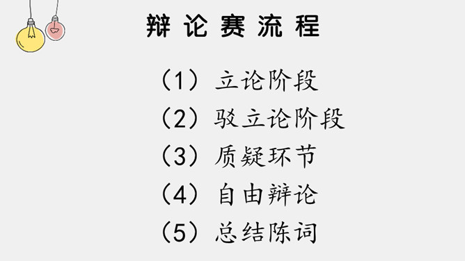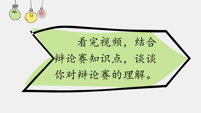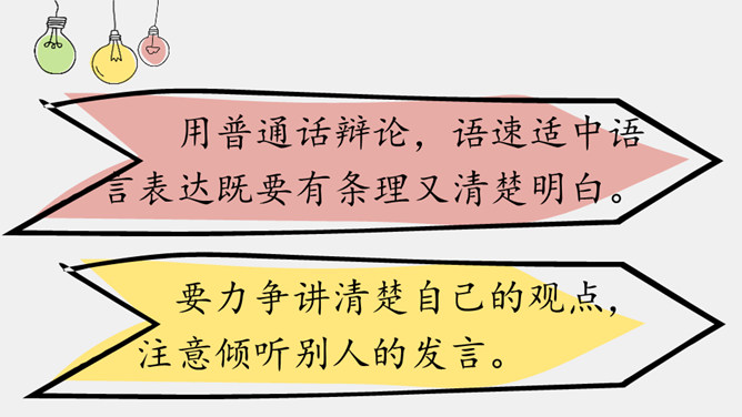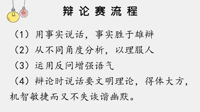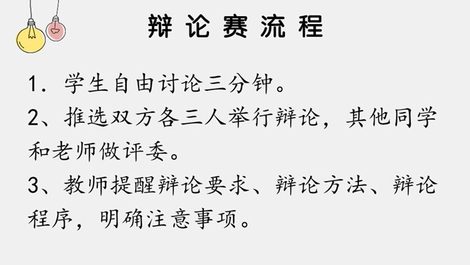 用普通话辩论,语速适中语言表达既要有条理又清楚明白。要力争讲清楚自己的观点,注意倾听别人的发言。1.学生自由讨论三分钟。2、推选双方各三人举行辩论,其他同学和老师做评委。3、教师提醒辩论要求、辩论方法、辩论程序,明确注意事项。(1)用事实说话,事实胜于雄辩。(2)从不同角度分析,以理服人。(3)运用反问增强语气。(4)辩论时说话要文明理论,得体大方,机智敏捷而又不失诙谐幽默。所属专题:辩论ppt。