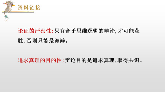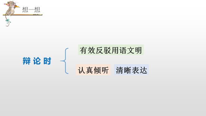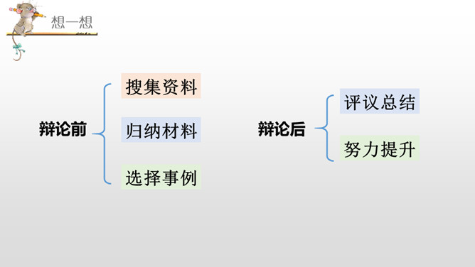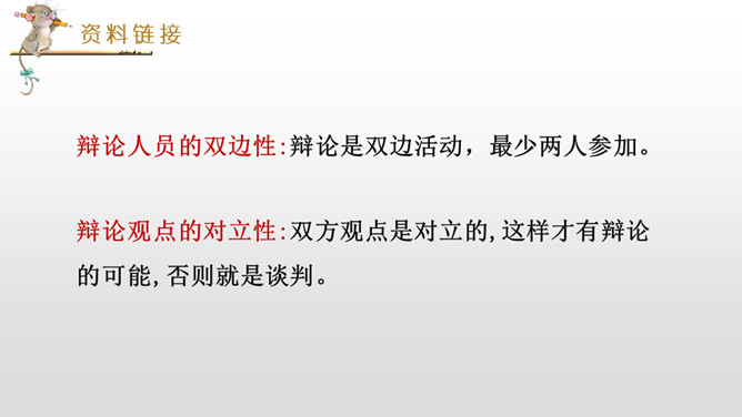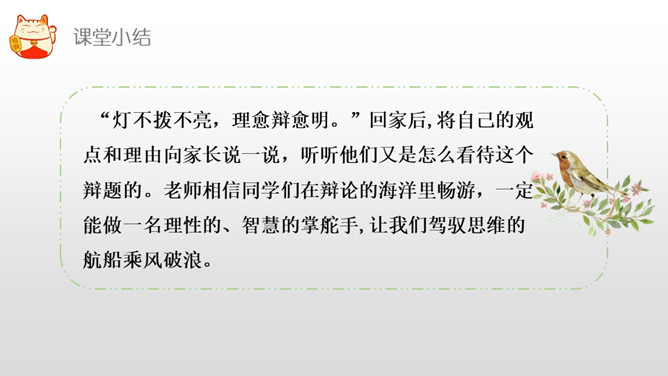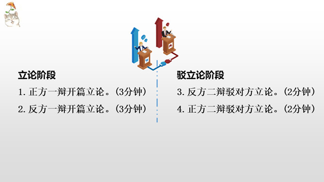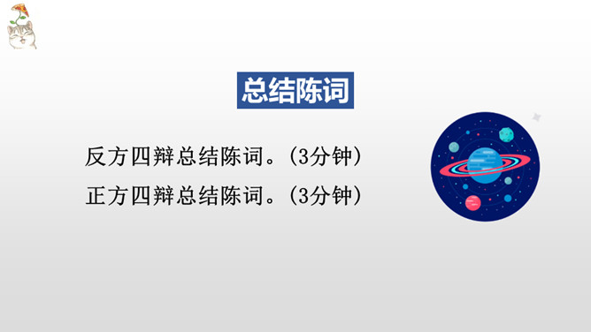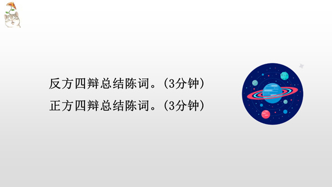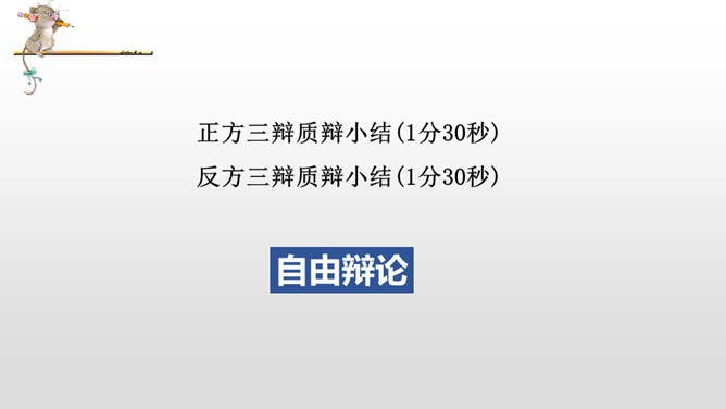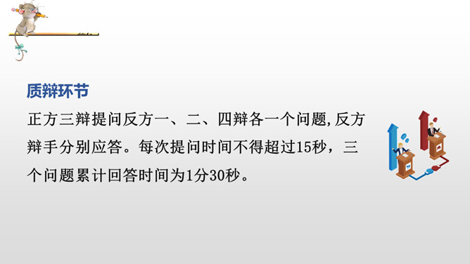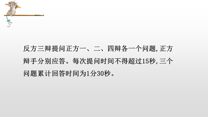 正方三辩提问反方一、二、四辩各一个问题,反方辩手分别应答。每次提问时间不得超过15秒,三个问题累计回答时间为1分30秒。反方三辩提问正方一、二、四辩各一个问题,正方辩手分别应答。每次提问时间不得超过15秒,三个问题累计回答时间为1分30秒。“灯不拨不亮,理愈辩愈明。”回家后,将自己的观点和理由向家长说一说,听听他们又是怎么看待这个辩题的。老师相信同学们在辩论的海洋里畅游,一定能做一名理性的、智慧的掌舵手,让我们驾驭思维的航船乘风破浪。所属专题:辩论ppt。