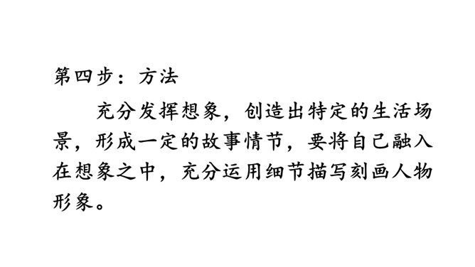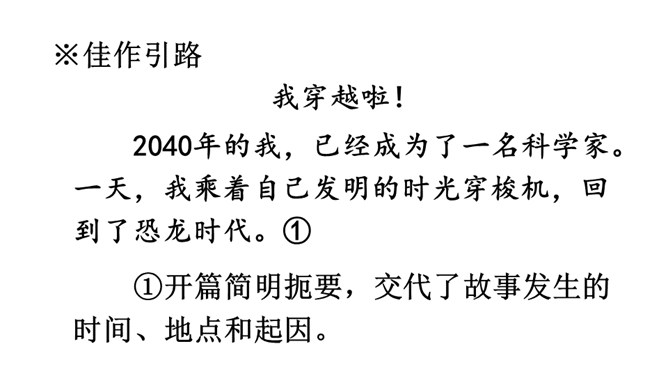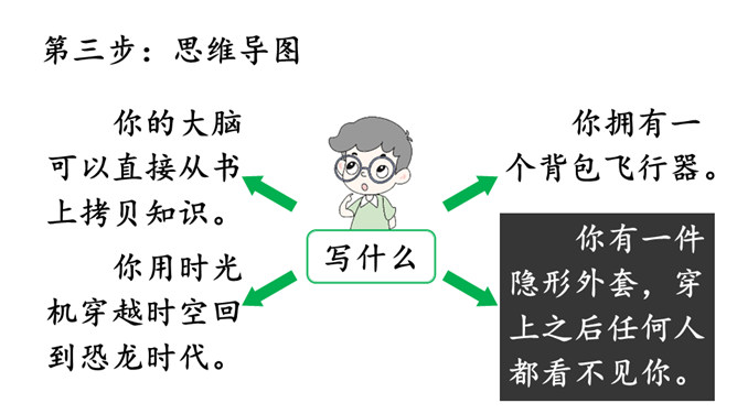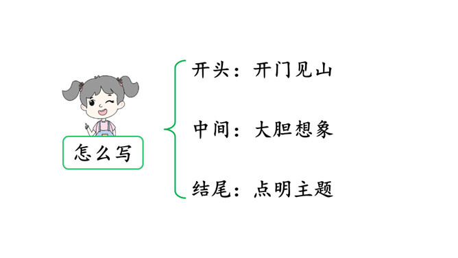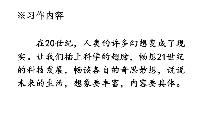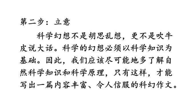 第一步:审题。习作要求写一篇科幻故事,插上想象的翅膀,将想象与科技联系在一起,从实际出发,选择自己最熟悉的东西作为写作对象,创造新的场景。第二步:立意。科学幻想不是胡思乱想,更不是吹牛皮说大话。科学的幻想必须以科学知识为基础。因此,我们应该尽可能地多了解自然科学知识和科学原理,只有这样,才能写出一篇内容丰富、令人信服的科幻作文。充分发挥想象,创造出特定的生活场景。所属专题:插上科学的翅膀飞ppt。