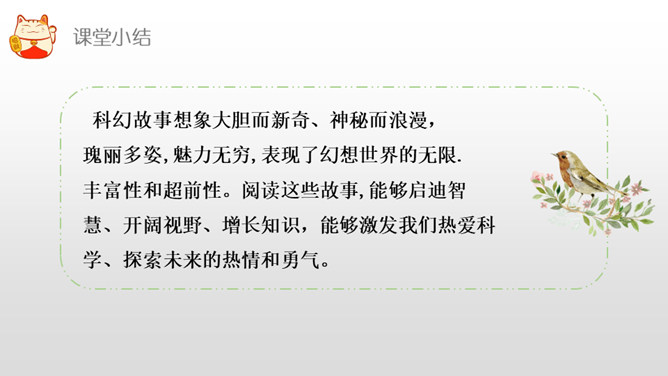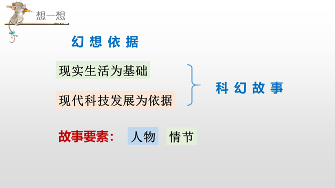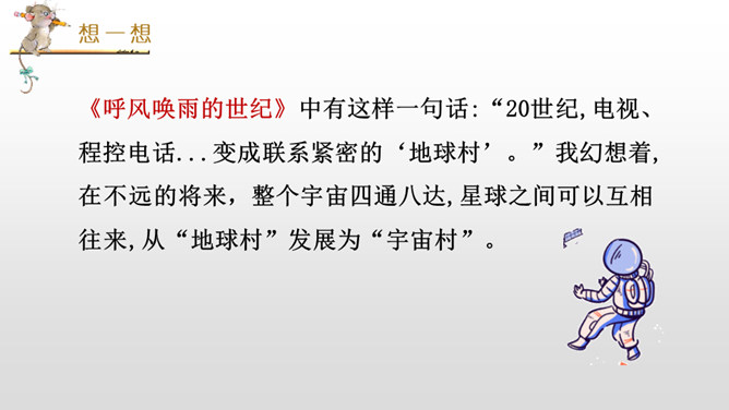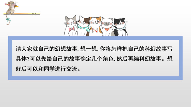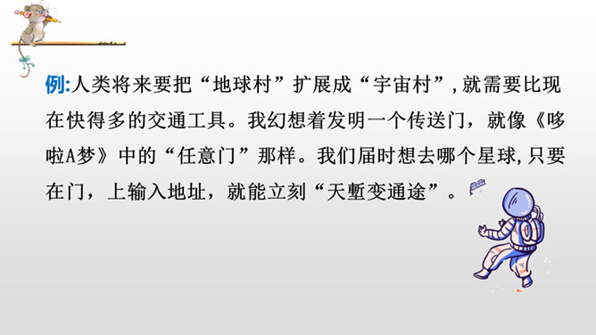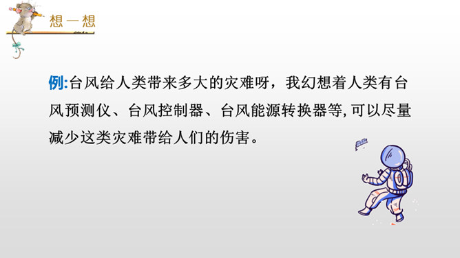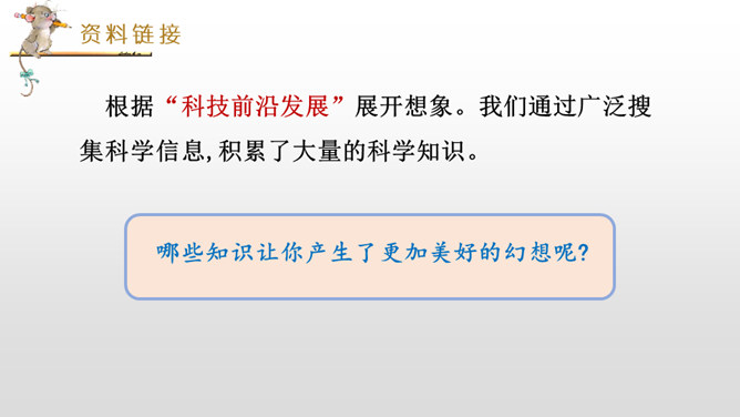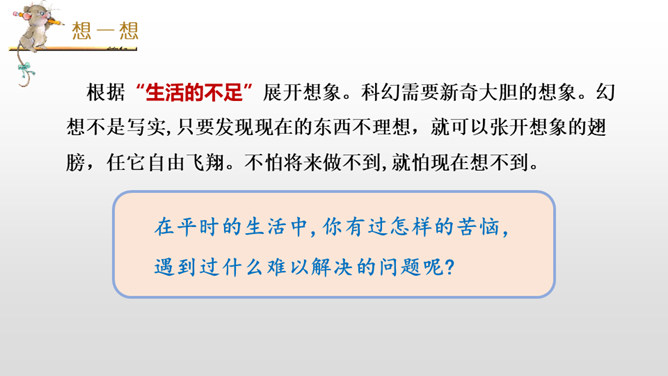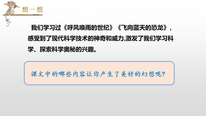 我们学习过《呼风唤雨的世纪》《飞向蓝天的恐龙》,感受到了现代科学技术的神奇和威力,激发了我们学习科学、探索科学奥秘的兴趣。课文中的哪些内容让你产生了美好的幻想呢?根据“生活的不足”展开想象。科幻需要新奇大胆的想象。幻想不是写实,只要发现现在的东西不理想,就可以张开想象的翅膀,任它自由飞翔。不怕将来做不到,就怕现在想不到。在平时的生活中,你有过怎样的苦恼,遇到过什么难以解决的问题呢?所属专题:插上科学的翅膀飞ppt。
