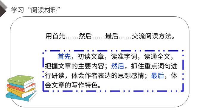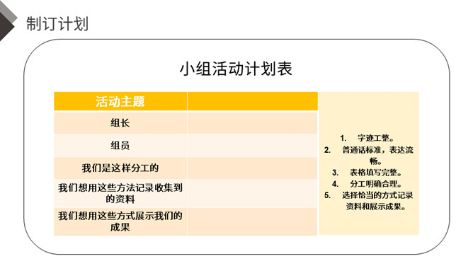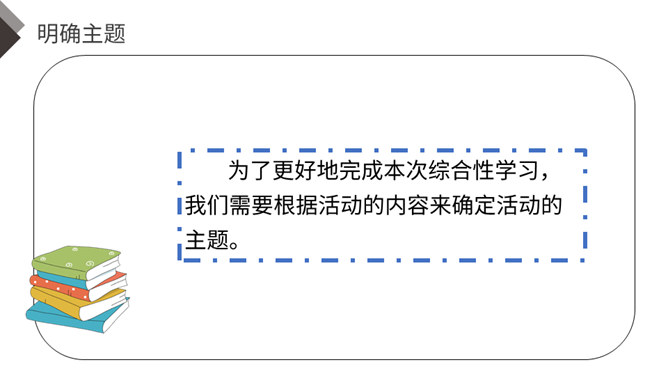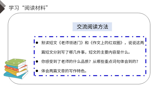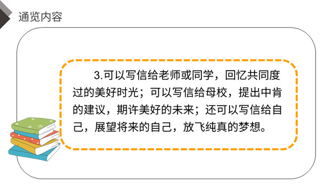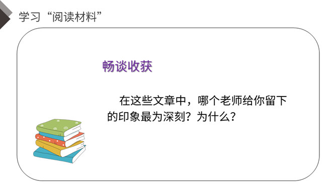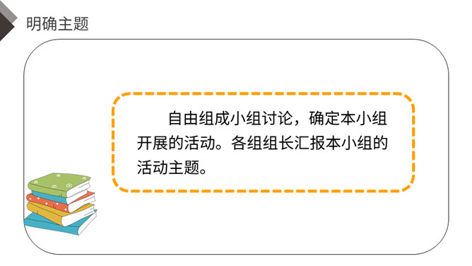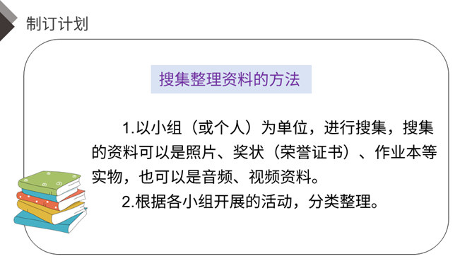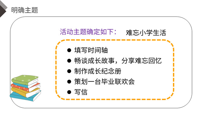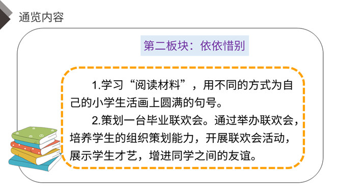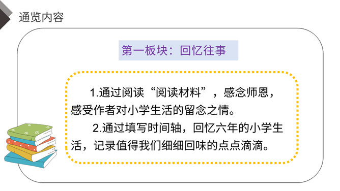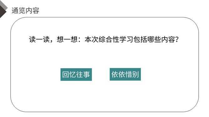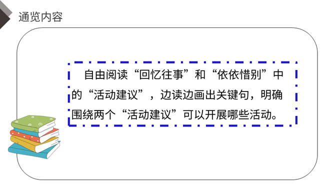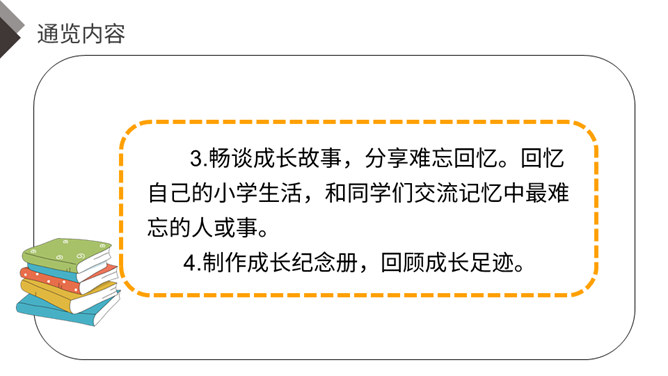 自由阅读“回忆往事”和“依依惜别”中 的“活动建议”,边读边画出关键句,明确围绕两个“活动建议”可以开展哪些活动。1.通过阅读“阅读材料”,感念师恩,感受作者对小学生活的留念之情。2.通过填写时间轴,回忆六年的小学生活,记录值得我们细细回味的点点滴滴。3.畅谈成长故事,分享难忘回忆。回忆自己的小学生活,和同学们交流记忆中最难忘的人或事。4.制作成长纪念册,回顾成长足迹。所属专题:难忘的小学生活ppt。