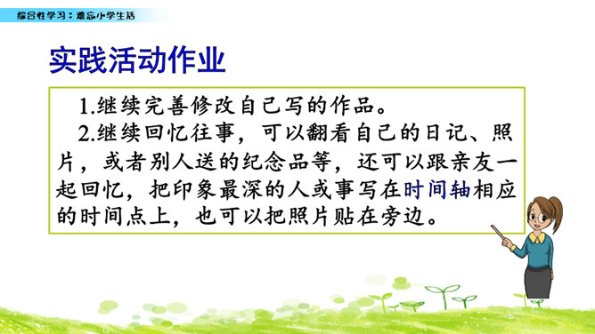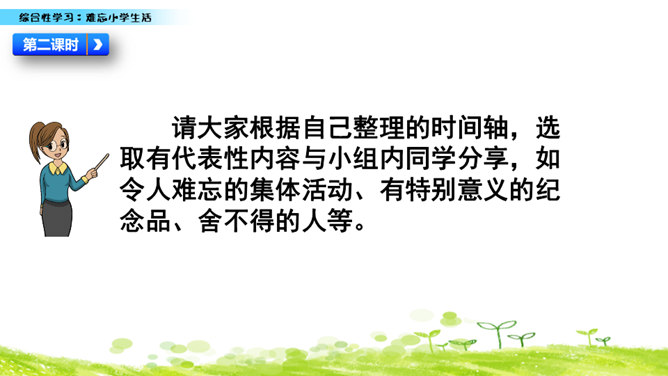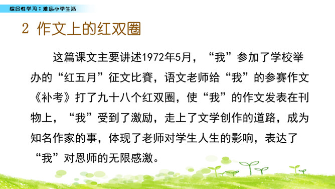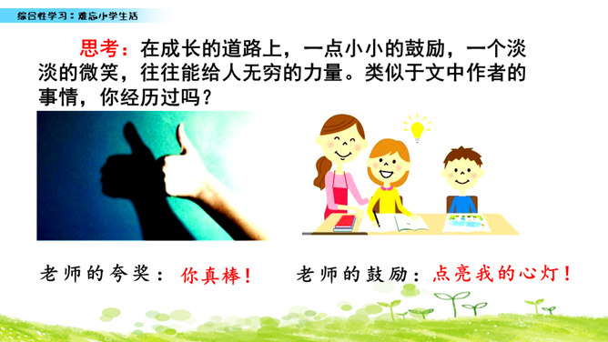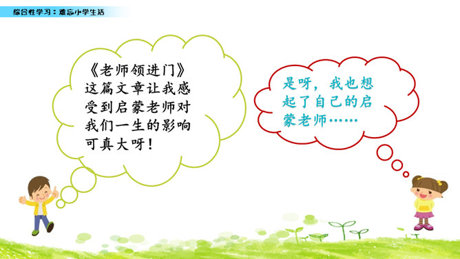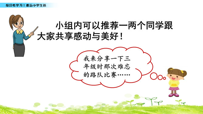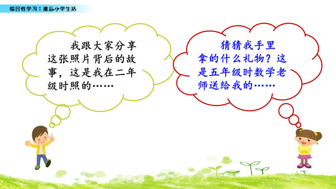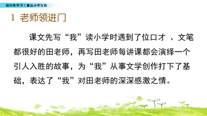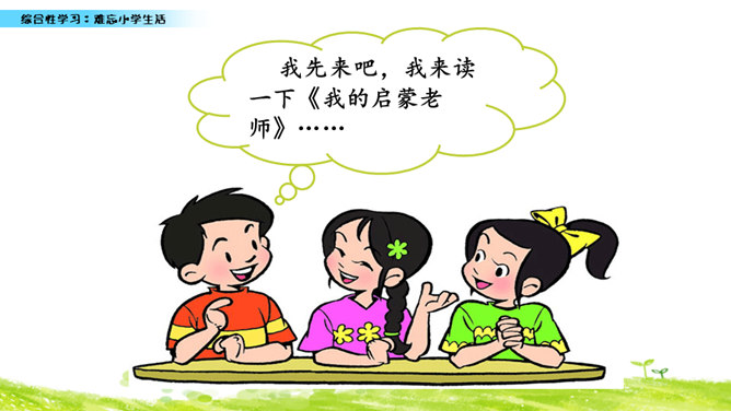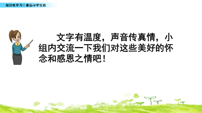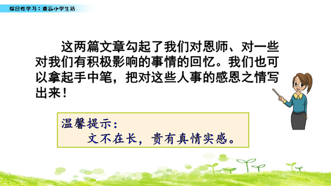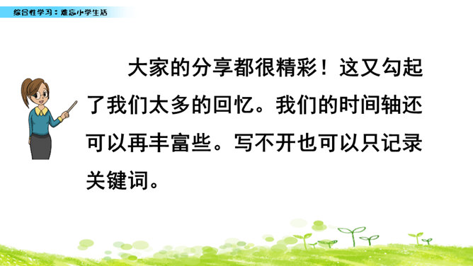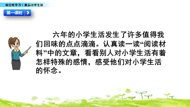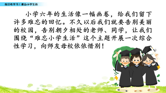 小学六年的生活像一幅画卷,给我们留下许多难忘的回忆。不久以后我们就要告别美丽的校园,告别朝夕相处的老师、同学,让我们围绕“难忘小学生活”这个主题开展一次综合性学习,向师友母校依依惜别!六年的小学生活发生了许多值得我们回味的点点滴滴。认真读一读“阅读材料”中的文章,看看别人对小学生活有着怎样特殊的感情,感受他们对小学生活的怀念。所属专题:难忘的小学生活ppt。