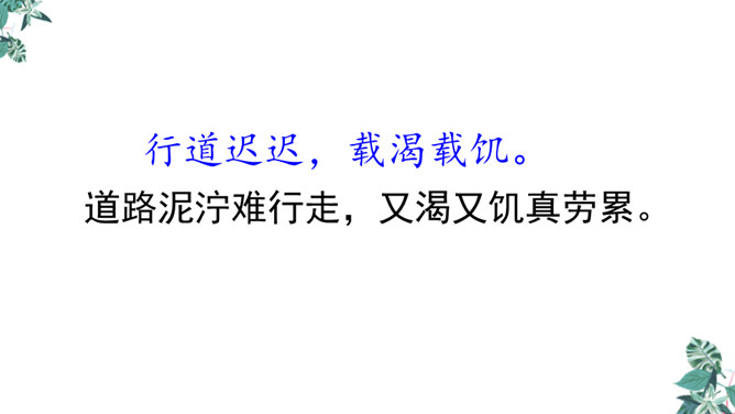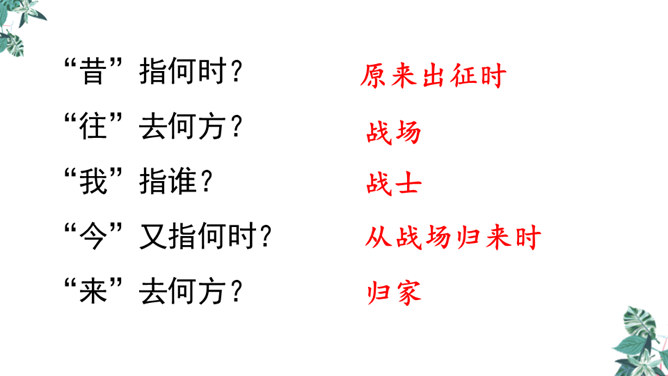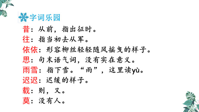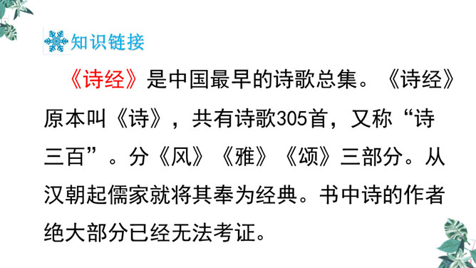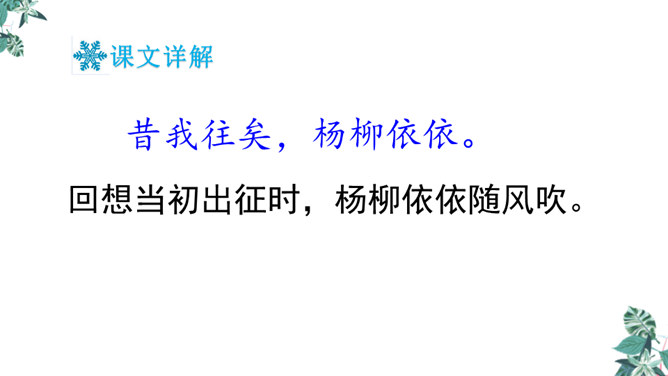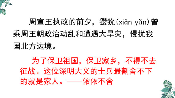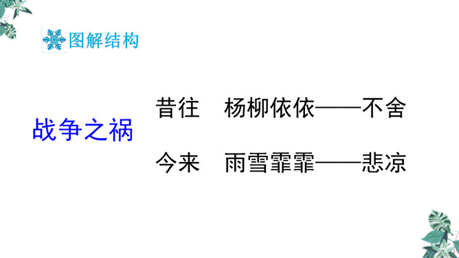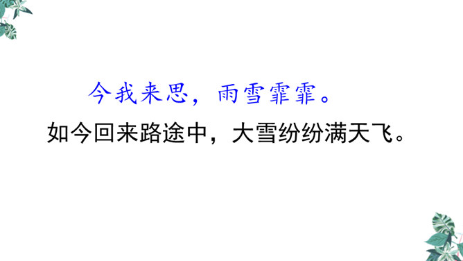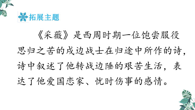 从写作上看,它和诗经的许多作品一样用以薇起兴的手法,加上章法、词法上重沓叠奏,使内容和情趣都得以层层铺出,渐渐深化,也增强了作品的音乐美和节奏感。全诗有记叙,有议论,有景物,有抒情,有心理描写,搭配错落有致,又十分妥贴,因此《采薇》一篇确是《诗经》中最好的篇章之一。 另外也运用了倒叙和对比等写作手法。这位战士侥幸存活下来,饥寒交迫,却没有人来迎接,这是为什么呢?物是人非事事休,欲语泪先流!他彻底绝望了,他的心犹如飞舞着的雪花一样冰冷!犹如低沉着的山风一样哀吟。所属专题:采薇ppt。