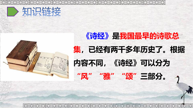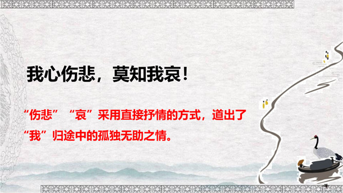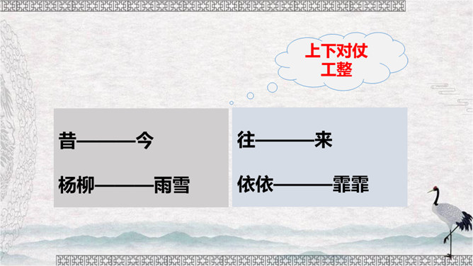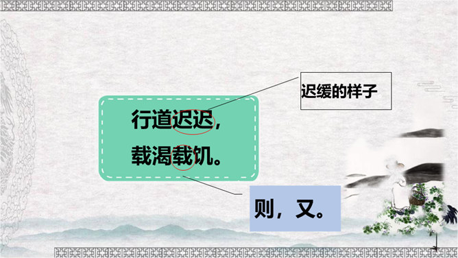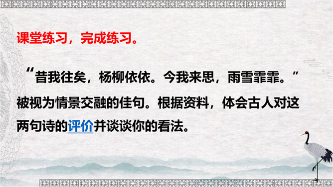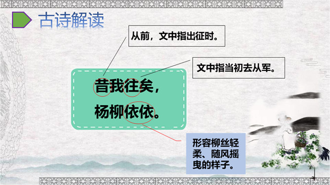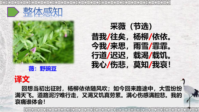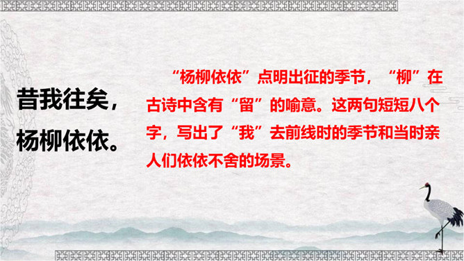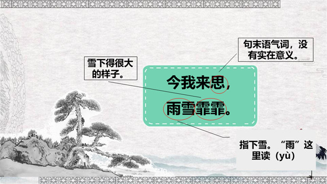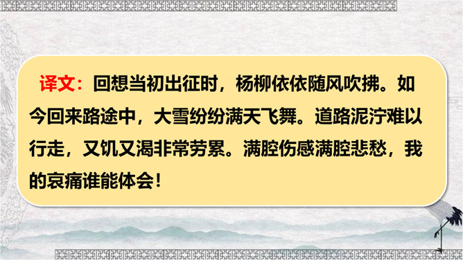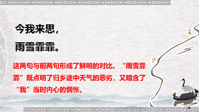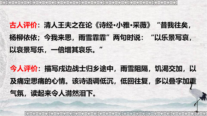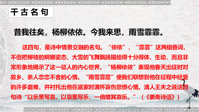 这四句,是诗中情景交融的名句。“依依”,“霏霏”这两组叠词,不但把柳枝的婀娜姿态、大雪的飞舞飘扬描绘得十分得体、生动,而且非常形象地揭示了这一征人的内心世界。“杨柳依依”表现他春天出征时对故乡、亲人恋恋不舍的心情。“雨雪霏霏”使我们联想到他在征程中经受的许多磨难,并衬托出他在返家时满怀哀伤悲愤心情。清人王夫之说这四句诗“以乐景写哀,以哀景写乐,一倍增其哀乐。”所属专题:采薇ppt。