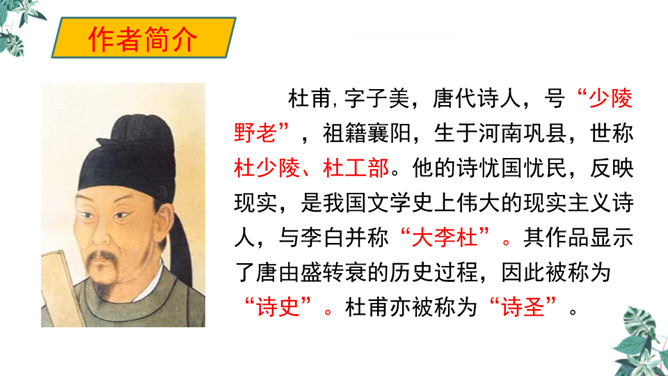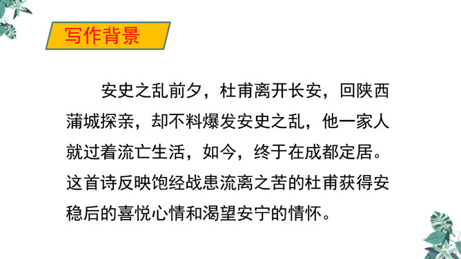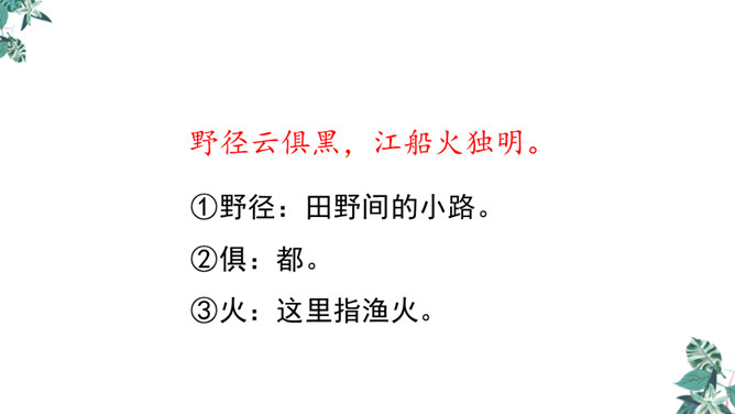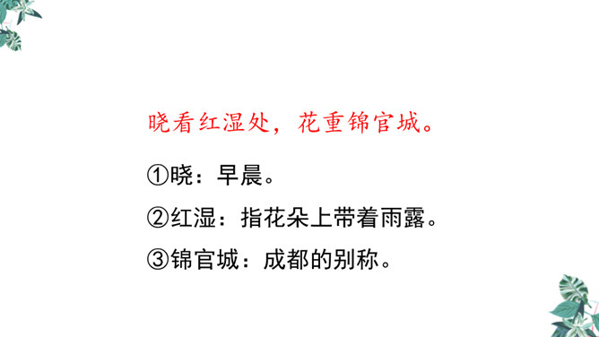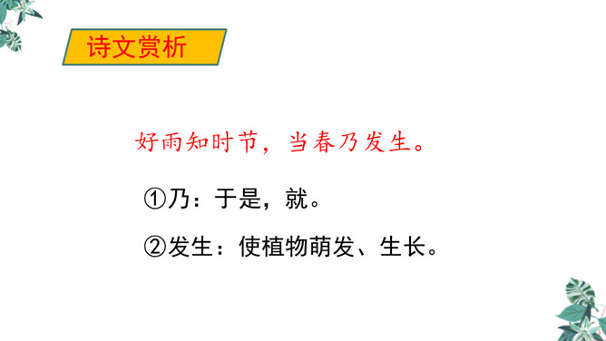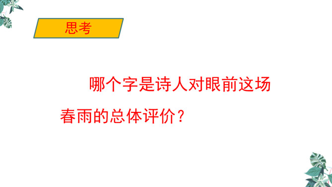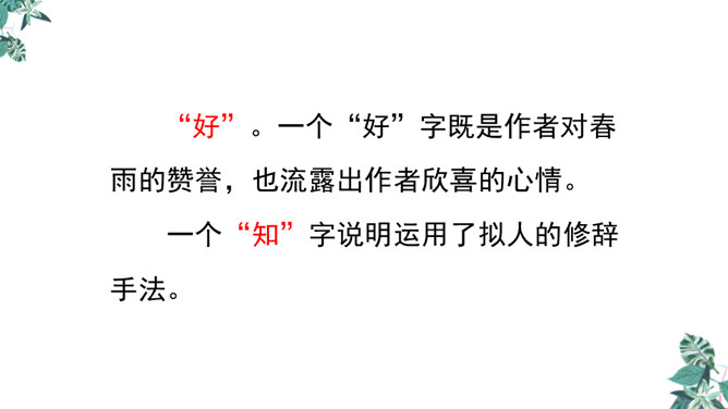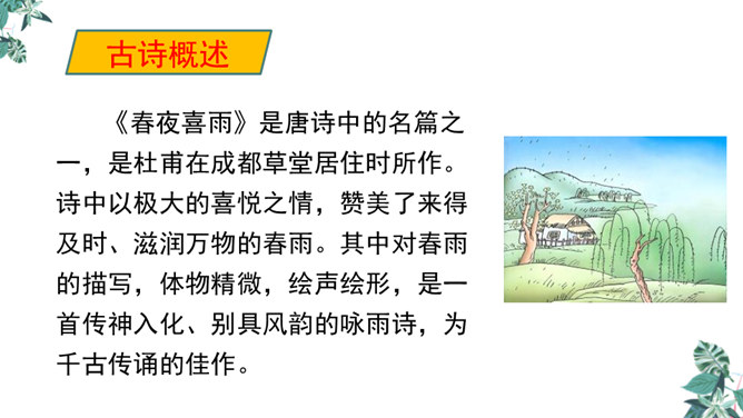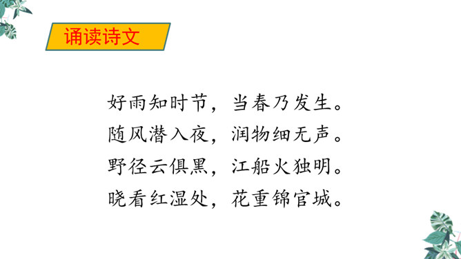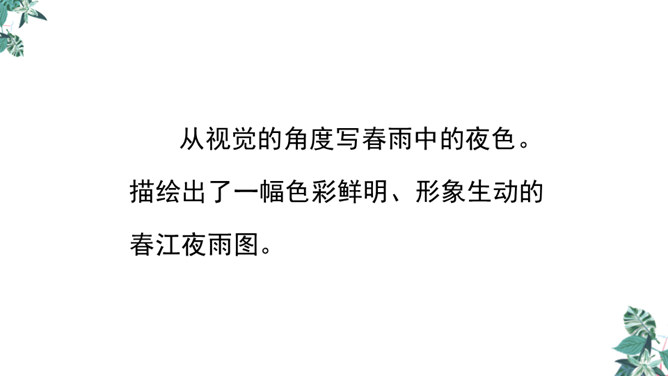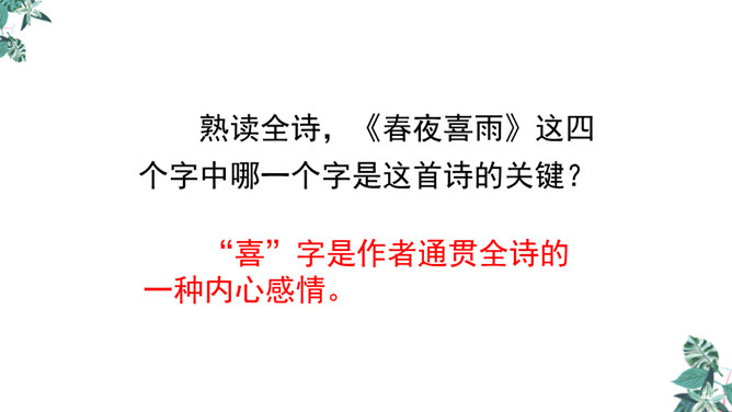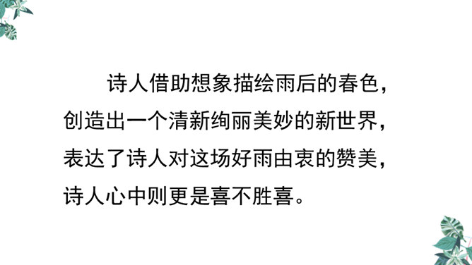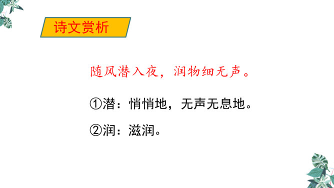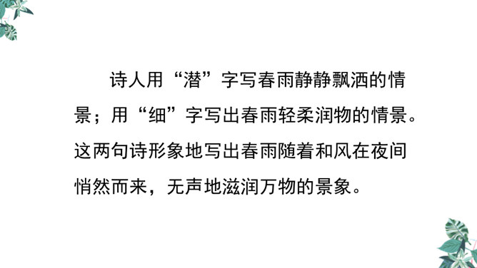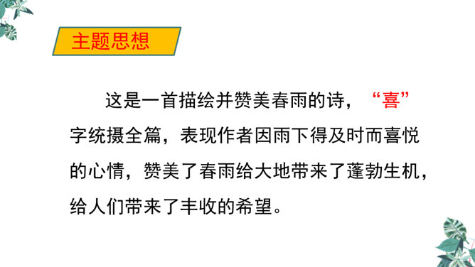 诗人用“潜”字写春雨静静飘洒的情景;用“细”字写出春雨轻柔润物的情景。这两句诗形象地写出春雨随着和风在夜间悄然而来,无声地滋润万物的景象。从视觉的角度写春雨中的夜色。描绘出了一幅色彩鲜明、形象生动的春江夜雨图。诗人借助想象描绘雨后的春色,创造出一个清新绚丽美妙的新世界,表达了诗人对这场好雨由衷的赞美,诗人心中则更是喜不胜喜。 这是一首描绘并赞美春雨的诗,“喜”字统摄全篇,表现作者因雨下得及时而喜悦的心情,赞美了春雨给大地带来了蓬勃生机,给人们带来了丰收的希望。所属专题:春夜喜雨ppt。