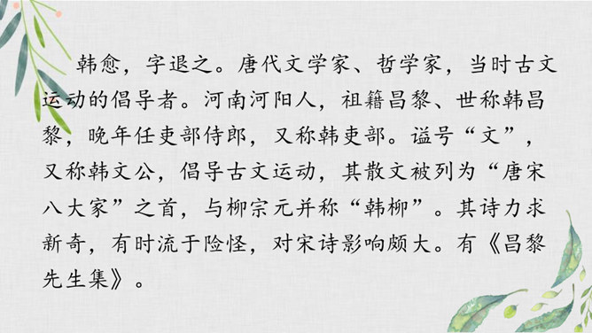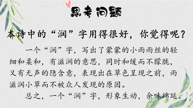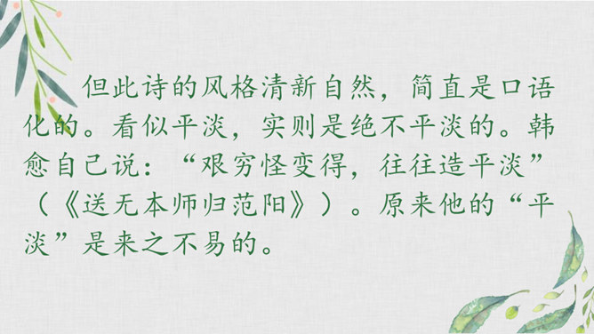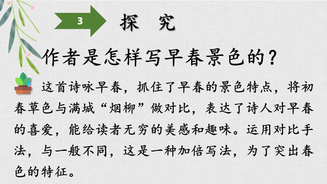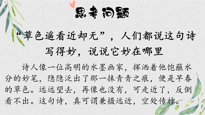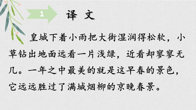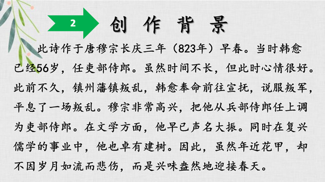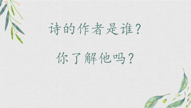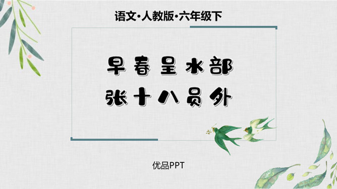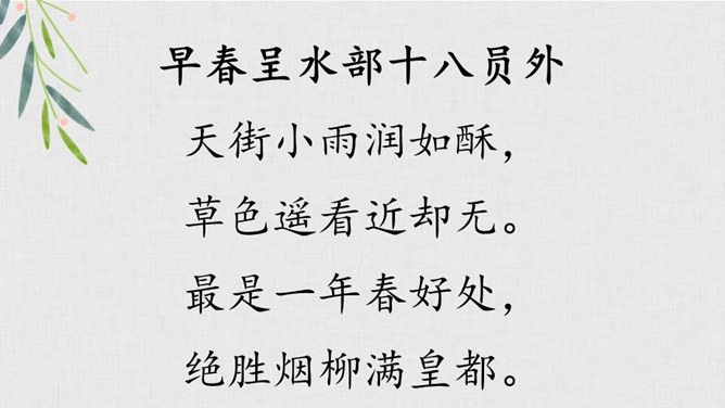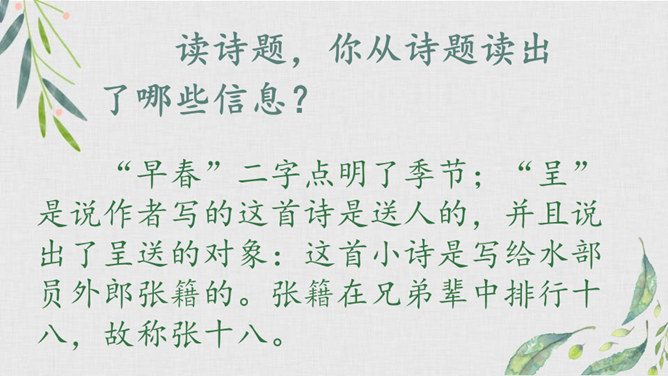 我们学过不少歌咏春天事物的诗句,还记得么?我们今天再来学习一首歌咏春天景物的诗歌--《早春呈水部张十八员外》。读诗题,你从诗题读出了哪些信息?“早春”二字点明了季节;“呈”是说作者写的这首诗是送人的,并且说出了呈送的对象:这首小诗是写给水部员外郎张籍的。张籍在兄弟辈中排行十八,故称张十八。诗的作者是谁?但此诗的风格清新自然,简直是口语化的。看似平淡,实则是绝不平淡的。所属专题:早春呈水部张十八员外ppt。