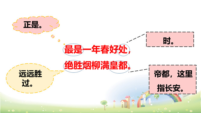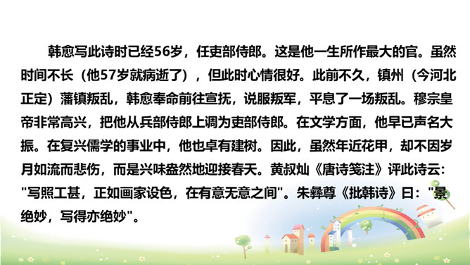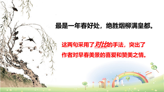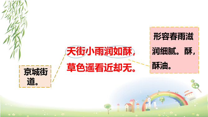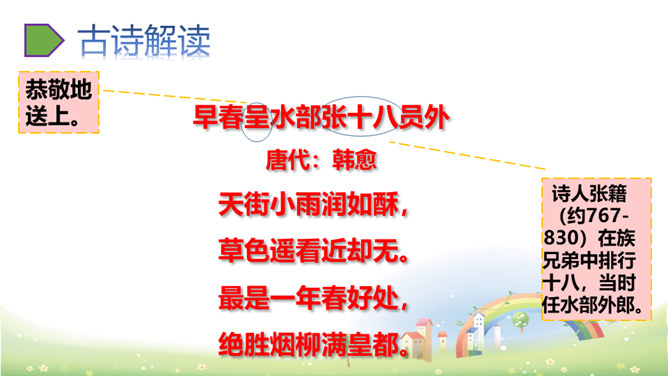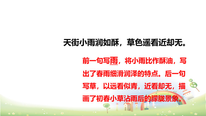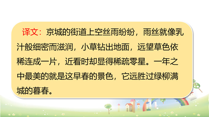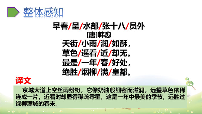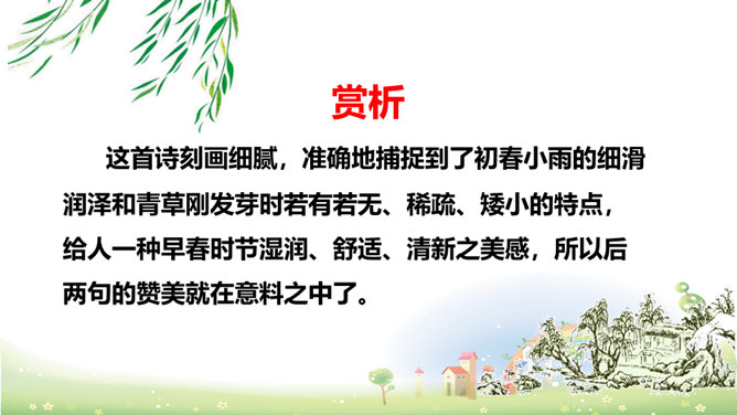 这首诗刻画细腻,准确地捕捉到了初春小雨的细滑润泽和青草刚发芽时若有若无、稀疏、矮小的特点,给人一种早春时节湿润、舒适、清新之美感,所以后两句的赞美就在意料之中了。以常见的“小雨”和“草色”为描写对象,描绘出了早春的独特景色,表达了作者对春天的热爱和赞美之情。京城大道上空丝雨纷纷,它像奶油般细密而滋润,远望草色依稀连成一片,近看时却显得稀疏零星。这是一年中最美的季节,远胜过绿柳满城的春末。所属专题:早春呈水部张十八员外ppt。