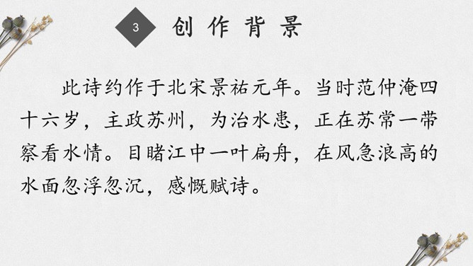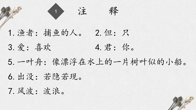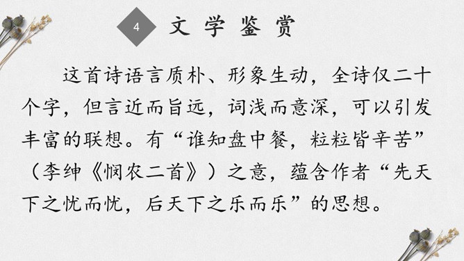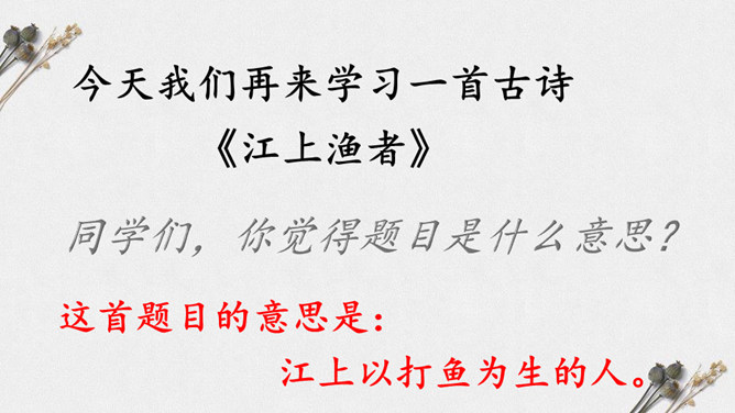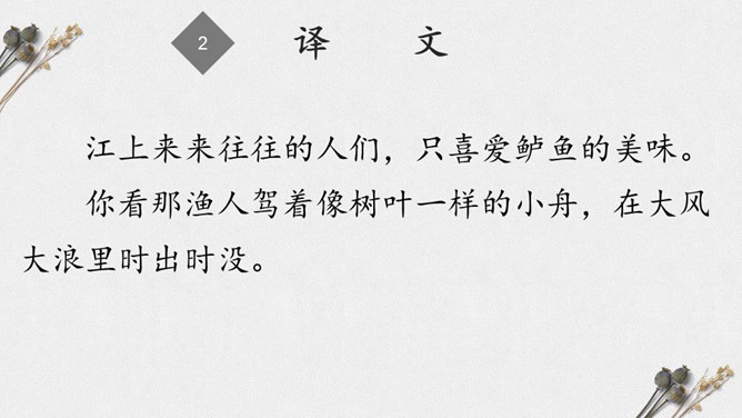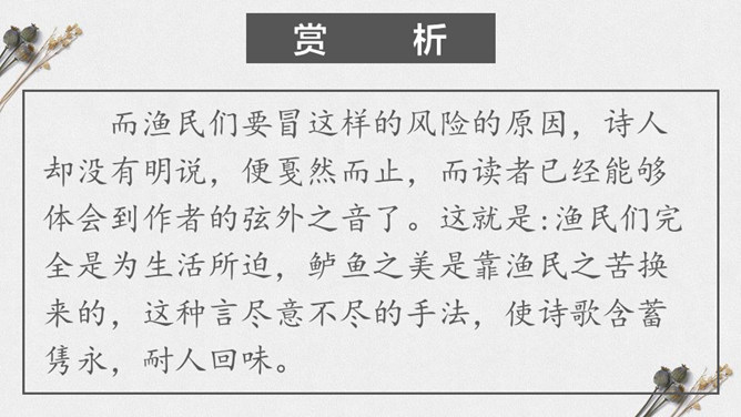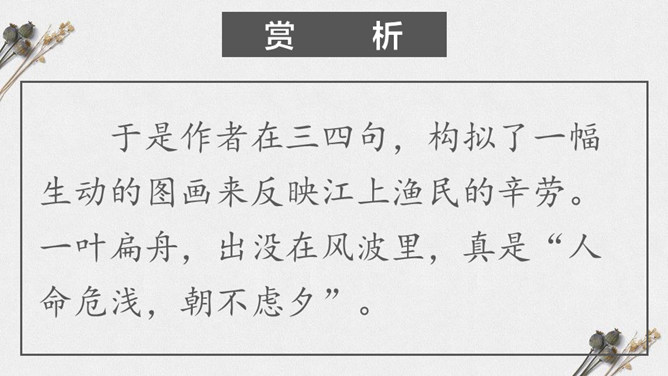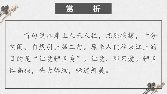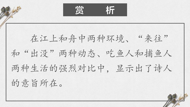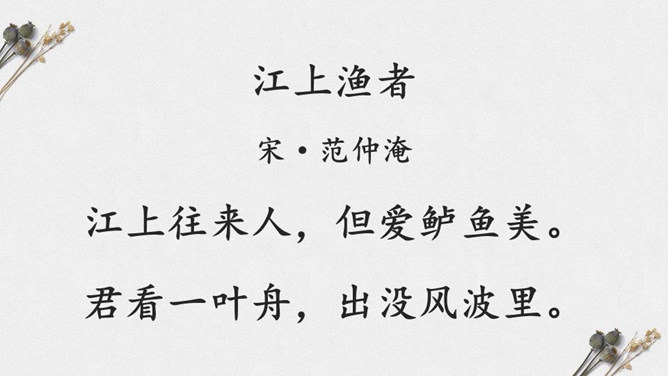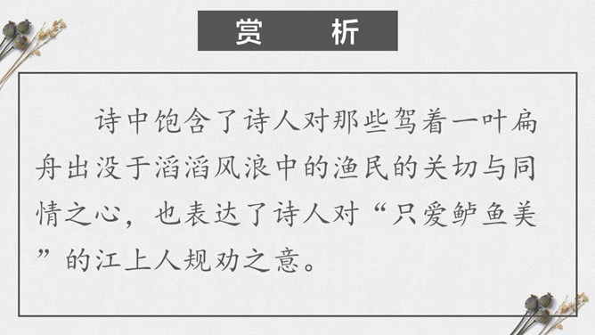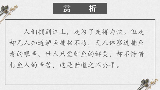 这首诗语言质朴、形象生动,全诗仅二十个字,但言近而旨远,词浅而意深,可以引发丰富的联想。有“谁知盘中餐,粒粒皆辛苦”(李绅《悯农二首》)之意,蕴含作者“先天下之忧而忧,后天下之乐而乐”的思想。首句说江岸上人来人往,熙熙攘攘,十分热闹。自然引出第二句。原来人们往来江上的目的是“但爱鲈鱼美”。但爱,即只爱。鲈鱼体扁狭,头大鳞细,味道鲜美。人们拥到江上,是为了先得为快。但是却无人知道鲈鱼捕捉不易,无人体察过捕鱼者的艰辛。世人只爱鲈鱼的鲜美,却不怜惜打鱼人的辛苦,这是世道之不公平。所属专题:江上渔者ppt。