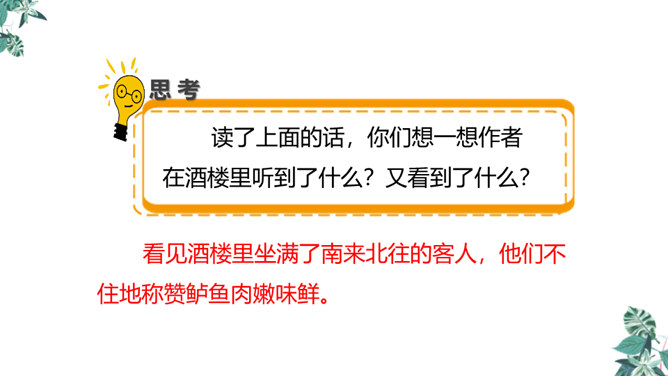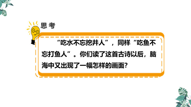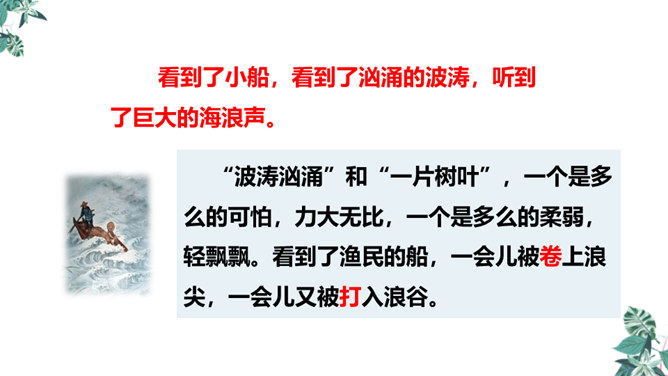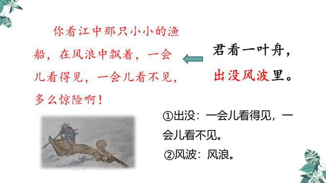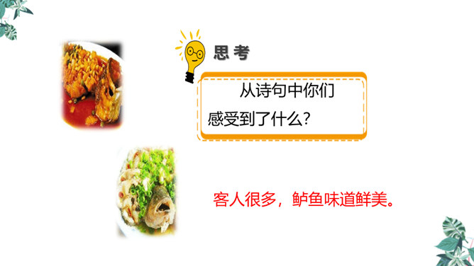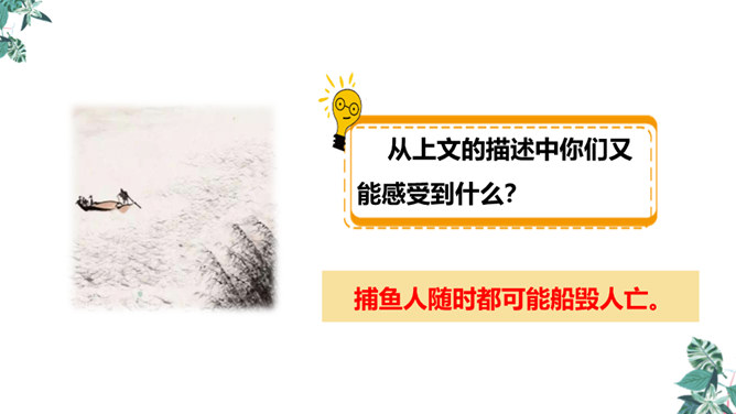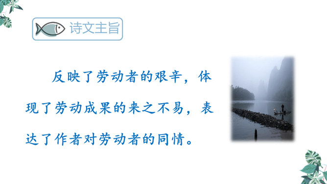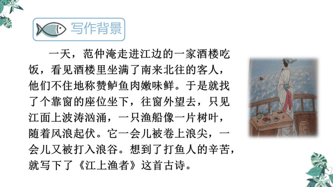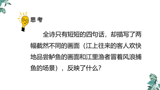 全诗只有短短的四句话,却描写了两幅截然不同的画面(江上往来的客人欢快地品尝鲈鱼的画面和江里渔者冒着风浪捕鱼的场景),反映了什么?反映了劳动者的艰辛,体现了劳动成果的来之不易,表达了作者对劳动者的同情。这首诗通过描写江上往来的客人欢快地品尝鲈鱼的画面和江里渔者冒着风浪捕鱼的场景,反映了劳动者的艰辛,体现了劳动成果的来之不易,表达了作者对劳动者的同情。所属专题:江上渔者ppt。