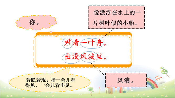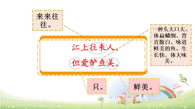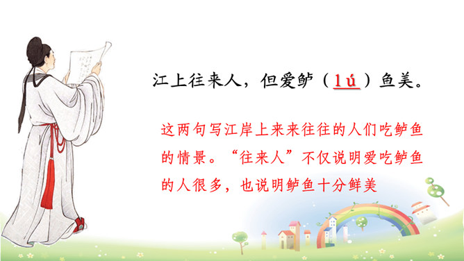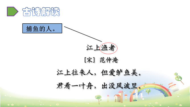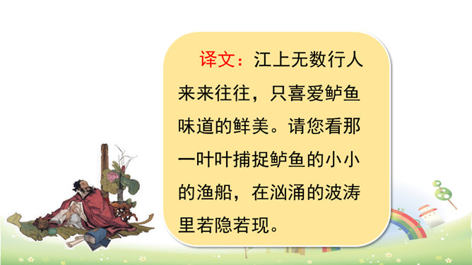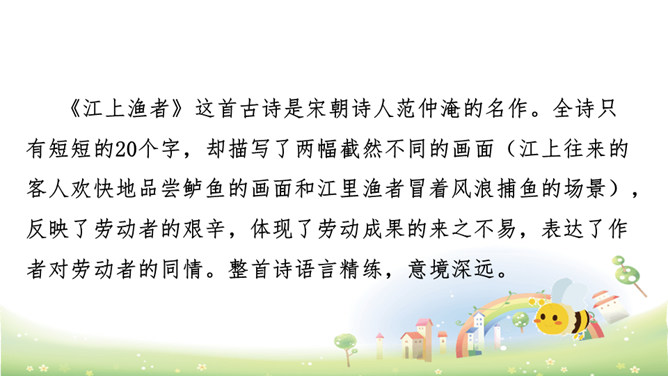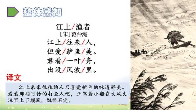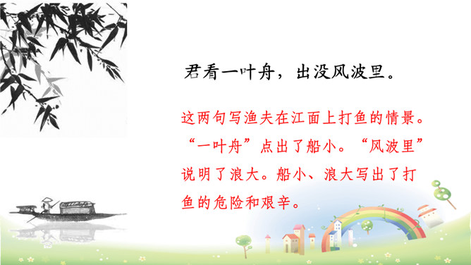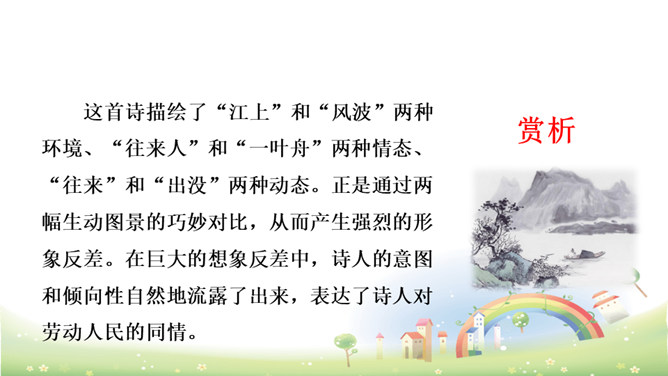 这首诗描绘了“江上”和“风波”两种环境、“往来人”和“一叶舟”两种情态、“往来”和“出没”两种动态。正是通过两幅生动图景的巧妙对比,从而产生强烈的形象反差。在巨大的想象反差中,诗人的意图和倾向性自然地流露了出来,表达了诗人对劳动人民的同情。全诗只有短短的20个字,却描写了两幅截然不同的画面(江上往来的客人欢快地品尝鲈鱼的画面和江里渔者冒着风浪捕鱼的场景),反映了劳动者的艰辛。所属专题:江上渔者ppt。