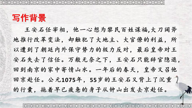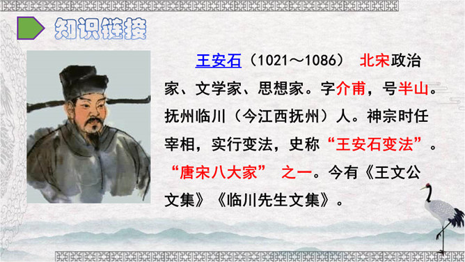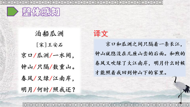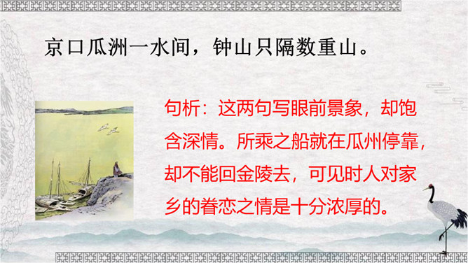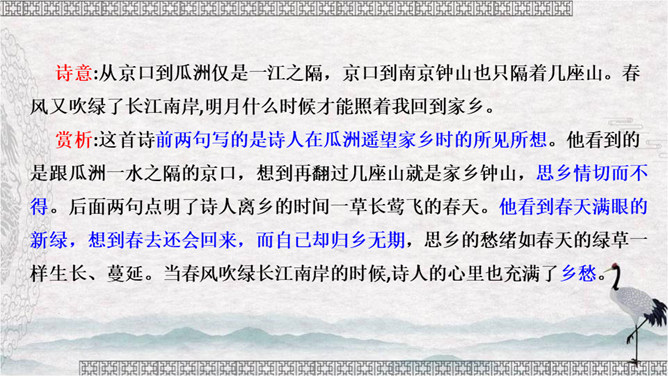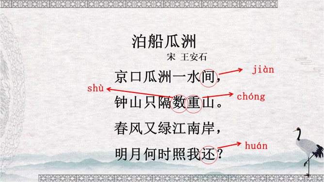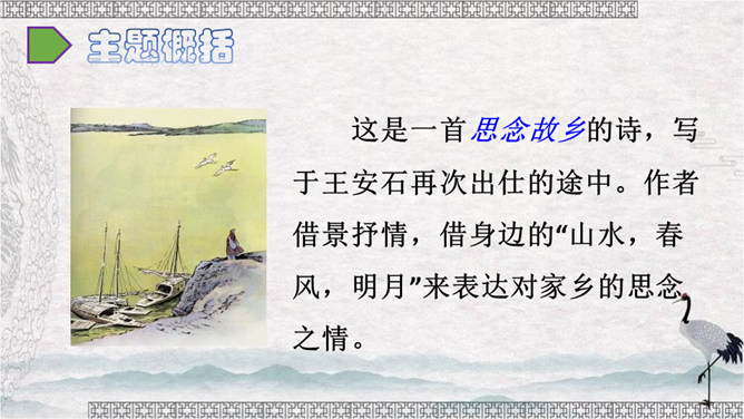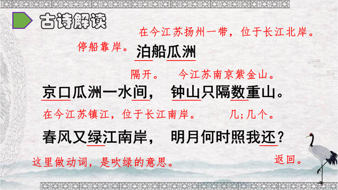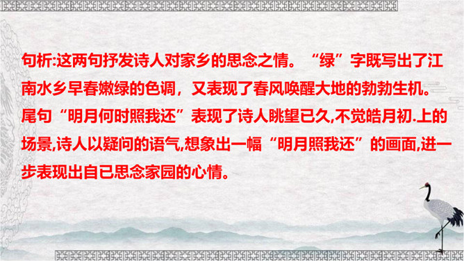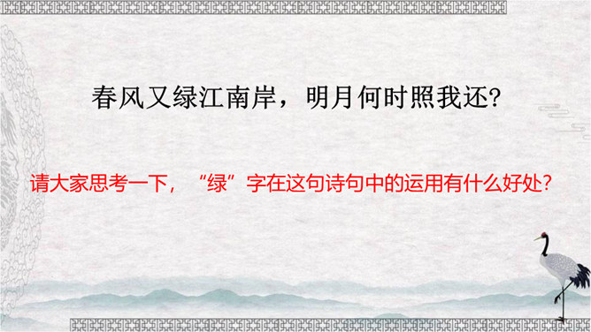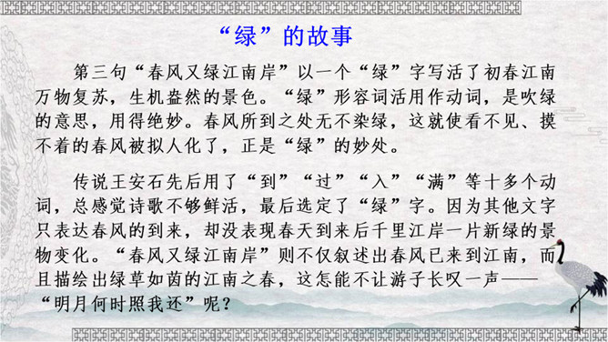 第三句“春风又绿江南岸”以一个“绿”字写活了初春江南万物复苏,生机盎然的景色。“绿”形容词活用作动词,是吹绿的意思,用得绝妙。春风所到之处无不染绿,这就使看不见、摸不着的春风被拟人化了,正是“绿”的妙处。传说王安石先后用了“到”“过”“入”“满”等十多个动词,总感觉诗歌不够鲜活,最后选定了“绿”字。因为其他文字只表达春风的到来,却没表现春天到来后千里江岸一片新绿的景物变化。所属专题:泊船瓜洲ppt。