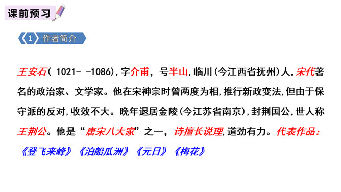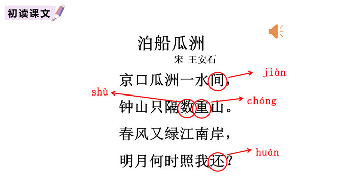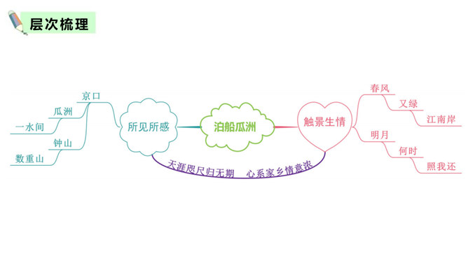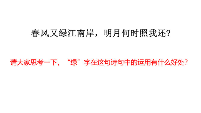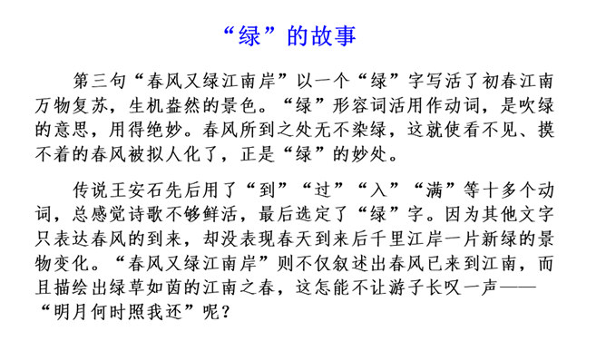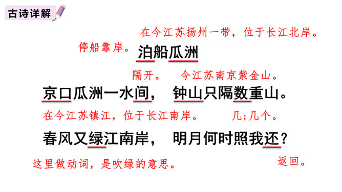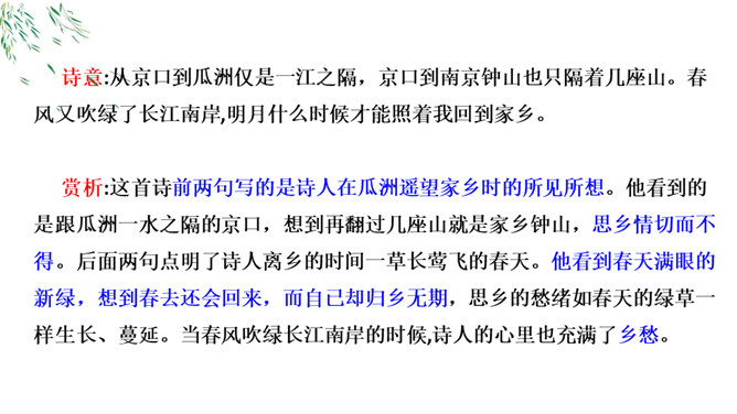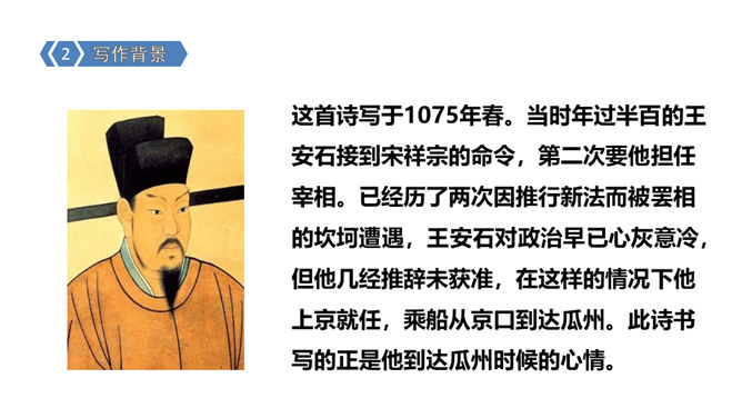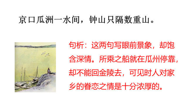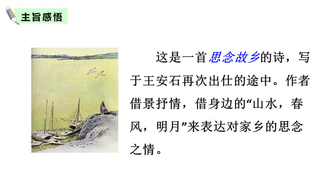 这首诗写于1075年春。当时年过半百的王安石接到宋祥宗的命令,第二次要他担任宰相。已经历了两次因推行新法而被罢相的坎坷遭遇,王安石对政治早已心灰意冷,但他几经推辞未获准,在这样的情况下他上京就任,乘船从京口到达瓜州。此诗书写的正是他到达瓜州时候的心情。这两句写眼前景象,却饱含深情。所乘之船就在瓜州停靠,却不能回金陵去,可见时人对家乡的眷恋之情是十分浓厚的。所属专题:泊船瓜洲ppt。