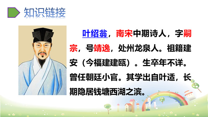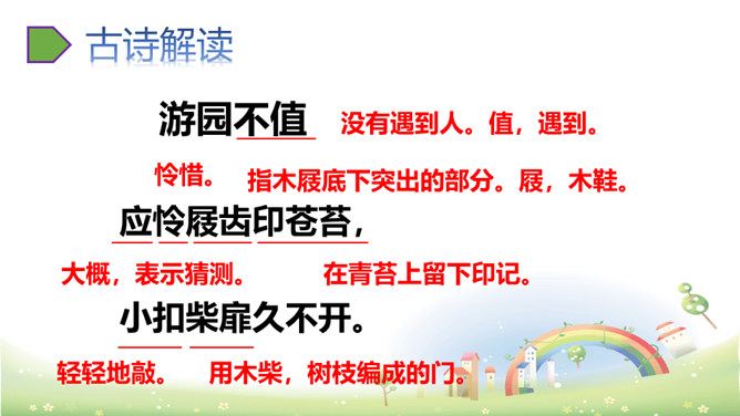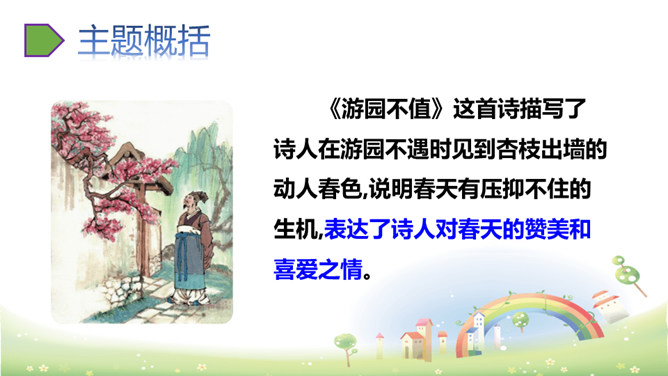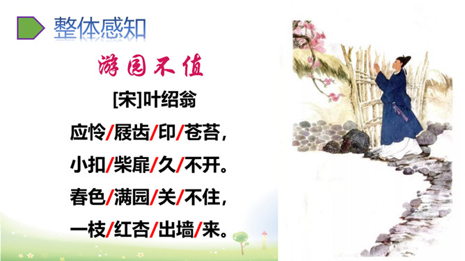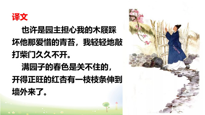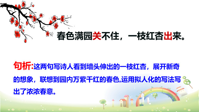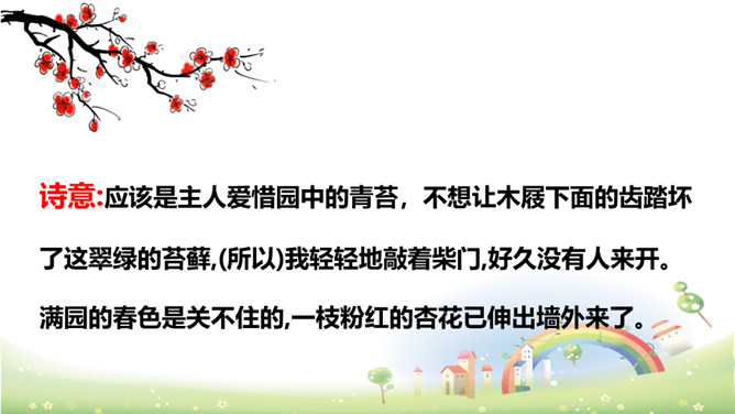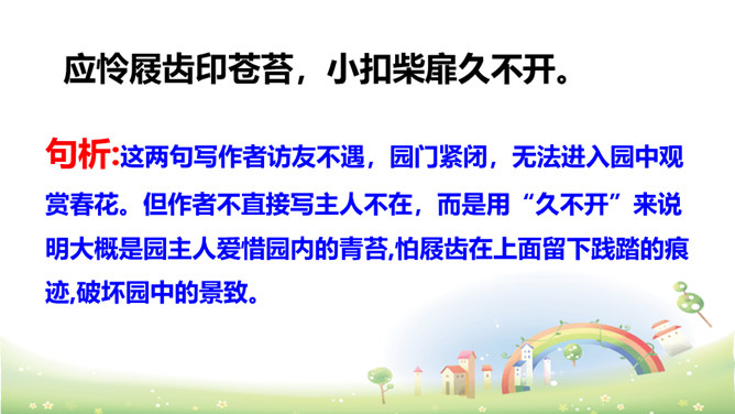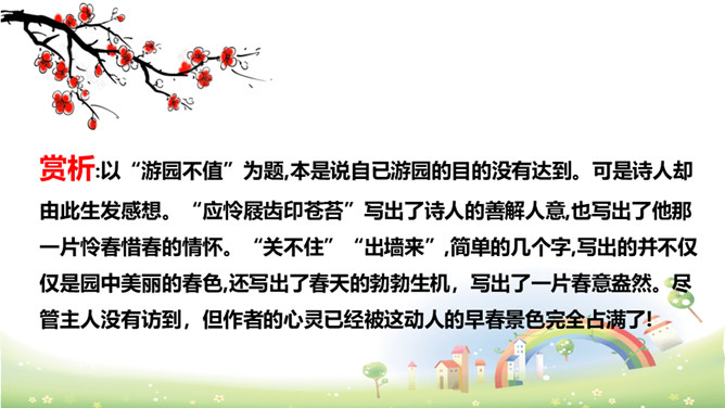 这两句写作者访友不遇,园门紧闭,无法进入园中观赏春花。但作者不直接写主人不在,而是用“久不开”来说明大概是园主人爱惜园内的青苔,怕屐齿在上面留下践踏的痕迹,破坏园中的景致。这两句写诗人看到墙头伸出的一枝红杏,展开新奇的想象,联想到园内万紫千红的春色,运用拟人化的写法写出了浓浓春意。本是说自已游园的目的没有达到。可是诗人却由此生发感想。尽管主人没有访到,但作者的心灵已经被这动人的早春景色完全占满了!所属专题:游园不值ppt。