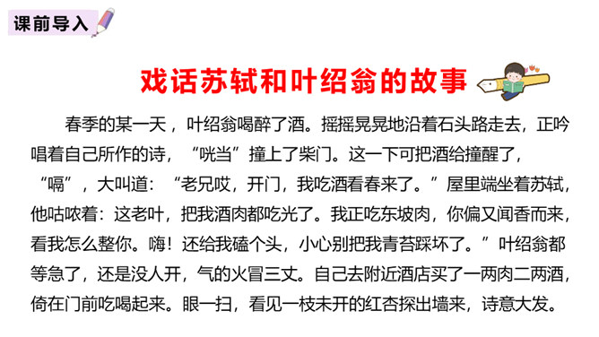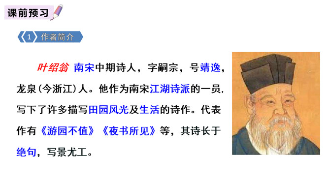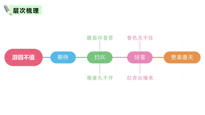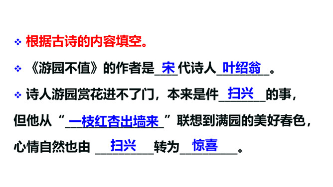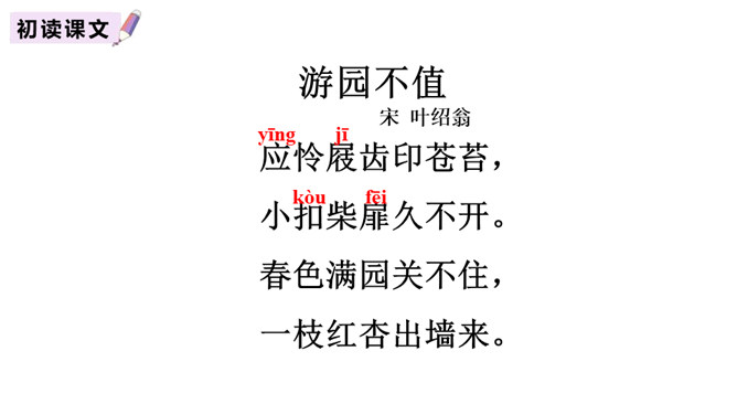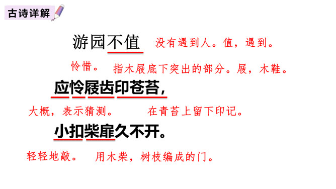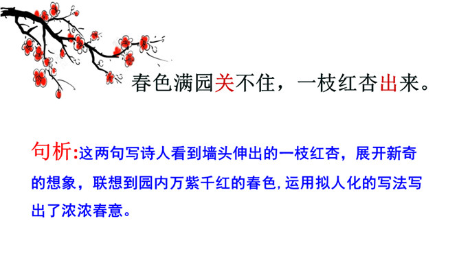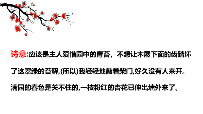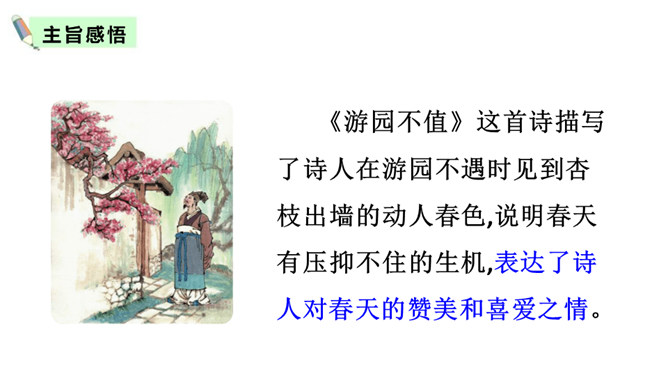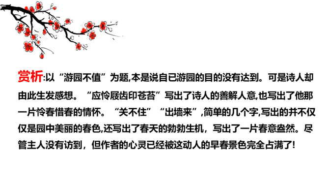 赏析:以“游园不值”为题,本是说自已游园的目的没有达到。可是诗人却由此生发感想。“应怜屐齿印苍苔”写出了诗人的善解人意,也写出了他那一片怜春惜春的情怀。“关不住”“出墙来”,简单的几个字,写出的并不仅仅是园中美丽的春色,还写出了春天的勃勃生机,写出了一片春意盎然。尽管主人没有访到,但作者的心灵已经被这动人的早春景色完全占满了!这首诗描写了诗人在游园不遇时见到杏枝出墙的动人春色,说明春天有压抑不住的生机。所属专题:游园不值ppt。