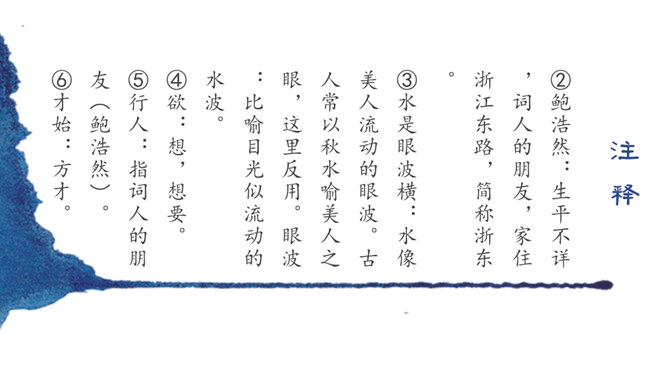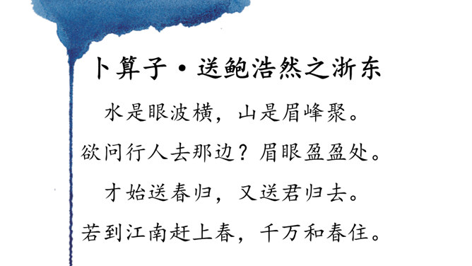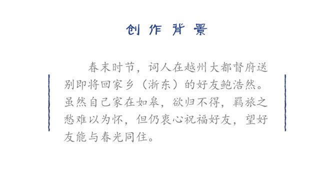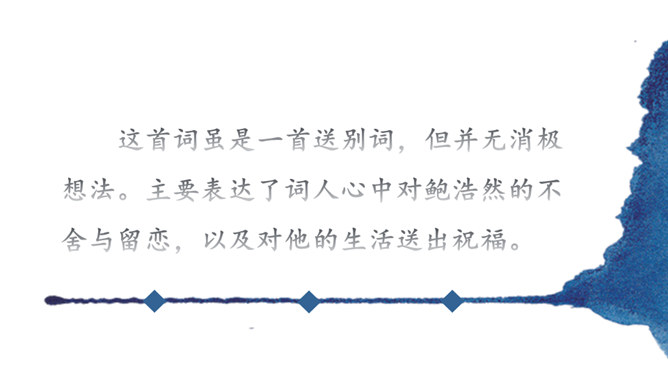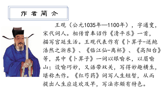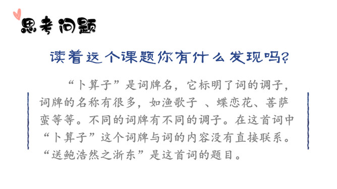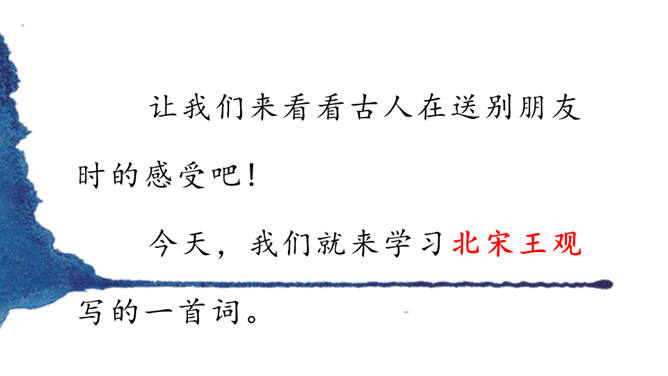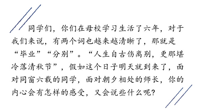同学们,你们在母校学习生活了六年,对于我们来说,有两个词也越来越清晰了,那就是“毕业”“分别”。“人生自古伤离别,更那堪冷落清秋节”,假如这个日子明天就到来了,面对同窗六载的同学,面对朝夕相处的师长,你的内心会有怎样的感受,又会说些什么呢?让我们来看看古人在送别朋友时的感受吧!今天,我们就来学习北宋王观写的一首词。表达了词人心中对鲍浩然的不舍与留恋,以及对他的生活送出祝福。所属专题:卜算子·送鲍浩然之浙东ppt。