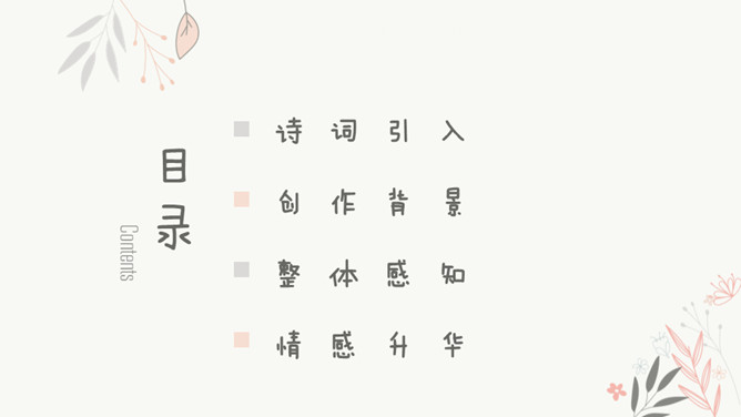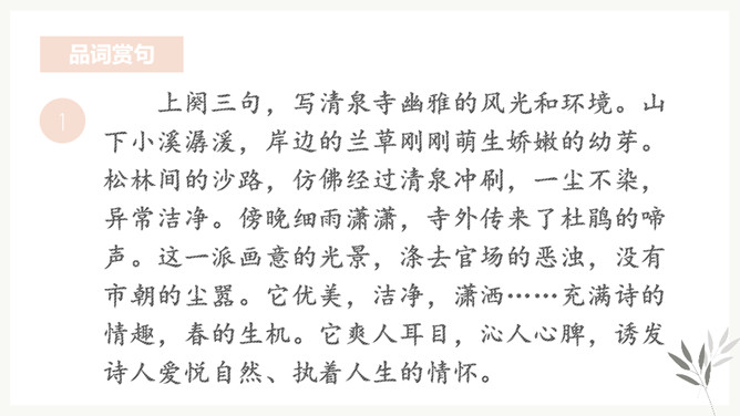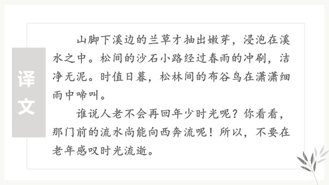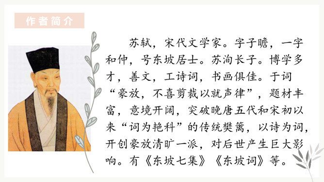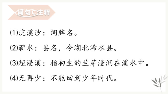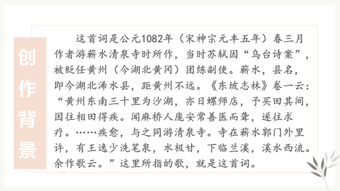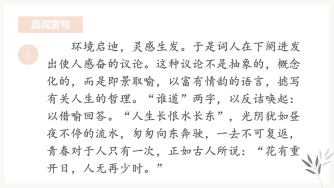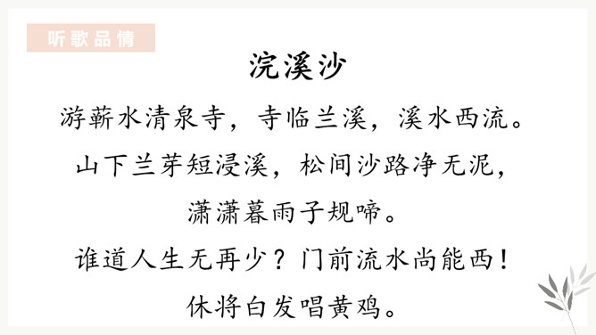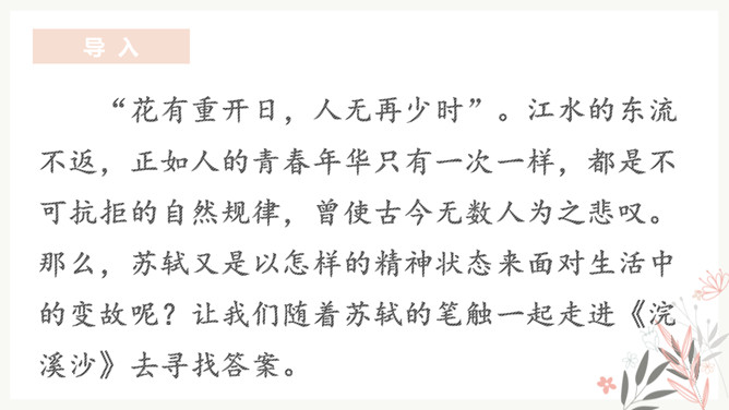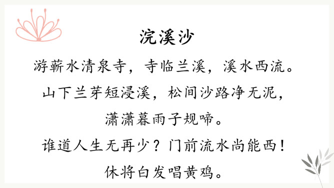 “花有重开日,人无再少时”。江水的东流不返,正如人的青春年华只有一次一样,都是不可抗拒的自然规律,曾使古今无数人为之悲叹。那么,苏轼又是以怎样的精神状态来面对生活中的变故呢?让我们随着苏轼的笔触一起走进《浣溪沙》去寻找答案。环境启迪,灵感生发。于是词人在下阕进发出使人感奋的议论。这种议论不是抽象的,概念化的,而是即景取喻,以富有情韵的语言,摅写有关人生的哲理。所属专题:浣溪沙ppt。