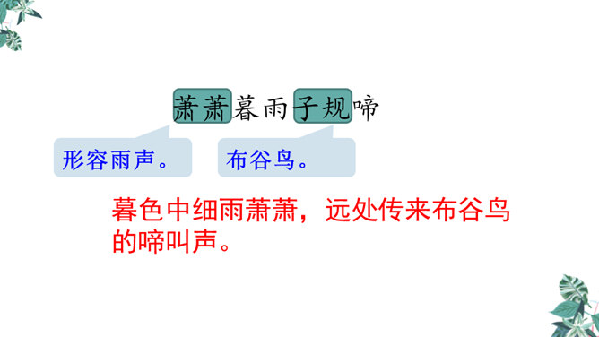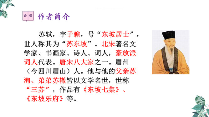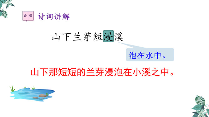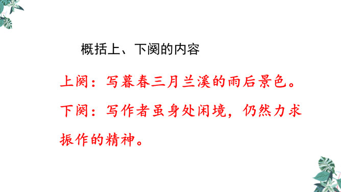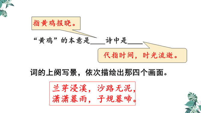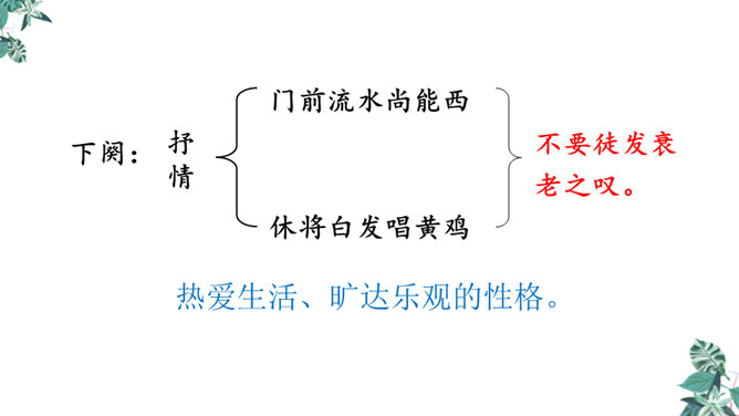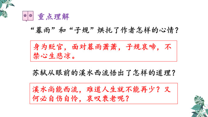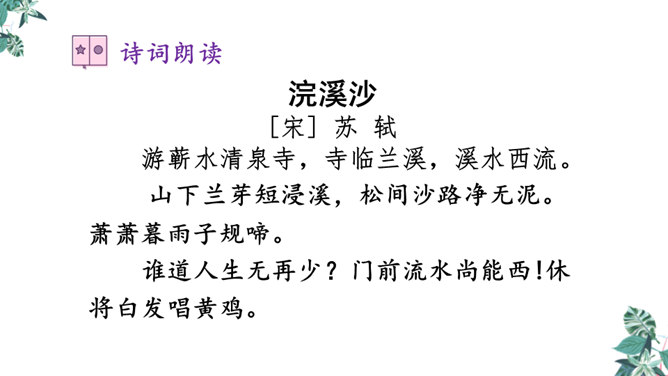 概括上、下阕的内容 。上阕:写暮春三月兰溪的雨后景色。下阕:写作者虽身处闲境,仍然力求振作的精神。“暮雨”和“子规”烘托了作者怎样的心情? 身为贬官,面对暮雨萧萧,子规哀啼,不禁心生悲凉。苏轼从眼前的溪水西流悟出了怎样的道理?溪水尚能西流,难道人生就不能再少?又何必自伤自怜,哀叹衰老呢?热爱生活、旷达乐观的性格。所属专题:浣溪沙ppt。