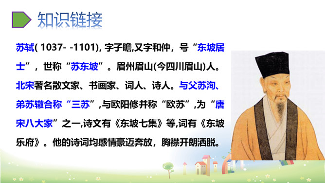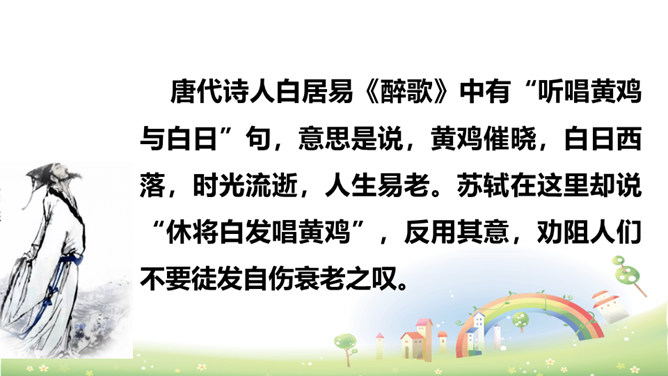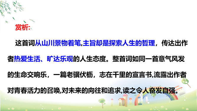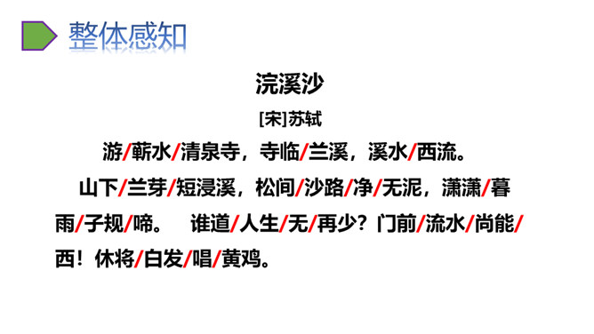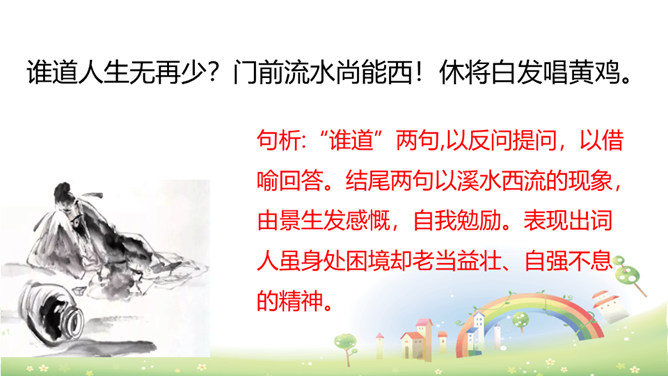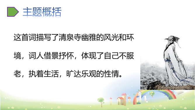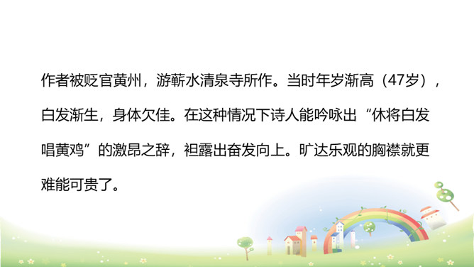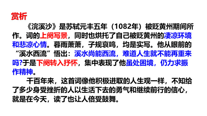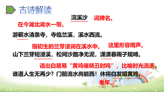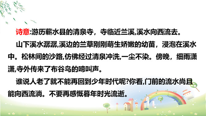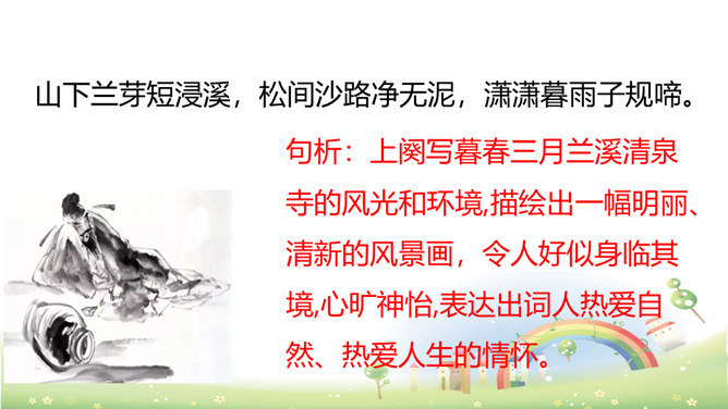 上阕写暮春三月兰溪清泉寺的风光和环境,描绘出一幅明丽、清新的风景画,令人好似身临其境,心旷神怡,表达出词人热爱自然、热爱人生的情怀。“谁道”两句,以反问提问,以借喻回答。结尾两句以溪水西流的现象,由景生发感慨,自我勉励。表现出词人虽身处困境却老当益壮、自强不息的精神。山下溪水潺潺,溪边的兰草刚刚萌生娇嫩的幼苗,浸泡在溪水中。松林间的沙路,仿佛经过清泉冲洗,一尘不染。傍晚,细雨潇潇,寺外传来了布谷鸟的啼叫声。所属专题:浣溪沙ppt。