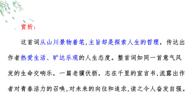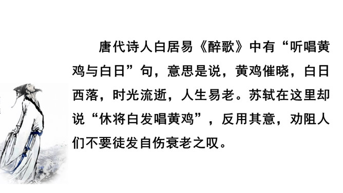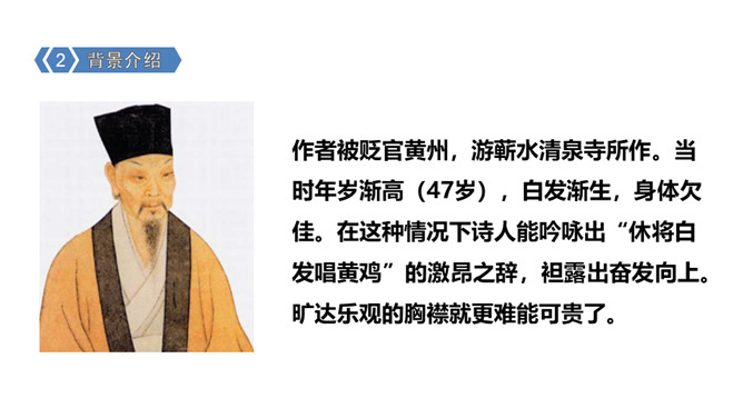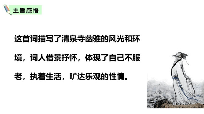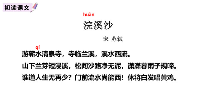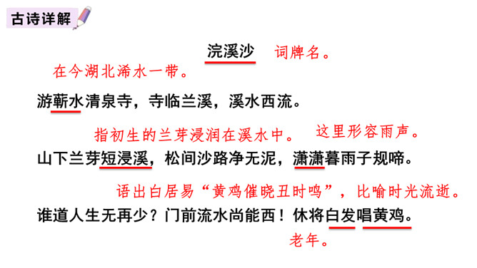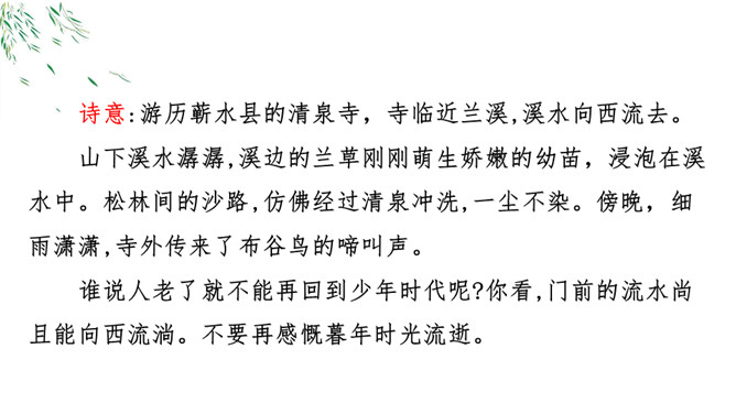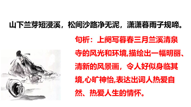 诗意:游历蕲水县的清泉寺,寺临近兰溪,溪水向西流去。山下溪水潺潺,溪边的兰草刚刚萌生娇嫩的幼苗,浸泡在溪水中。松林间的沙路,仿佛经过清泉冲洗,一尘不染。傍晚,细雨潇潇,寺外传来了布谷鸟的啼叫声。谁说人老了就不能再回到少年时代呢?你看,门前的流水尚且能向西流淌。不要再感慨暮年时光流逝。唐代诗人白居易《醉歌》中有“听唱黄鸡与白日”句,意思是说,黄鸡催晓,白日西落,时光流逝,人生易老。苏轼在这里却说“休将白发唱黄鸡”,反用其意,劝阻人们不要徒发自伤衰老之叹。所属专题:浣溪沙ppt。