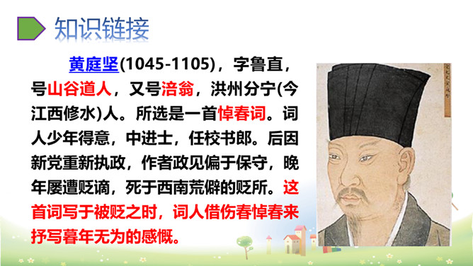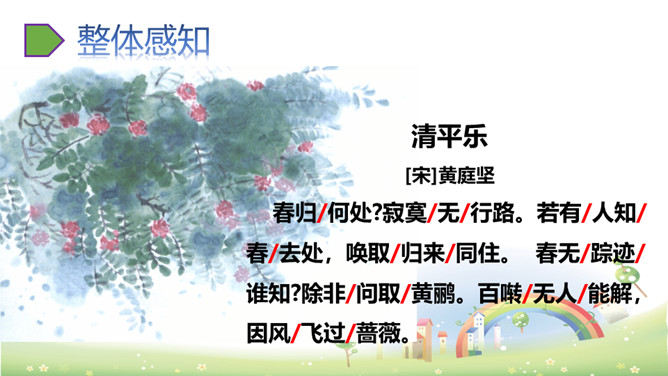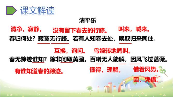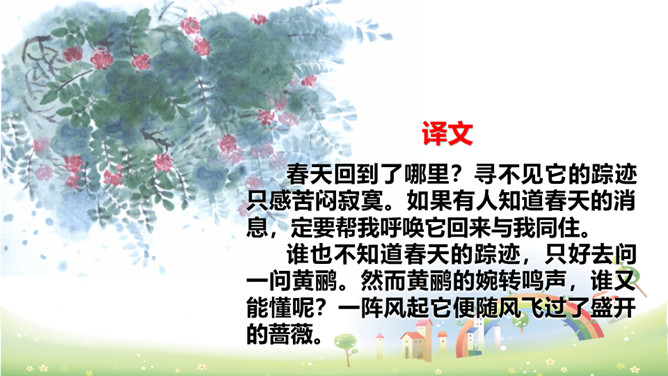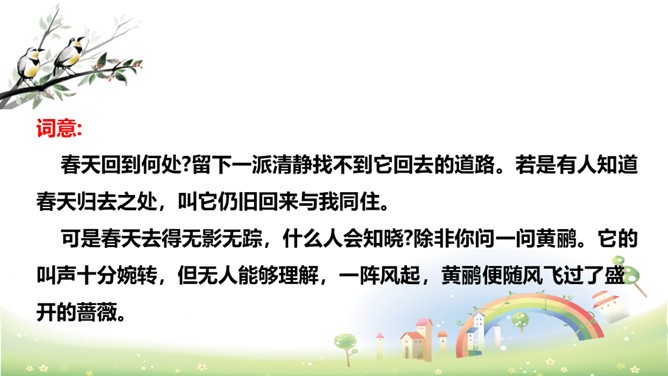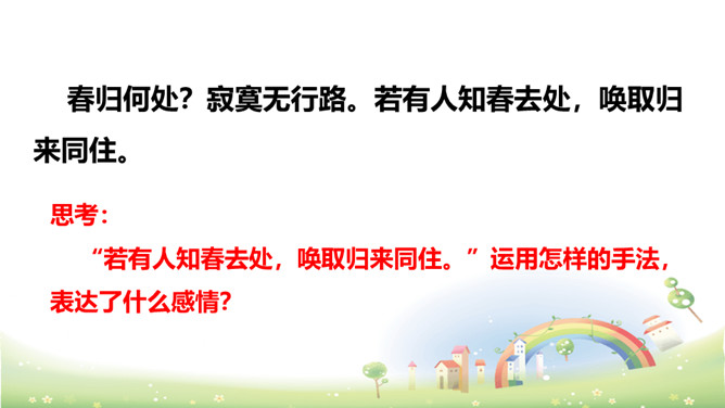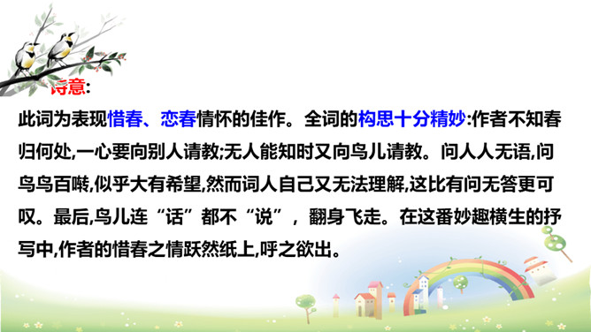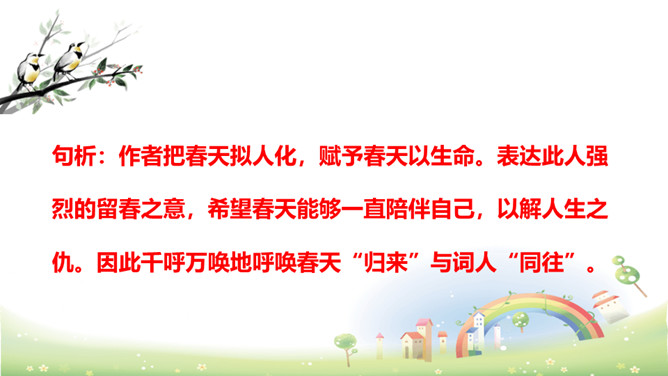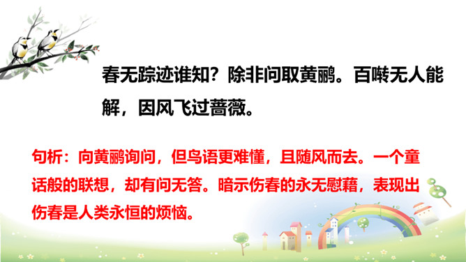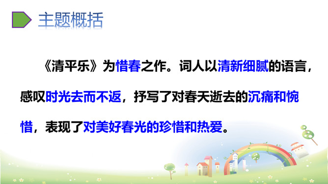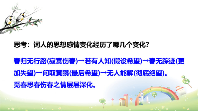 思考:“若有人知春去处,唤取归来同住。”运用怎样的手法,表达了什么感情?析:作者把春天拟人化,赋予春天以生命。表达此人强烈的留春之意,希望春天能够一直陪伴自己,以解人生之仇。因此千呼万唤地呼唤春天“归来”与词人“同往”。向黄鹂询问,但鸟语更难懂,且随风而去。一个童话般的联想,却有问无答。暗示伤春的永无慰藉,表现出伤春是人类永恒的烦恼。所属专题:清平乐ppt。