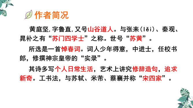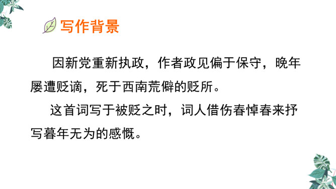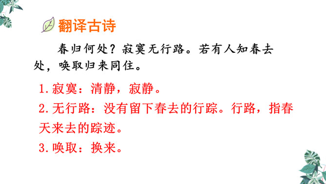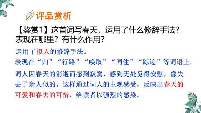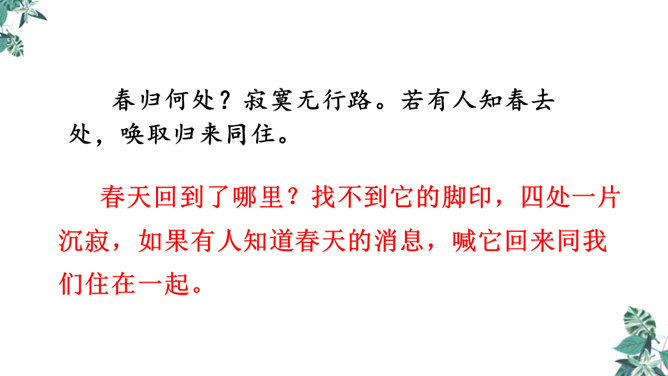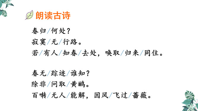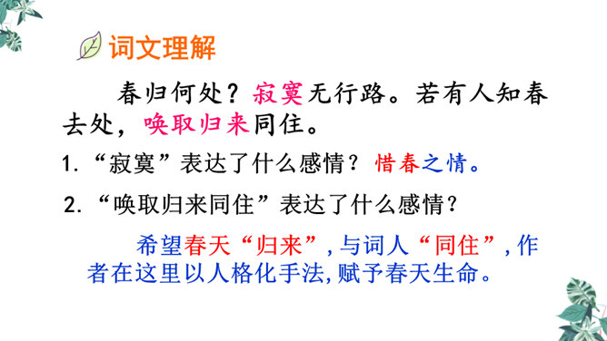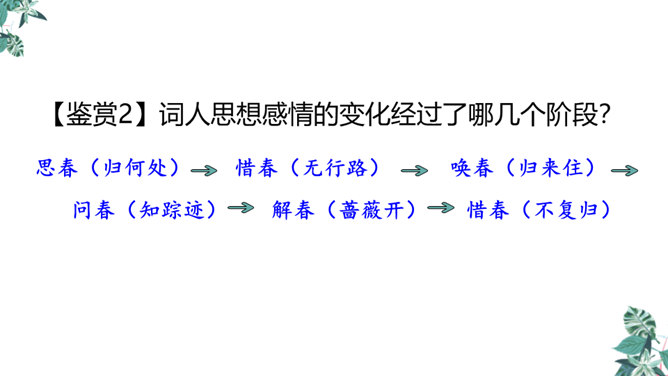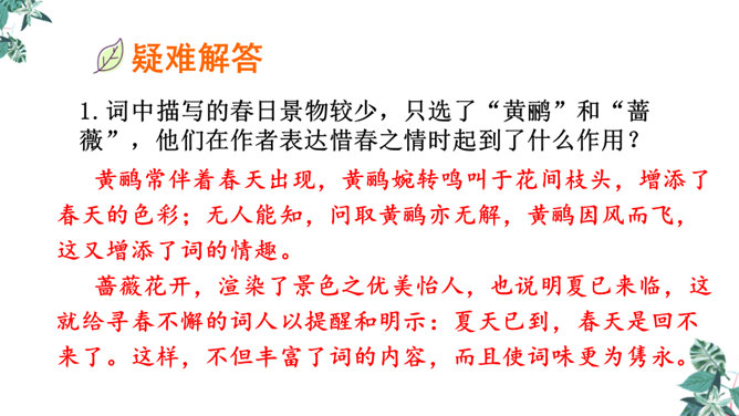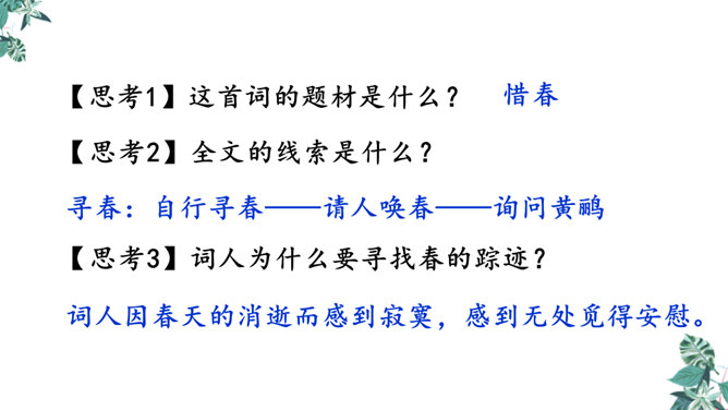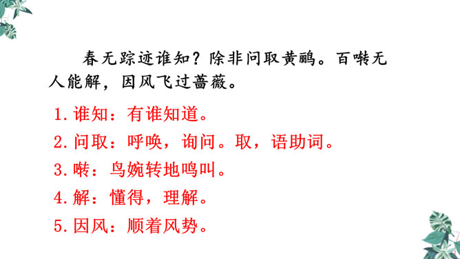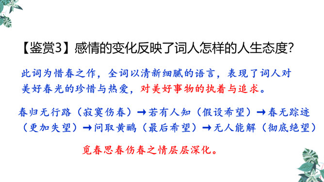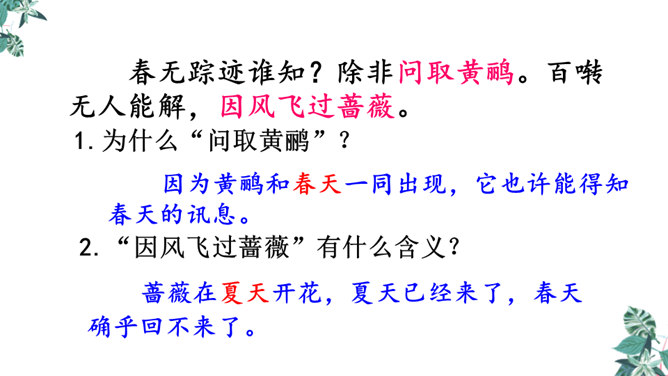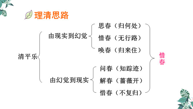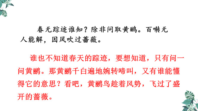 这是一首构思新颖、格调清奇的春之短歌。上片以发问起调。作者没有描写落花流水春残景象,也没有表现悼红惜绿的伤春情怀,只由问春而至寻春,其徘徊寂寞之情态,希冀驻日回景之衷肠已跃然纸上。下片以反问句承接,将惜春寻春之情,引入更奇妙的境界,黄鹂是春天的使者,她或能知道春天的踪迹。何不住问之?但人情鸟语难通,寻春愿望终成泡影。不仅春之芳踪仍无处寻觅,且黄鹂也乘风振翼,一去无迹,眼下只有春去夏来,蔷薇花开,词人的一腔芳菲之思,亦随鸟飞春尽而不知所终。所属专题:清平乐ppt。