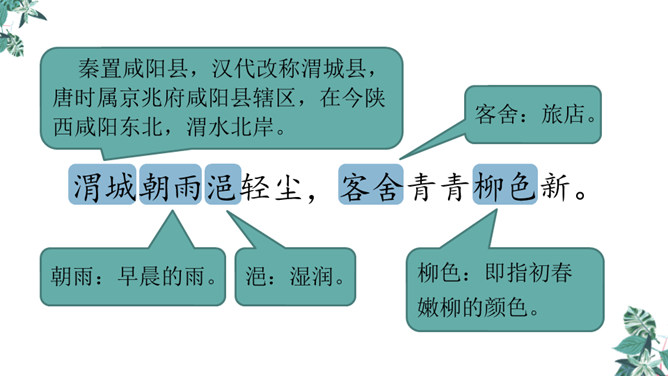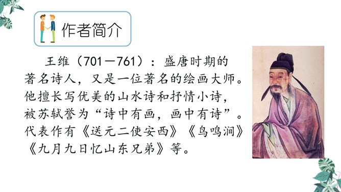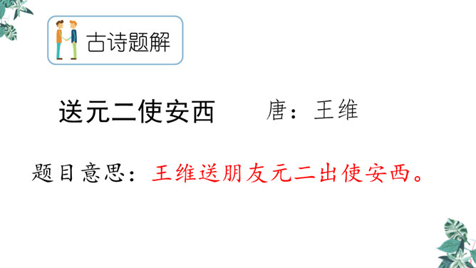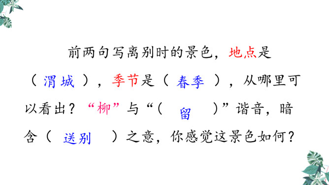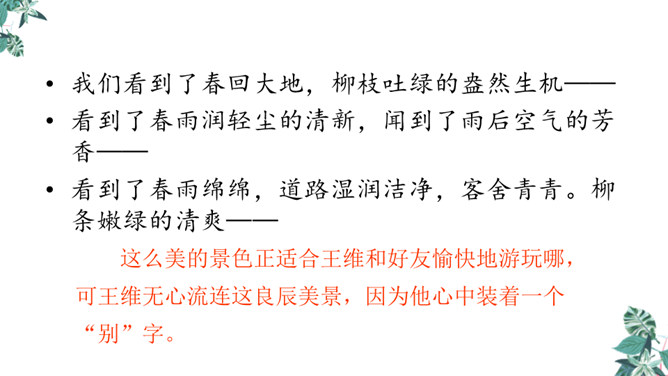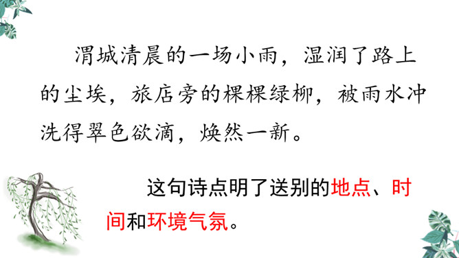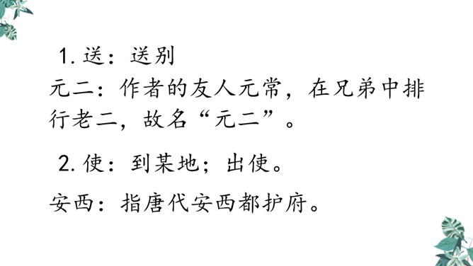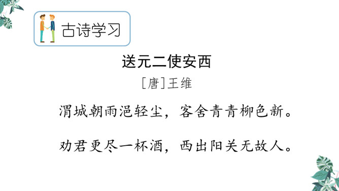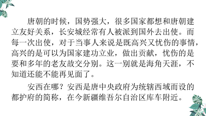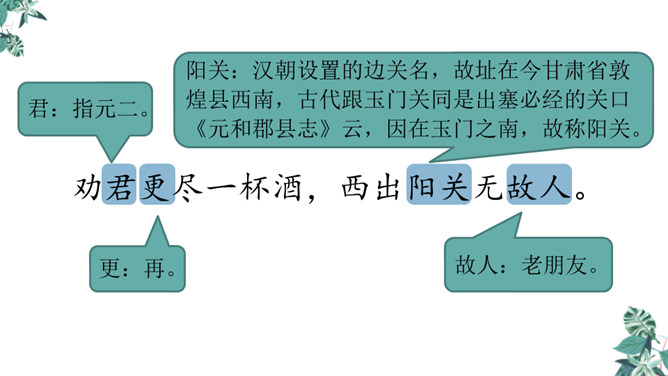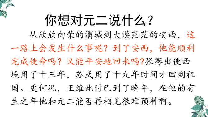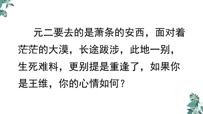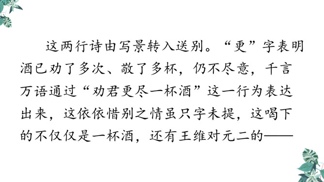 你想对元二说什么?从欣欣向荣的渭城到大漠茫茫的安西,这一路上会发生什么事呢?到了安西,他能顺利完成使命吗?又能平安地回来吗?张骞出使西域用了十三年,苏武用了十九年时间才回到祖国。更何况,王维此时已到了晚年,在他的有生之年他和元二能否再相见很难预料啊。这两行诗由写景转入送别。“更”字表明酒已劝了多次、敬了多杯,仍不尽意,千言万语通过“劝君更尽一杯酒”这一行为表达出来。