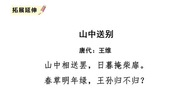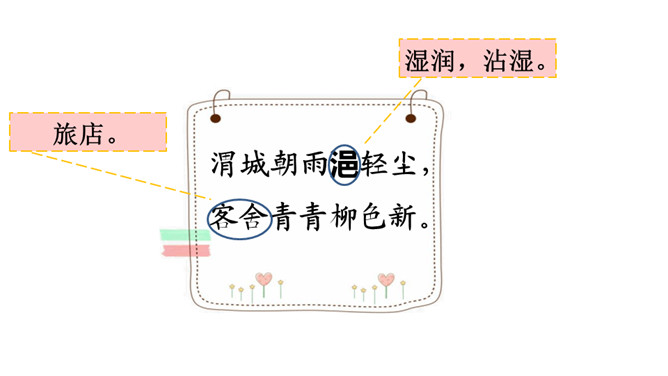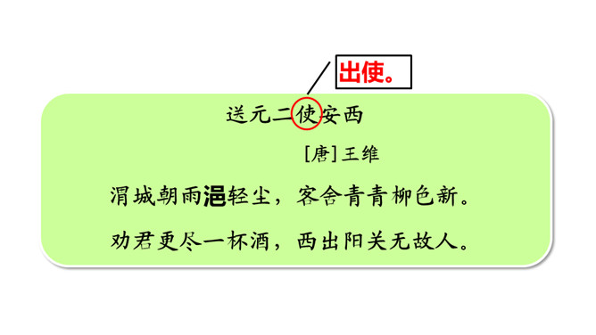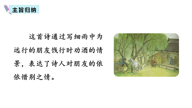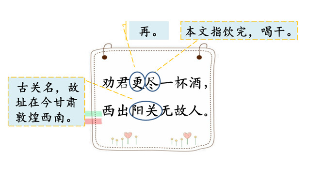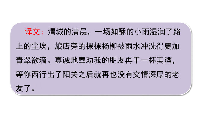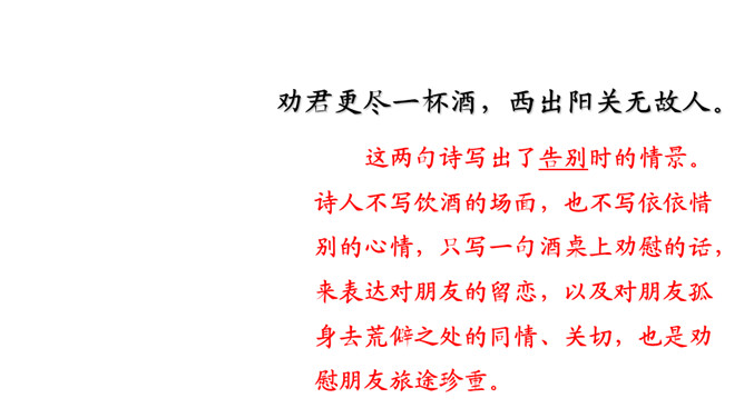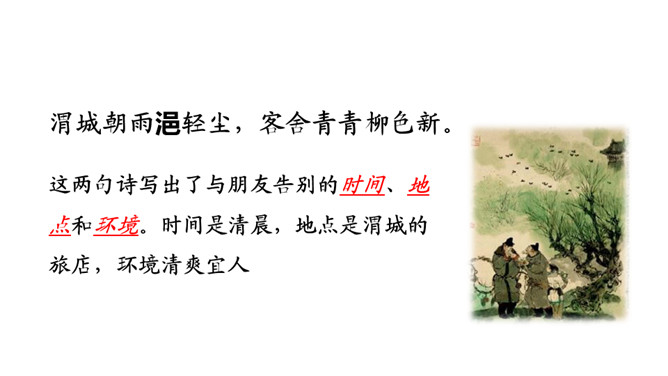 这两句诗写出了与朋友告别的时间、地点和环境。时间是清晨,地点是渭城的旅店,环境清爽宜人。这两句诗写出了告别时的情景。诗人不写饮酒的场面,也不写依依惜别的心情,只写一句酒桌上劝慰的话,来表达对朋友的留恋,以及对朋友孤身去荒僻之处的同情、关切,也是劝慰朋友旅途珍重。诗的前两句点明了送客的时间和地点。诗中用“浥”字形容雨湿尘埃,用“新”字形容柳色翠嫩,准确生动地抓住了事物的特点。