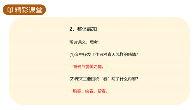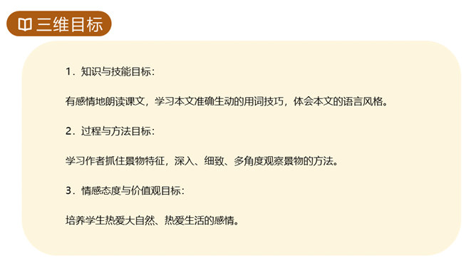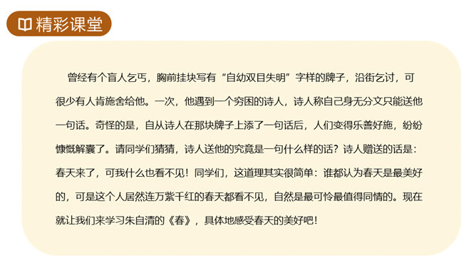 1.知识与技能目标:有感情地朗读课文,学习本文准确生动的用词技巧,体会本文的语言风格。2.过程与方法目标:学习作者抓住景物特征,深入、细致、多角度观察景物的方法。3.情感态度与价值观目标:培养学生热爱大自然、热爱生活的感情。曾经有个盲人乞丐,胸前挂块写有“自幼双目失明”字样的牌子,沿街乞讨,可很少有人肯施舍给他。一次,他遇到一个穷困的诗人,诗人称自己身无分文只能送他一句话。奇怪的是,自从诗人在那块牌子上添了一句话后,人们变得乐善好施,纷纷慷慨解囊了。请同学们猜猜,诗人送他的究竟是一句什么样的话?所属专题:春ppt。
