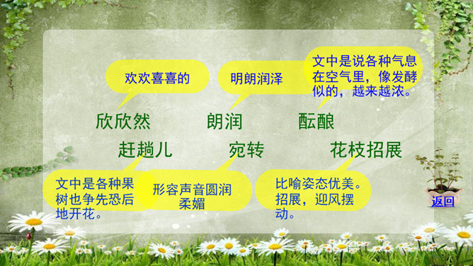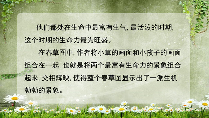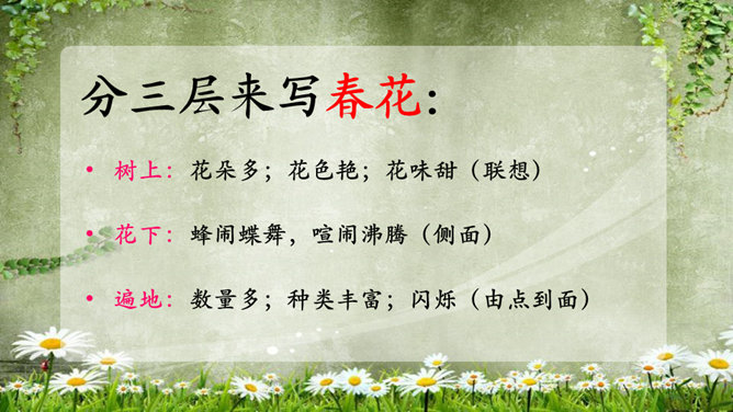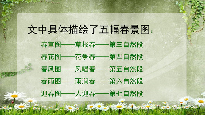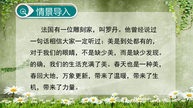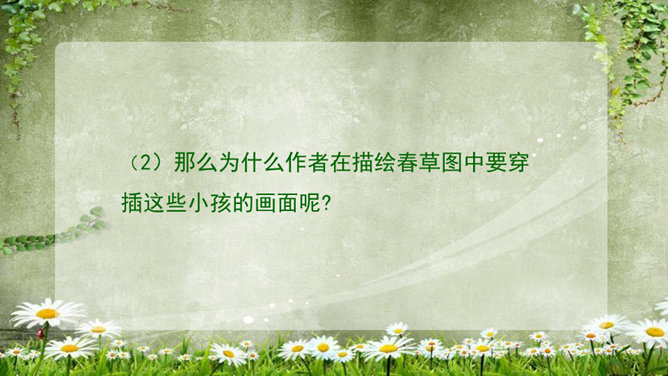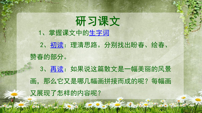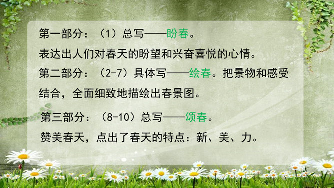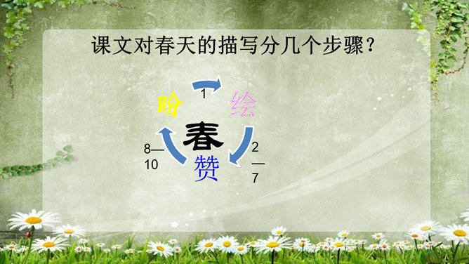 (1)为什么要连用两个“盼望着”,用一个不也同样可以表达作者期盼的心情?这种叠用,一方面表达了作者向往春天的急切和渴望的心情,另一方面,也把读者的心悬起来了,过这样一种叠用,作者在文章一开头不仅表达了自己急切和渴望的心情,而且将读者的心牢牢的抓住,使读者产生了浓厚的兴趣。(2)为什么只是春天的脚步近了,而不直接写春天到了,或者春天快到了?此时春天还没有到,所以一个“近”字非常准确.把春天拟人化,写它的脚步,仿佛一个你最喜欢的人在远处向你招手,缓缓地向你走来,一种欣喜之感油然而生,让人倍感亲切。所属专题:春ppt。