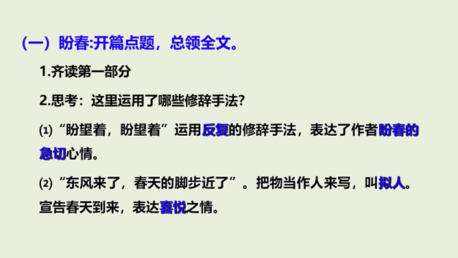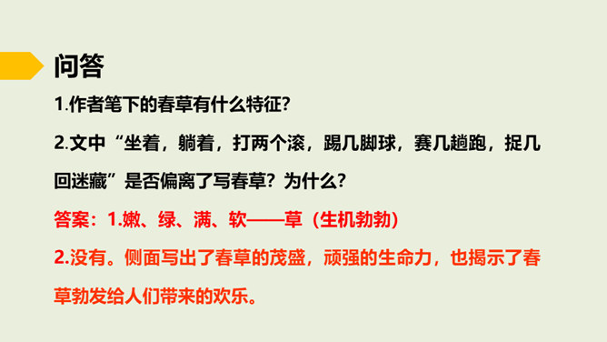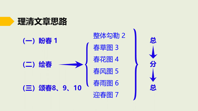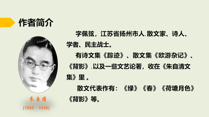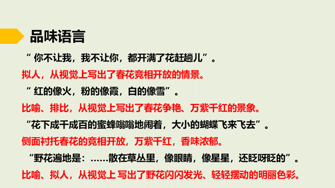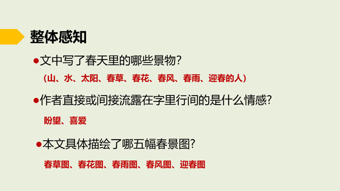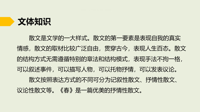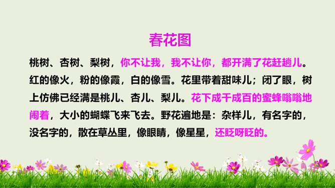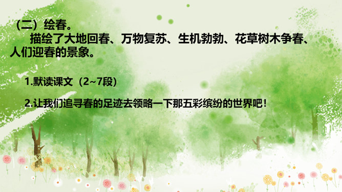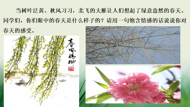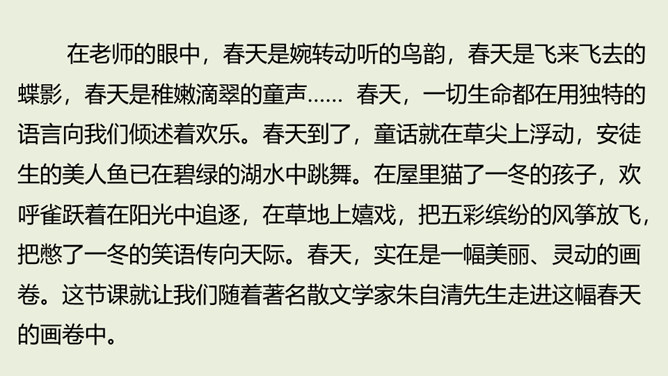 在老师的眼中,春天是婉转动听的鸟韵,春天是飞来飞去的蝶影,春天是稚嫩滴翠的童声…… 春天,一切生命都在用独特的语言向我们倾述着欢乐。春天到了,童话就在草尖上浮动,安徒生的美人鱼已在碧绿的湖水中跳舞。在屋里猫了一冬的孩子,欢呼雀跃着在阳光中追逐,在草地上嬉戏,把五彩缤纷的风筝放飞,把憋了一冬的笑语传向天际。春天,实在是一幅美丽、灵动的画卷。这节课就让我们随着著名散文学家朱自清先生走进这幅春天的画卷中。所属专题:春ppt。