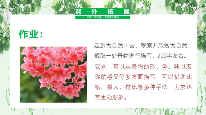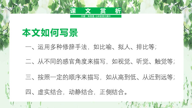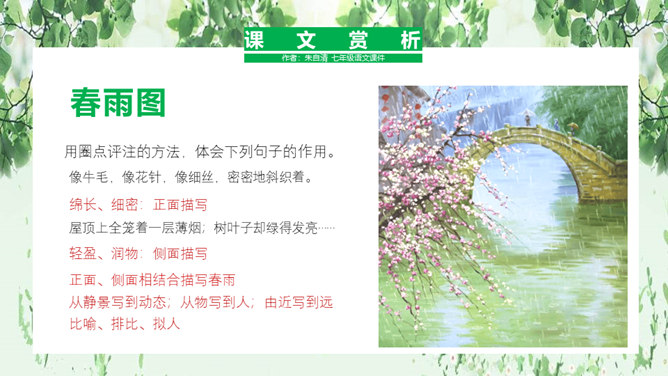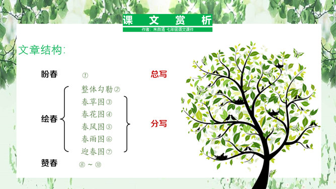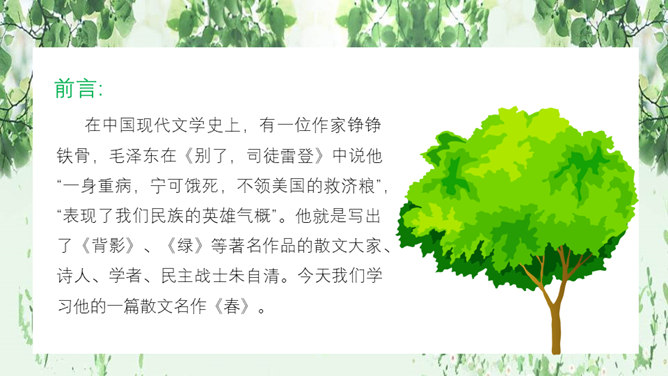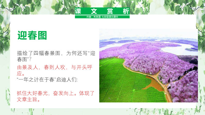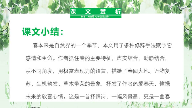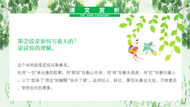如何写春天的?说说你的理解。这个自然段是宏观勾勒春天。先用“一切”画出春的轮廓。用“朗润”写春山光泽;用“涨”写春水涣涣。春本来是自然界的一个季节,本文用了多种修辞手法赋予它感情和生命。作者抓住春的主要特征,虚实结合,动静结合,从不同角度,用极富表现力的语言,描绘了春回大地、万物复苏、生机勃发、草木争荣的景象,抒发了作者热爱春天、憧憬未来的欣喜心情。这是一首抒情诗,一幅风景画,更是一曲春的赞歌。所属专题:春ppt。