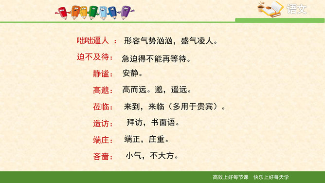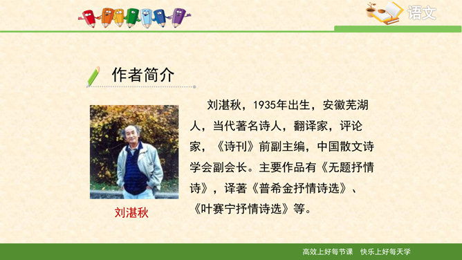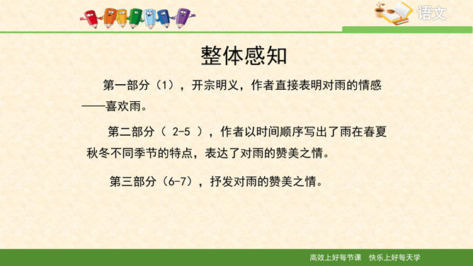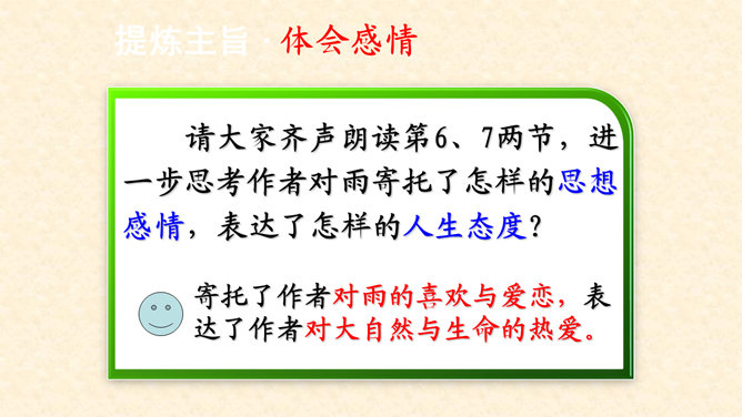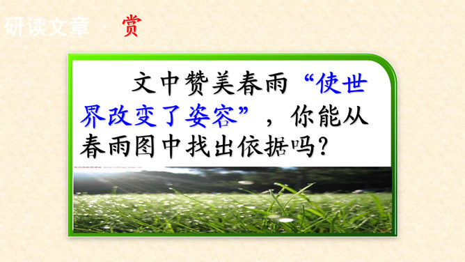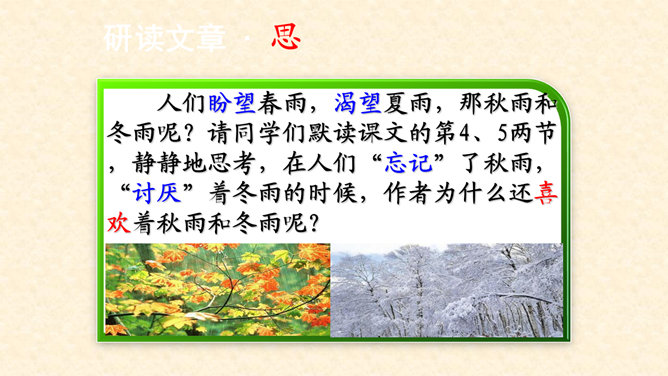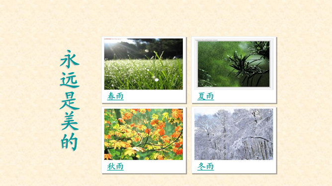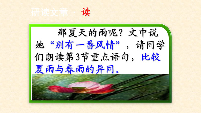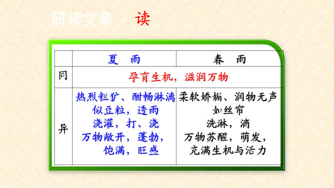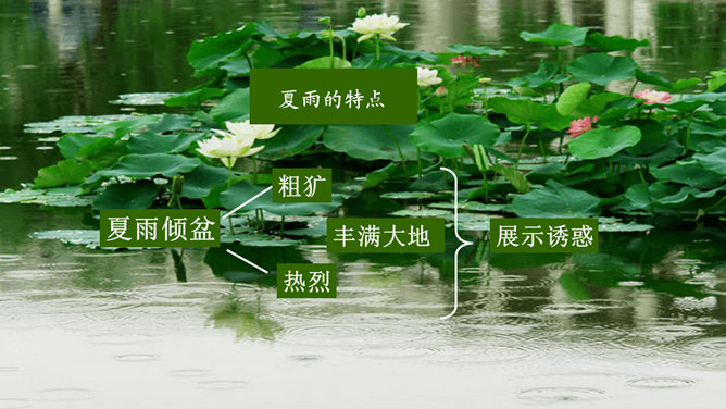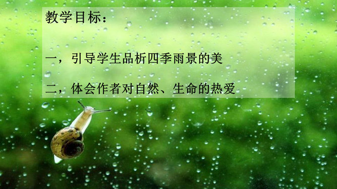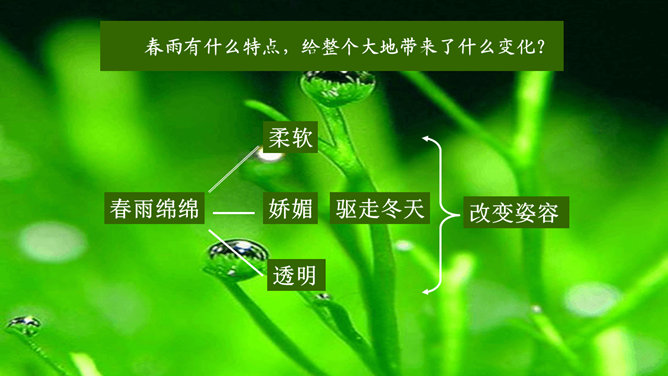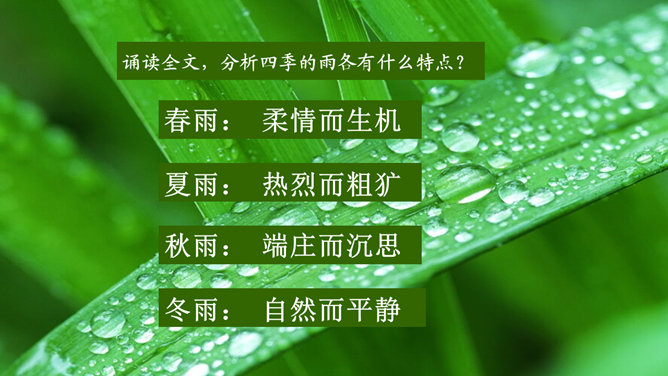 多美的文字啊!透过这美的文字我们更感受到了雨的春季那美的意境。在作者笔下没有生命的树生机盎然,没有情感的花意态娇羞,没有声音的成长沙沙作响,没有味道的空气四溢芳香。这种美源自自然,作者以细腻的笔触、秀美的文字向我们讲述着雨的春季。雨的春季被作者饱含温情乃至热情的情感化、人格化了,一支神来之笔借春雨点染了整个春天,一支升花之笔借春天写活了万物。美丽的春天被作者用美的语言描绘得淋漓尽致,我们通过分析“写了什么”“怎么写的”“好在哪里”领会了“春雨图”的语言美、意境美,课下请大家也用这种方法来分析“夏雨图”。所属专题:雨的四季ppt。