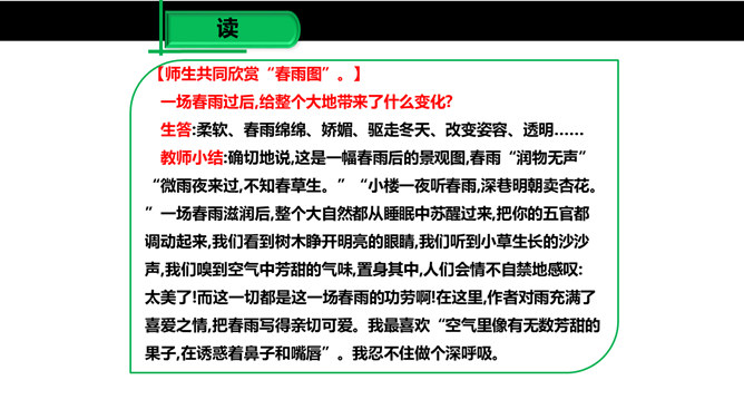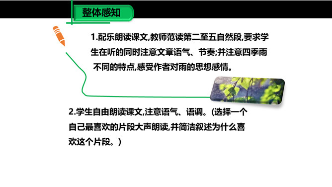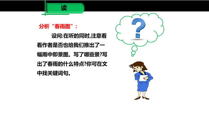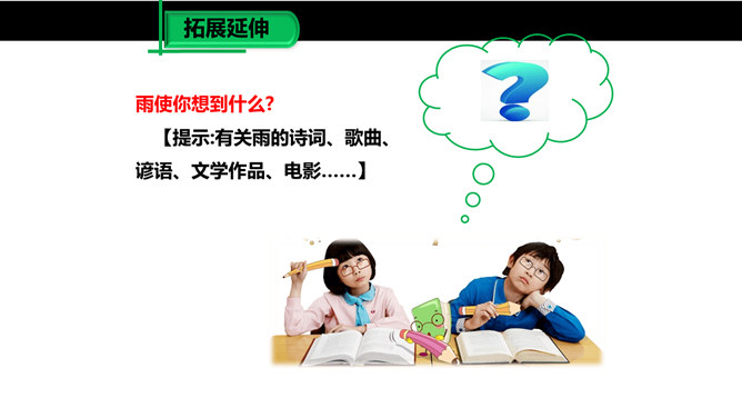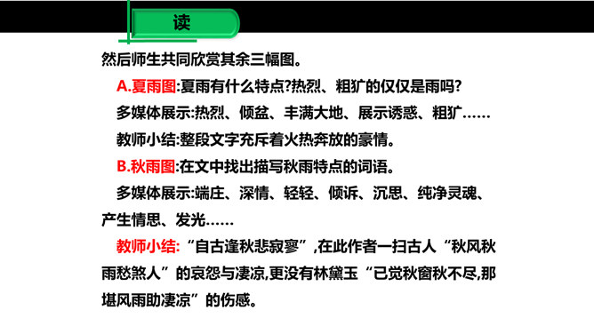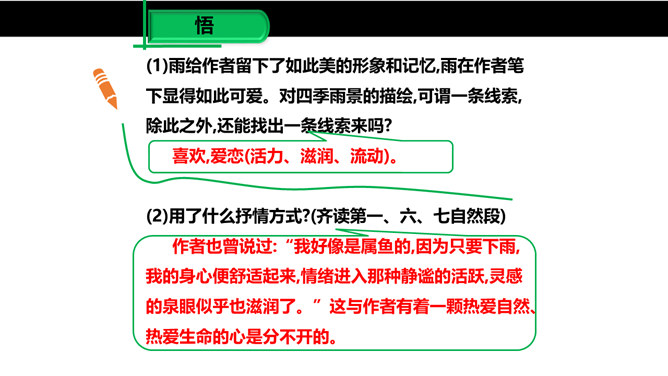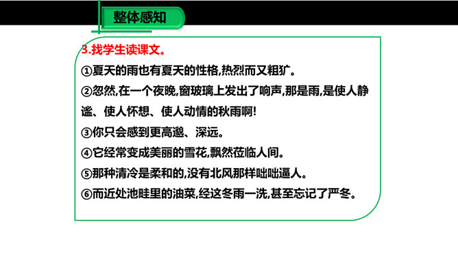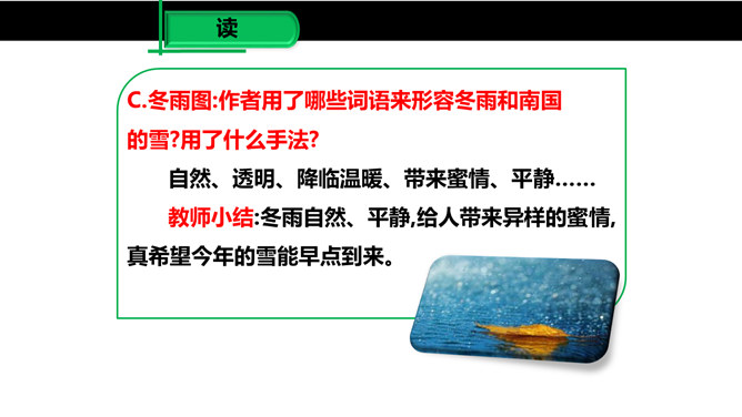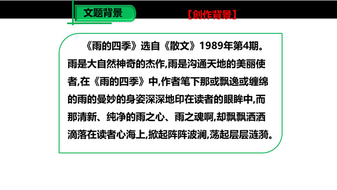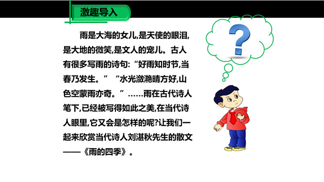 雨是大自然神奇的杰作,雨是沟通天地的美丽使者,作者笔下那或飘逸或缠绵的雨的曼妙的身姿深深地印在读者的眼眸中,而那清新、纯净的雨之心、雨之魂啊,却飘飘洒洒滴落在读者心海上,掀起阵阵波澜,荡起层层涟漪。雨给作者留下了如此美的形象和记忆,雨在作者笔下显得如此可爱。对四季雨景的描绘,可谓一条线索,除此之外,还能找出一条线索来吗?作者用了哪些词语来形容冬雨和南国的雪?用了什么手法?所属专题:雨的四季ppt。