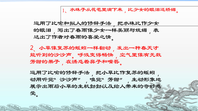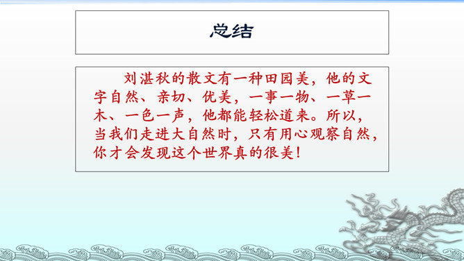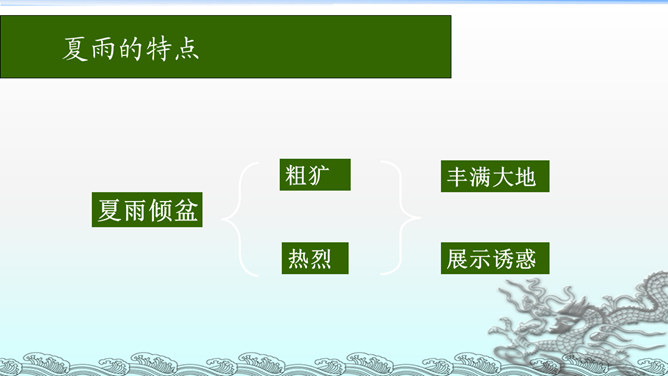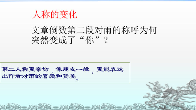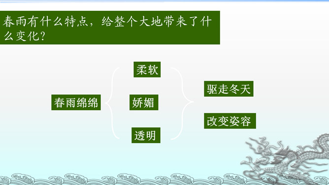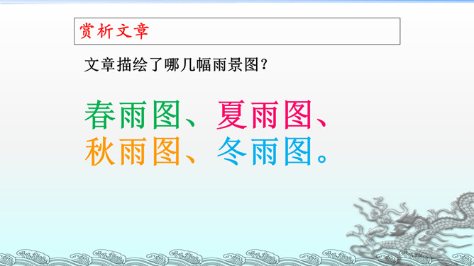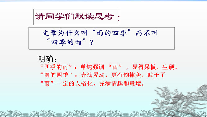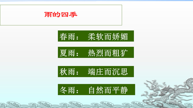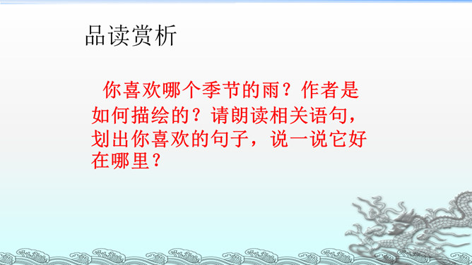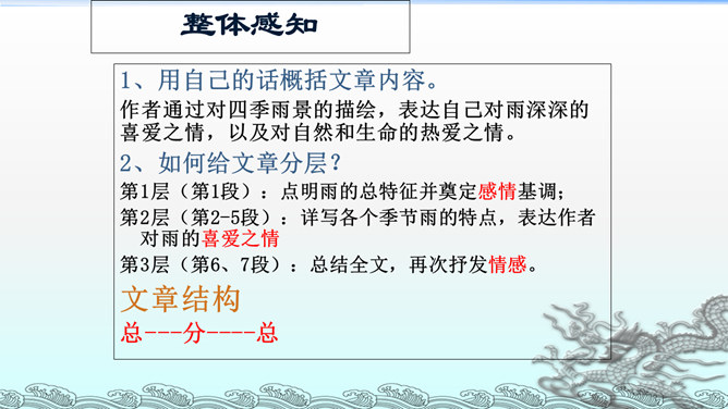 1、用自己的话概括文章内容。作者通过对四季雨景的描绘,表达自己对雨深深的喜爱之情,以及对自然和生命的热爱之情。2、如何给文章分层?第1层(第1段):点明雨的总特征并奠定感情基调;第2层(第2-5段):详写各个季节雨的特点,表达作者对雨的喜爱之情第3层(第6、7段):总结全文,再次抒发情感。你喜欢哪个季节的雨?作者是如何描绘的?请朗读相关语句,划出你喜欢的句子,说一说它好在哪里?所属专题:雨的四季ppt。