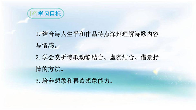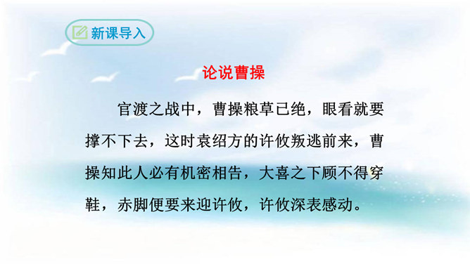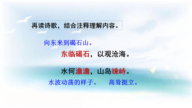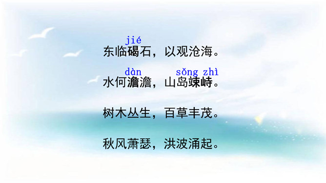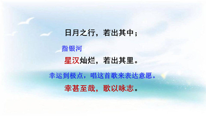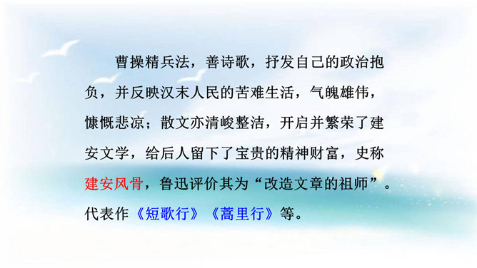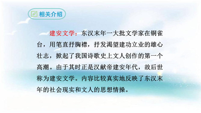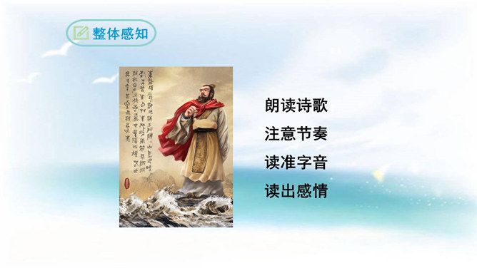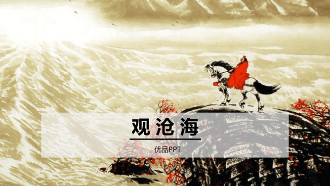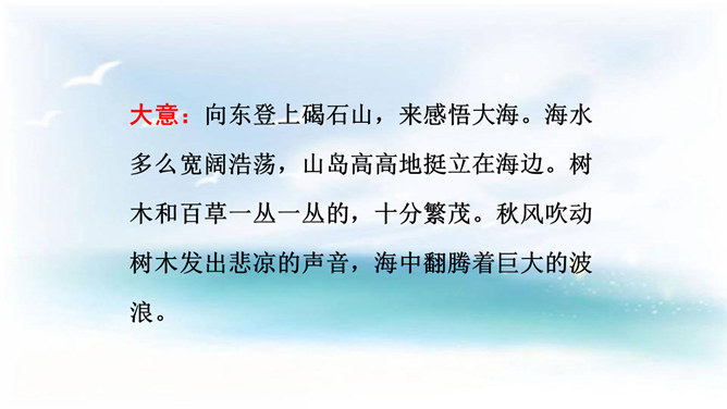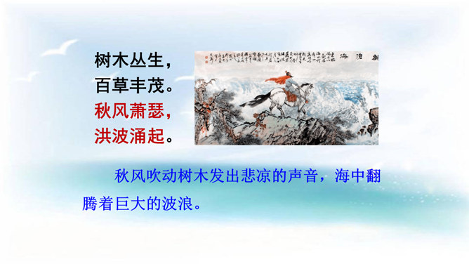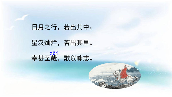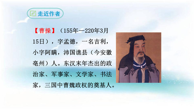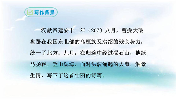本诗借景抒情,诗人以洗练的笔法,神奇的想象,描绘了大海吞吐日月,包蕴万千的壮丽景象,表现了诗人开阔的胸襟,抒发了诗人统一中国建功立业的远大抱负。1.结合诗人生平和作品特点深刻理解诗歌内容与情感。2.学会赏析诗歌动静结合、虚实结合、借景抒情的方法。3.培养想象和再造想象能力。曹操精兵法,善诗歌,抒发自己的政治抱负,并反映汉末人民的苦难生活,气魄雄伟,慷慨悲凉;散文亦清峻整洁,开启并繁荣了建安文学。所属专题:观沧海ppt。