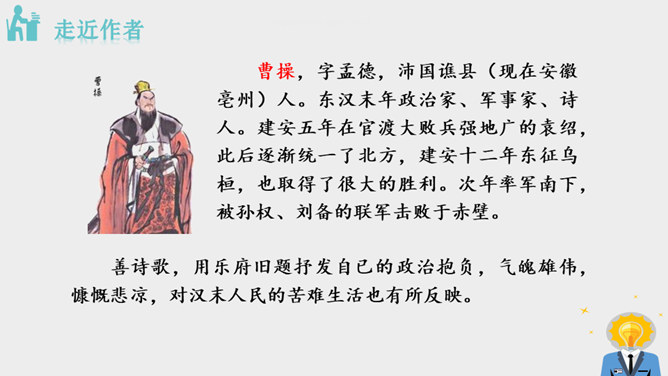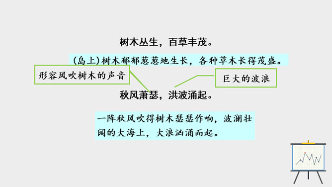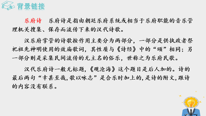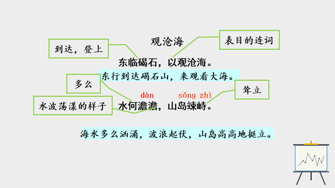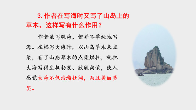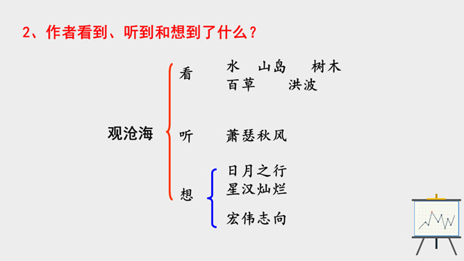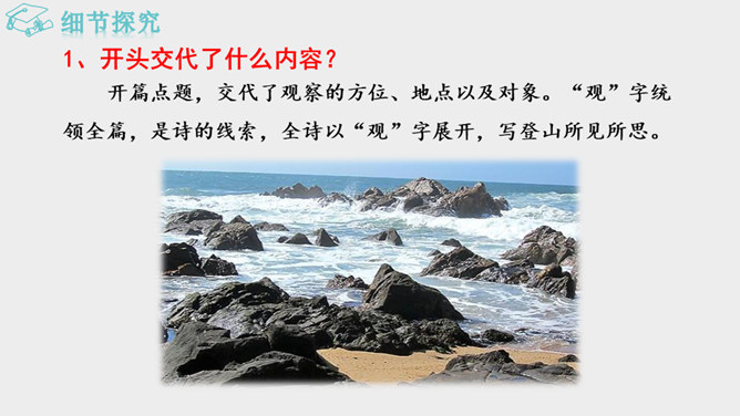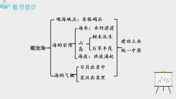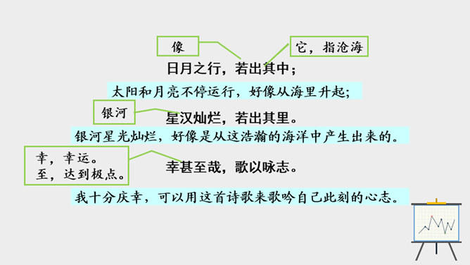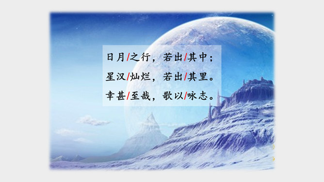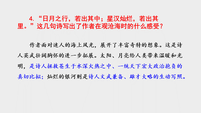 作者面对迷人的海上风光,展开了丰富奇特的想象。这是诗人英武壮阔胸怀的进一步拓展。太阳、月亮给人类带来温暖和光明,是诗人拯救苍生于水深火热之中、一统天下宏大政治抱负的真切比拟;灿烂的银河则是诗人文武兼备、雄才大略的生动写照。“诗言志”,诗人写沧海,抒发统一中国、建功立业的抱负。而这种情感在诗中没有直接表露,而是蕴含在对景物的描写当中。全诗意境开阔、气势雄浑,字里行间洋溢着饱满的激情。所属专题:观沧海ppt。